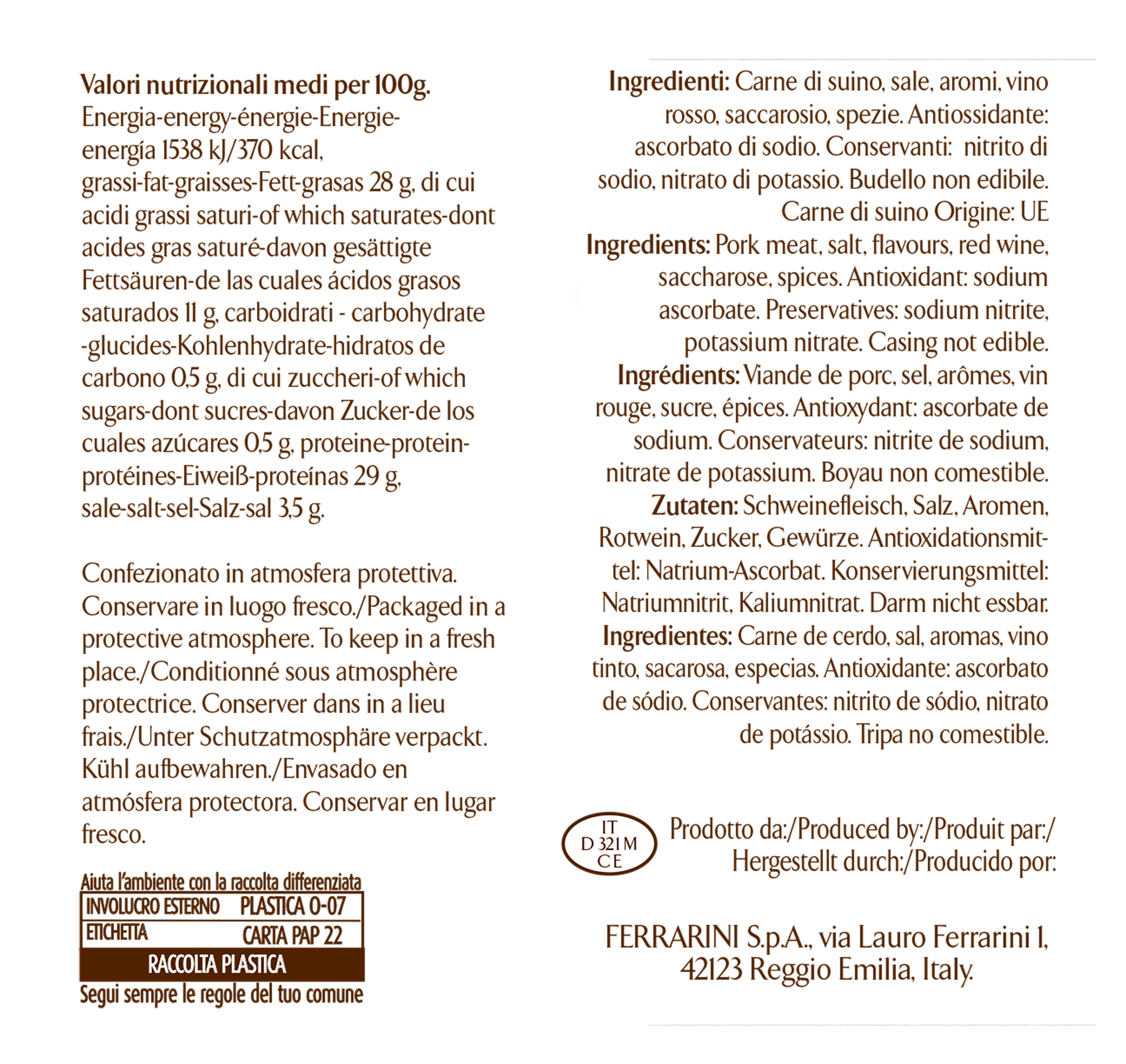 Il salame Emilia Ferrarini è un prodotto lavorato in Italia e noto per il suo gusto unico e la sua consistenza morbida e succulenta. La preparazione del salame Emilia Ferrarini segue una tradizione artigianale e la stagionatura avviene in modo lento, con una particolare attenzione alla giusta quantità di spezie e aromi, che conferisce al salame il suo caratteristico sapore intenso e persistente. Il salame Emilia Ferrarini, dalla stagionatura di almeno 4 settimane, è perfetto da gustare da solo come antipasto, oppure come ingrediente per creare sfiziosi piatti di pasta, riso o insalate. La storia del salame Emilia Ferrarini ha radici profonde nella tradizione gastronomica dell'Emilia Romagna, una regione italiana famosa in tutto il mondo per la sua cultura del cibo e del vino. Ogni fetta di salame Emilia Ferrarini è una vera prelibatezza, da gustare con calma per assaporare appieno il suo sapore intenso e la sua consistenza morbida.