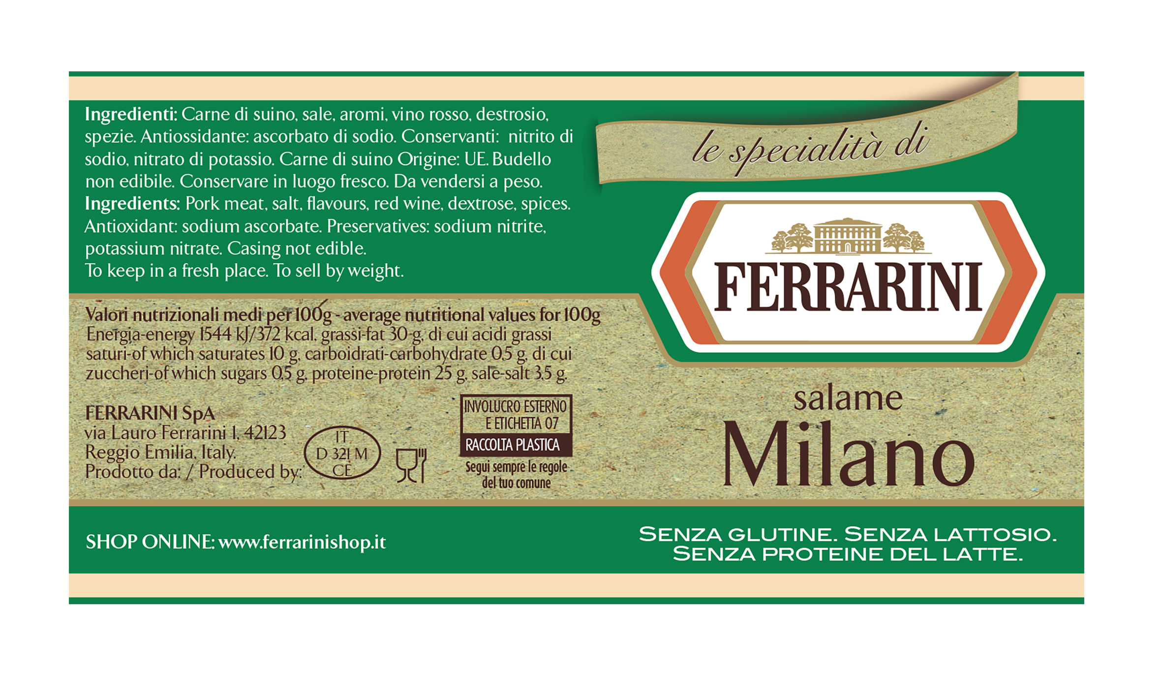 Il salame Milano Ferrarini è un prodotto lavorato in Italia e noto per la sua tipica grana molto fine. La preparazione del salame Milano Ferrarini segue la tradizione e avviene in modo artigianale; la lavorazione sapiente delle carni suine attentamente scelte di provenienza UE e la stagionatura consentono di ottenere un salame Milano speciale, che stupirà per gusto e sfiziosità. Il salame Milano Ferrarini, dalla stagionatura di almeno 5 settimane, è perfetto da gustare da solo come antipasto, tagliato sottilissimo, anche per farcire panini e sandwich gourmet. Il Salame Milano è uno dei salumi più rinomati della tradizione italiana, amato per il suo sapore unico e la sua consistenza molto morbida. Originario della provincia della città omonima, da cui appunto prende il nome, le origini di questo tipo di salame risalgono al 1870; uno dei suoi tratti caratteristici è la macinazione a grana fine, con le parti di grasso e magro uniformemente distribuite. Nell'aspetto, potrebbe ingannare somigliando al salame ungherese, ma si differenzia nettamente da quest'ultimo per il gusto più dolce e l'assenza di aroma d'affumicato.