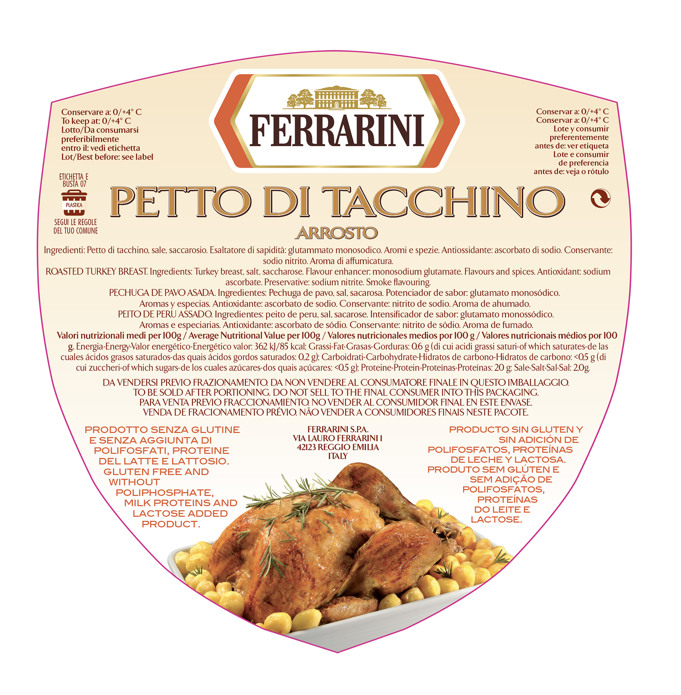 Petto di tacchino Ferrarini realizzato con tagli di carne bianca magra sapientemente cotte al vapore e poi insaporite mediante una speciale cottura arrosto al forno. Il taglio di questo salume di petto di tacchino, che varia dai 4 ai 5 kg, è ideale per la ristorazione, gastronomie e negozi tipici di specialità alimentari. Per una grande praticità d'uso e di conservazione, il petto di tacchino arrosto Ferrarini è contenuto in una busta in alluminio sottovuoto. Questo affettato unisce la voglia di sapore e di gusto con la crescente attenzione da parte dei consumatori odierni verso un'alimentazione a ridotto contenuto di grassi.