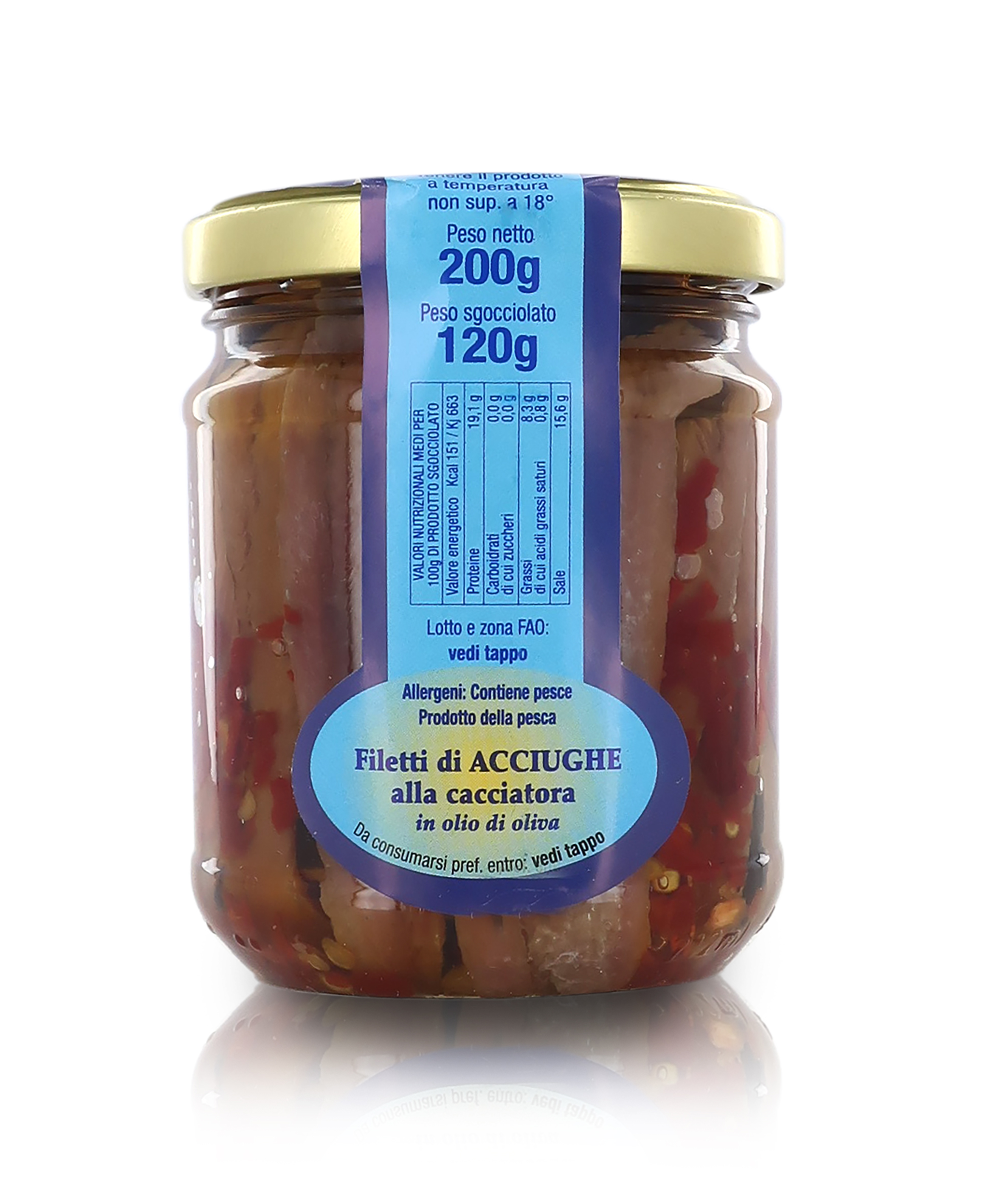 Filetti d'ACCIUGHE alla cacciatora in olio d'oliva (vasetto di vetro da 200g, peso netto sgocciolato: 120g). Queste saporite ACCIUGHE si arricchiscono di PEPERONCINO e capperi, per una esplosione di sapore mediterraneo. Ottime per un aperitivo ricco di gusto e di sicilianità.