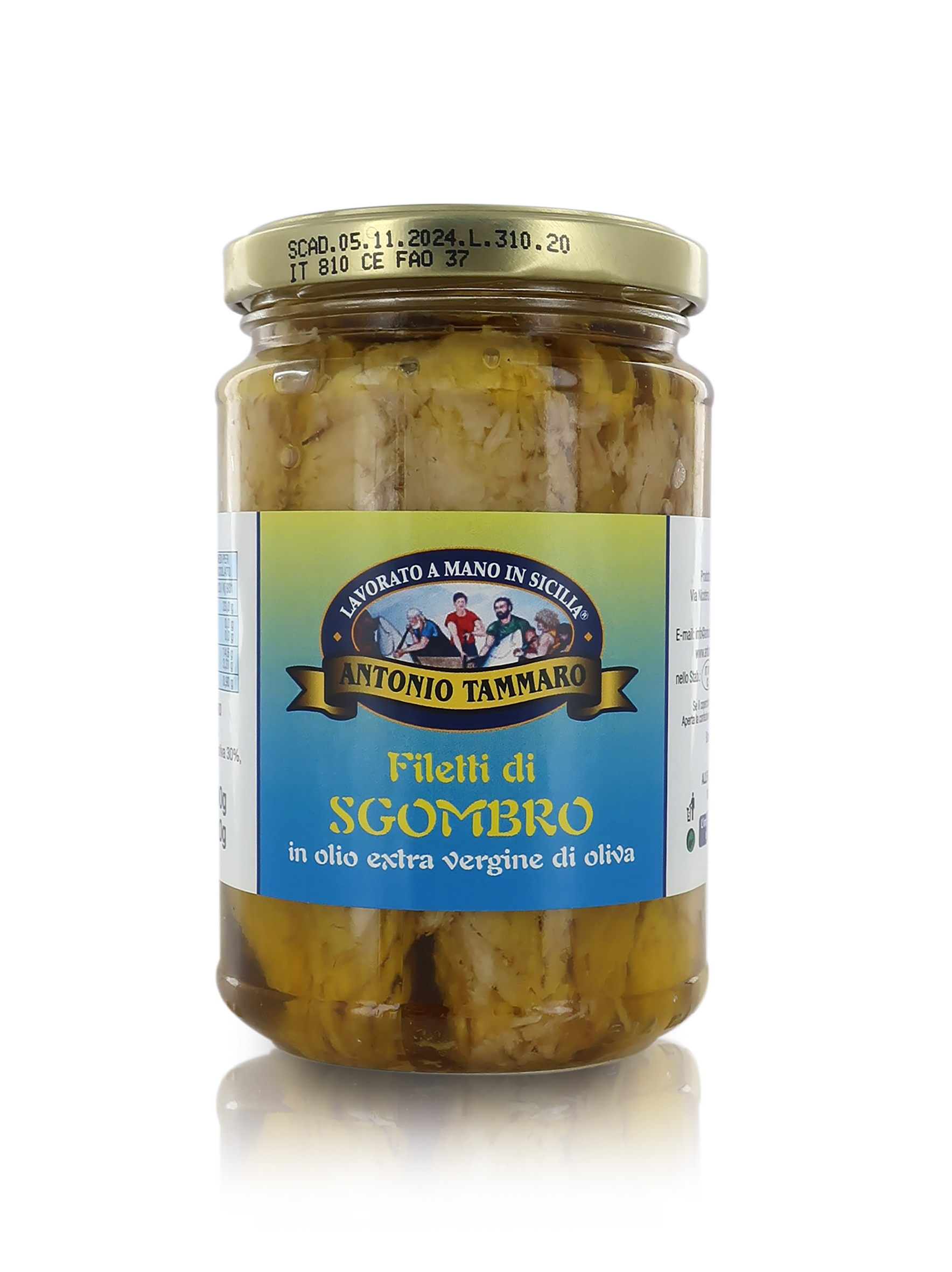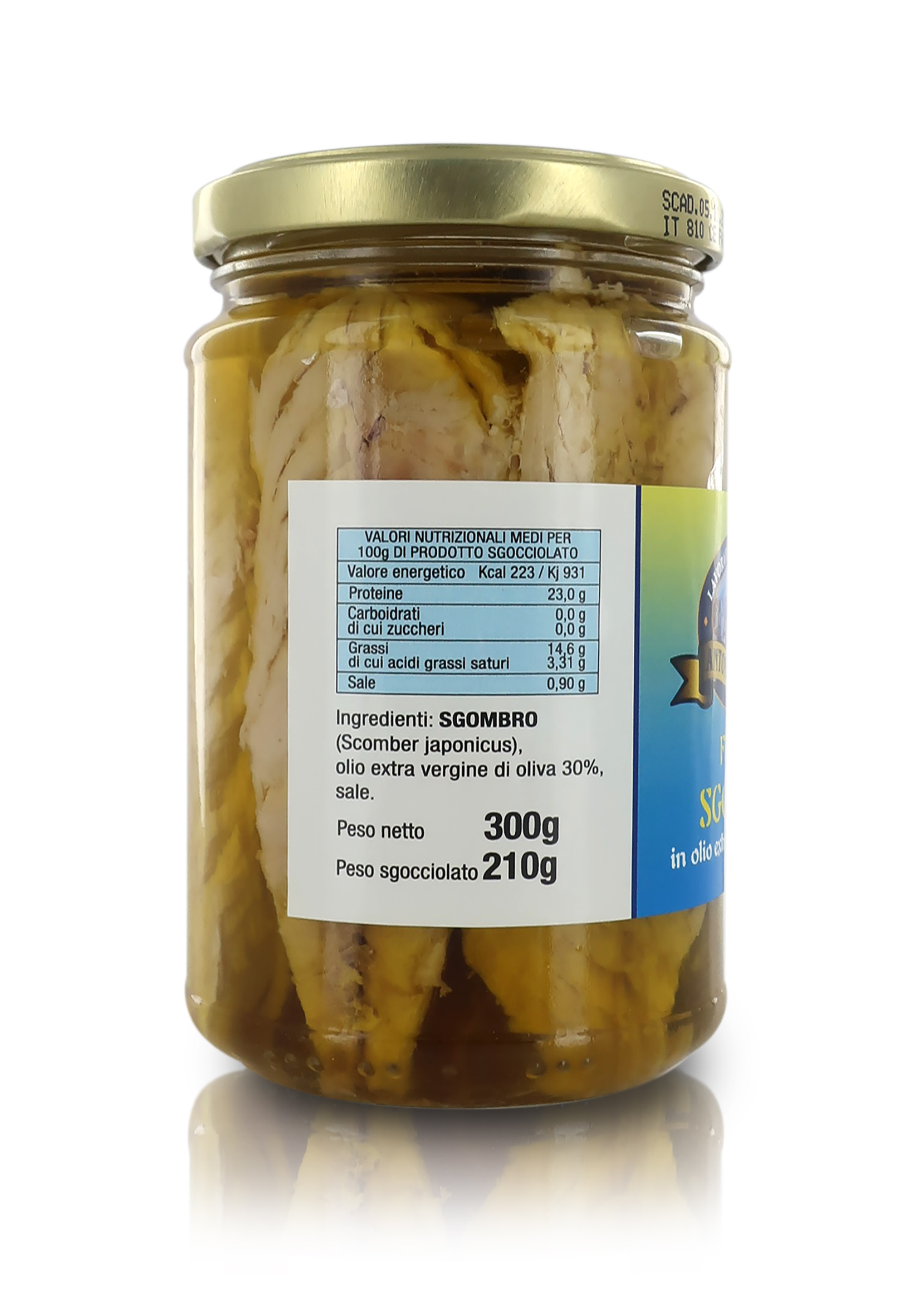 Ingredienti: filetti di SGOMBRO, olio d'oliva, sale marino. Riporre in frigo dopo l’uso e consumare entro 1/3 giorni.