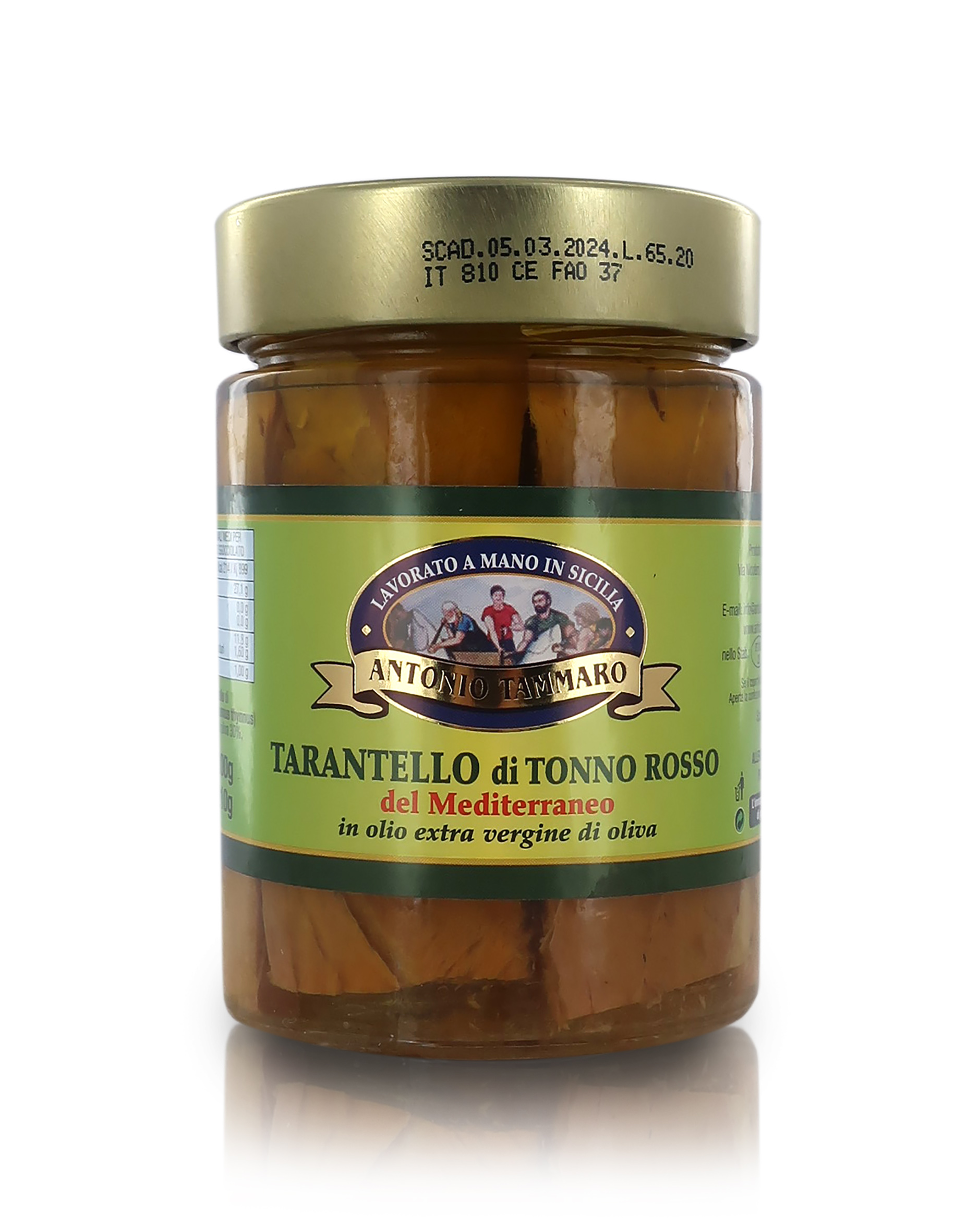 Filetti di pregiato tarantello di tonno rosso del Mediterraneo sott'olio, in vasetto da 300g.
