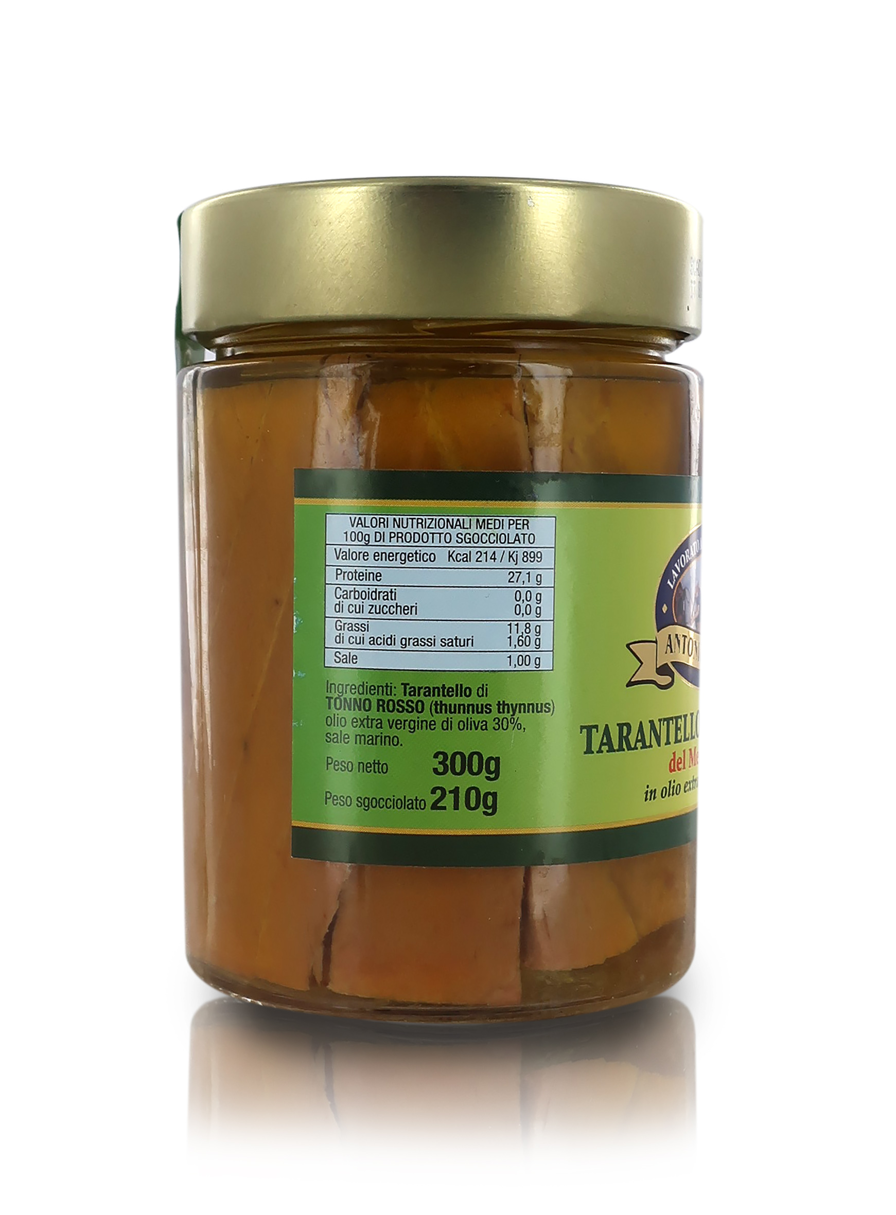 Filetti Di Tarantello Di Tonno Rosso Del Mediterraneo, In Olio Extravergine D'Oliva, Vasetto Di Vetro Da 300 Grammi