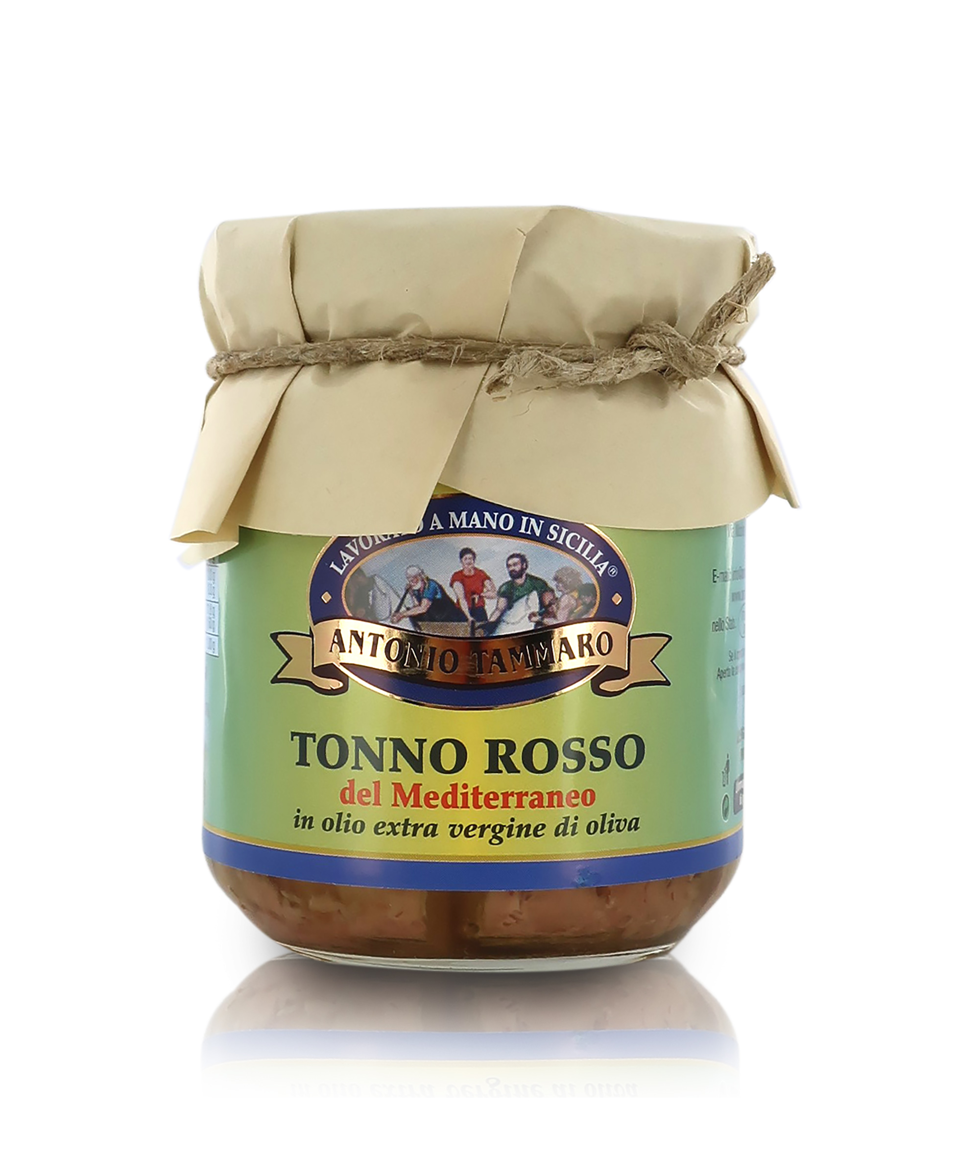 Il TONNO rosso è da sempre la punta di diamante dell'Antica Tonnara di Favignana, premiato dalla rivista Gambero Rosso come miglior TONNO sott'olio d'Italia. Questo TONNO rosso è un prodotto derivato unicamente da pesce fresco pescato tra maggio e giugno. Il pescato, giunto nello stabilimento in giornata, viene tagliato e lasciato in acqua ghiacciata per favorire il dissanguamento e la chiusura delle fibre, per poi passare alle vasche di cottura forate in acciaio per la cottura al vapore e, successivamente, alle celle termicamente controllate e ventilate, che favoriscono la perfetta asciugatura del tonno. Il TONNO cotto passa alle mani sapienti degli operatori del confezionamento, che aggiungono olio extravergine d'oliva cultivar della valle del Belice, molito a freddo da olive Nocellara e Biancolilla, che si sposa benissimo con la qualità eccelsa di questo TONNO.