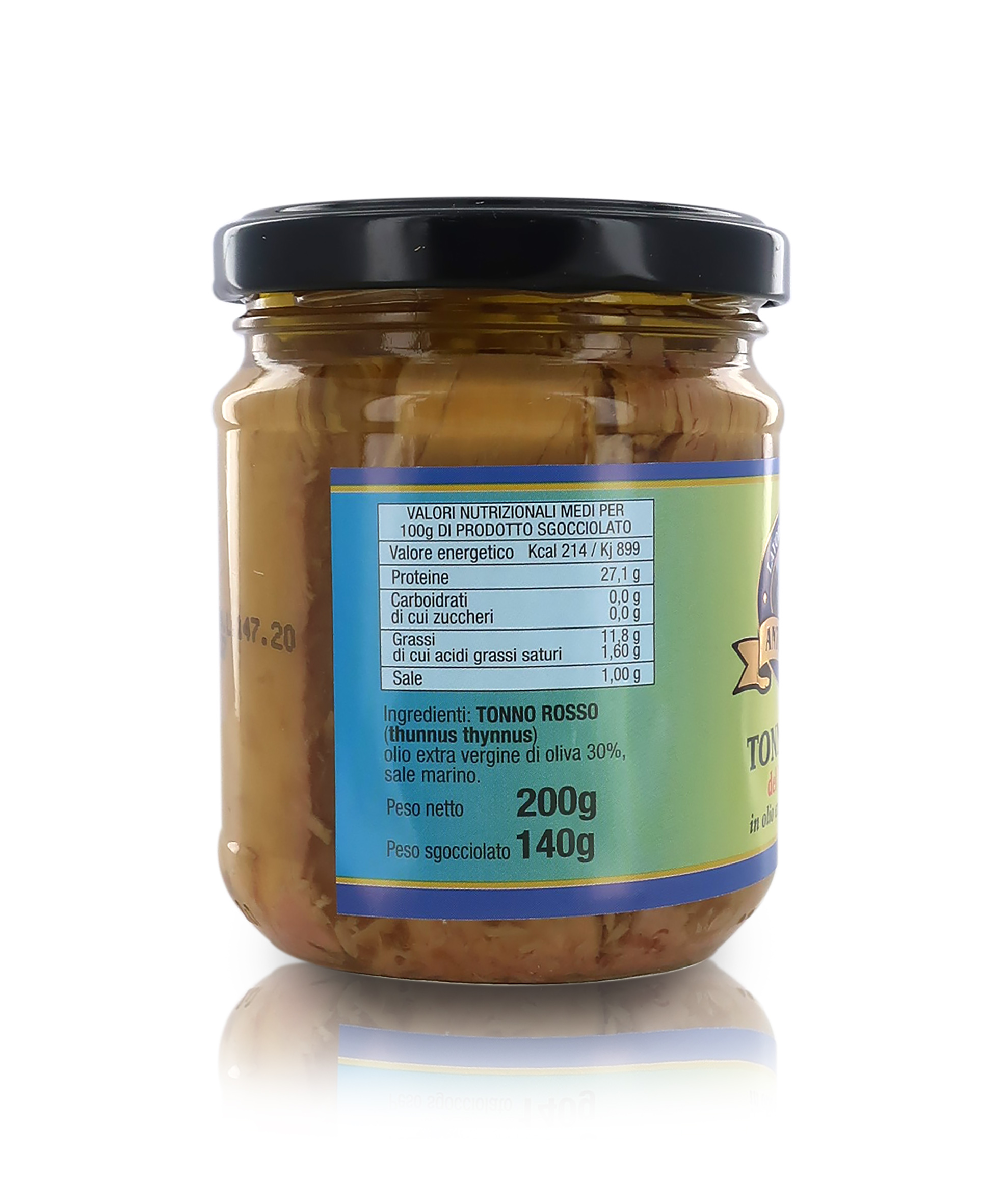 Ingredienti: TONNO rosso del Mediterraneo, olio extravergine di oliva, sale marino. Modo d'uso: ottimo come antipasto o alternativa a un secondo di pesce. Conservazione: riporre in frigo dopo l'apertura.