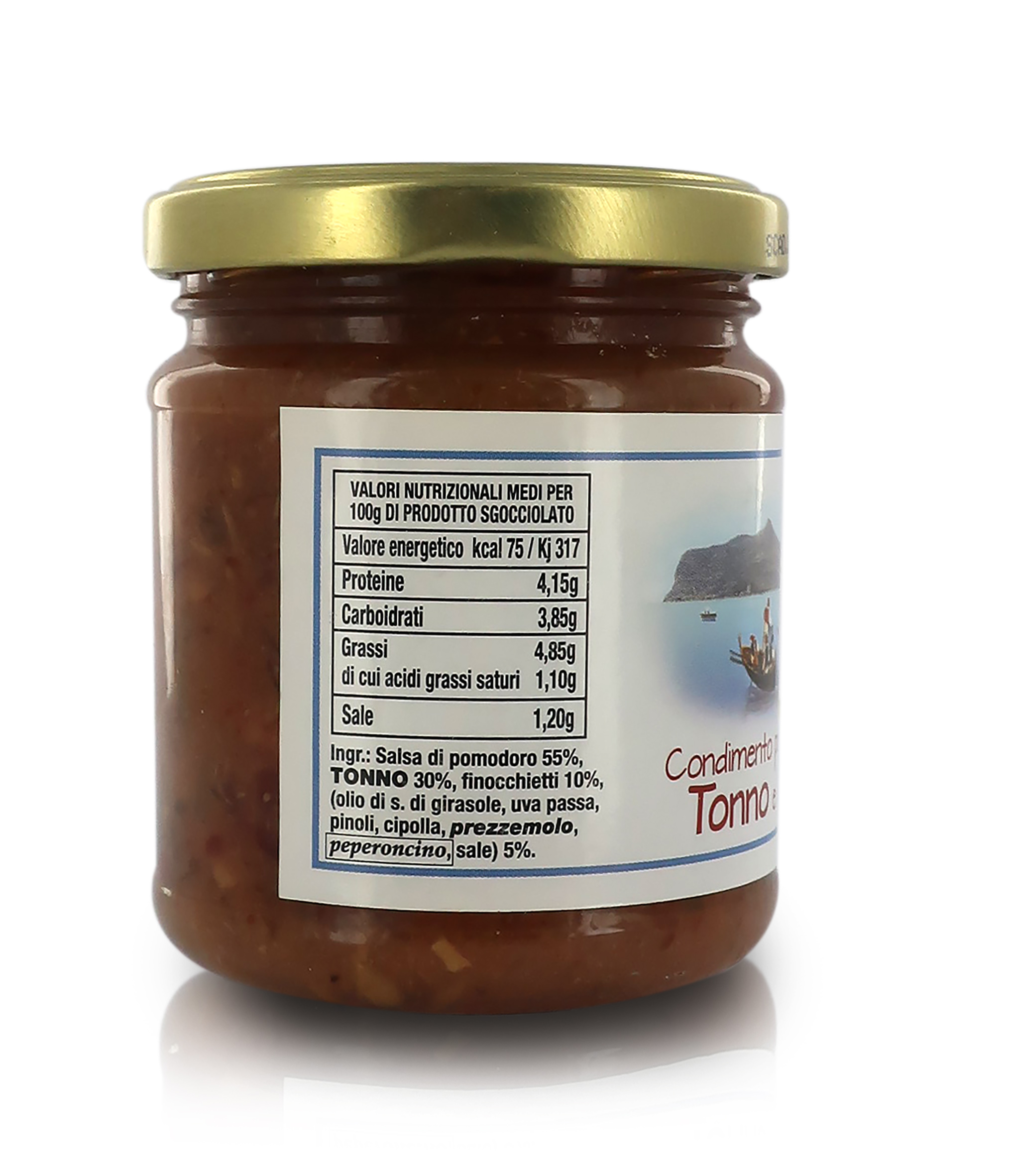 Ingredienti: polpa di pomodoro, TONNO, finocchietto selvatico, uva passa, pinoli, olio d'oliva, sale marino, ACCIUGHE, sale. Riporre in frigo dopo l’apertura del vasetto.