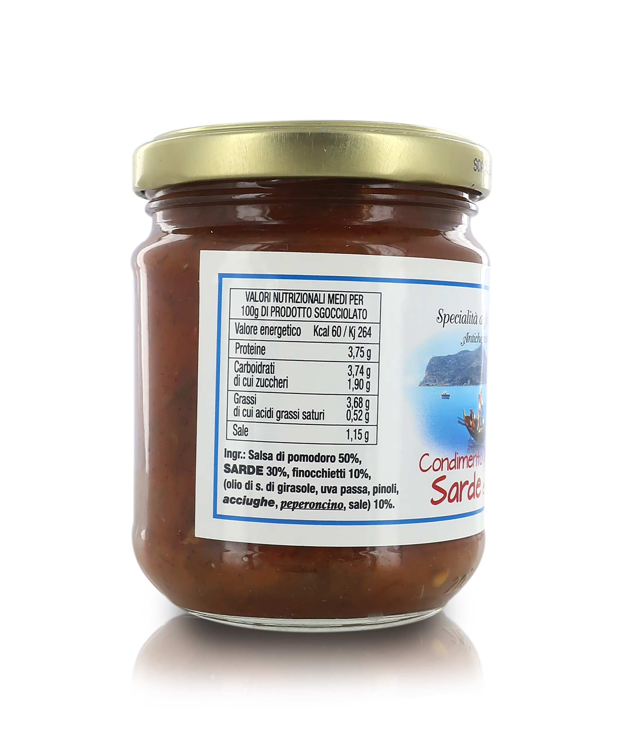 Ingredienti: SARDE, pomodoro, finocchietto selvatico, uva passa, pinoli, olio d'oliva, sale marino, aromi naturali. Riporre in frigo dopo l’apertura del vasetto.
