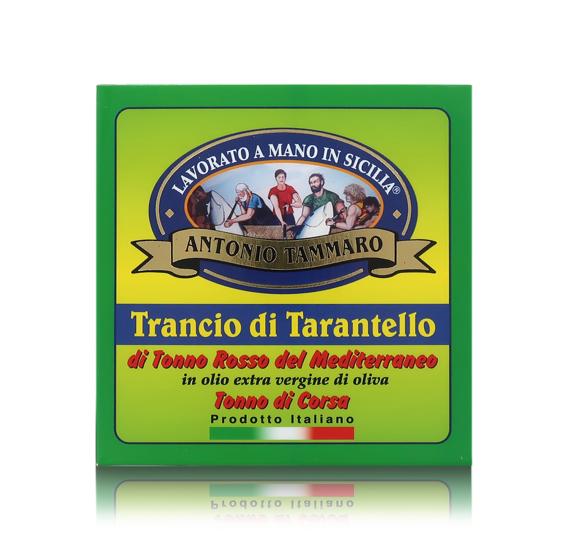Il tarantello di tonno rosso, uno dei tagli più pregiati del pesce, è il filetto sopra la ventresca. Ha una consistenza semi morbida e vanta pochi grassi. Risulta necessaria una certa esperienza per salvaguardare tale filetto e la ventresca; mani poco esperte rischierebbero di rovinare entrambi. Questo taglio "gourmet", dopo essere cotto a vapore e lasciato riposare su teli di lino per 24 ore in un'apposita cella di asciugatura, viene sezionato in filetti più piccoli che vengono collocati in stagionatura per ben 24 mesi dopo esser stati sterilizzati in autoclave. Da ogni TONNO pulito si ottiene solo una quantità di tarantello pari al 4%. Il nome del taglio richiama i suoi scopritori: i pescatori tarantini erano soliti prendersi cura di questo taglio per poi rivenderlo come prodotto pregiato rispetto ai più comuni filetti di TONNO.