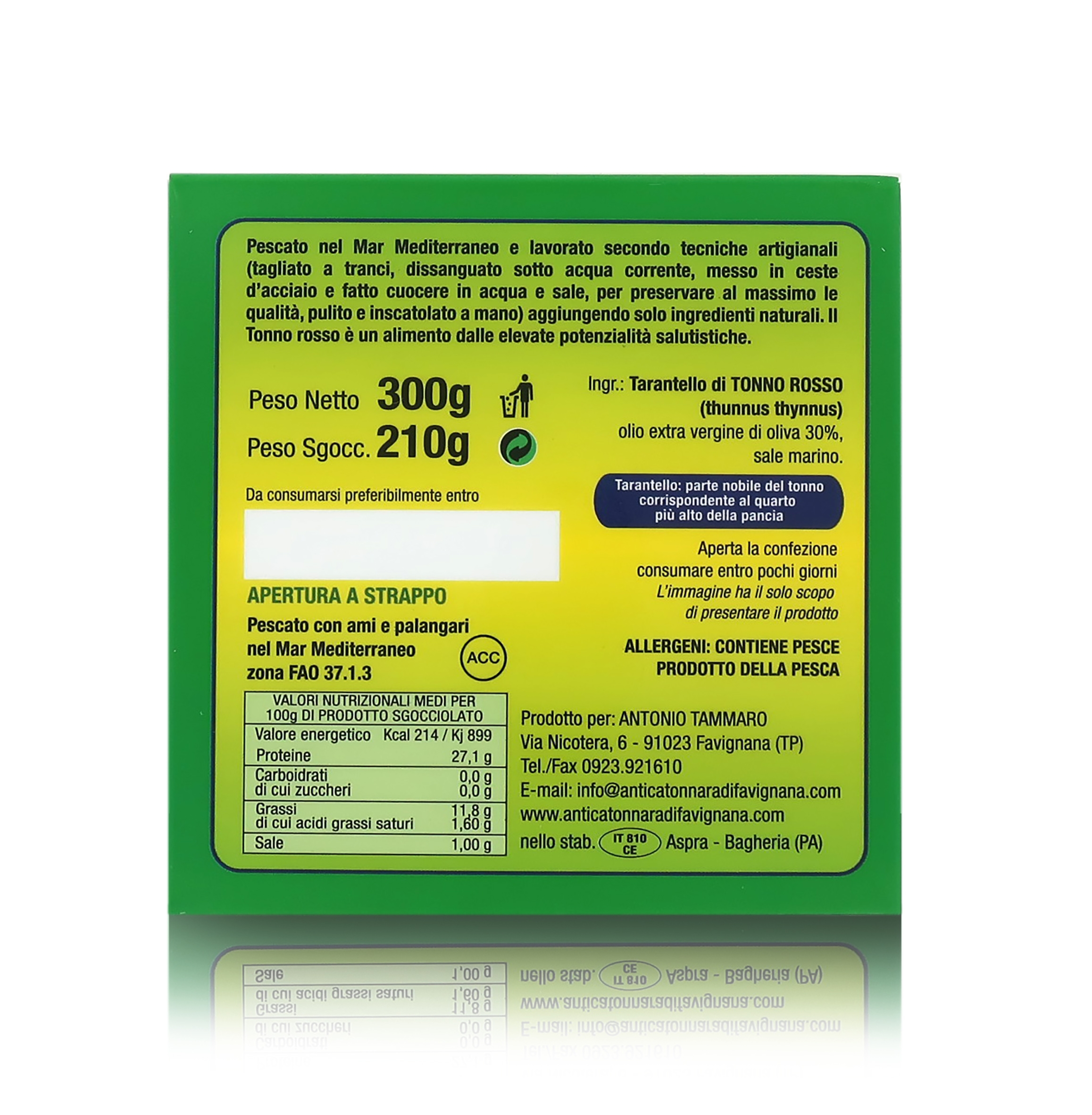 Trancio di pregiato tarantello di tonno rosso del Mediterraneo sott'olio, in confezione di latta a strappo da 300g.