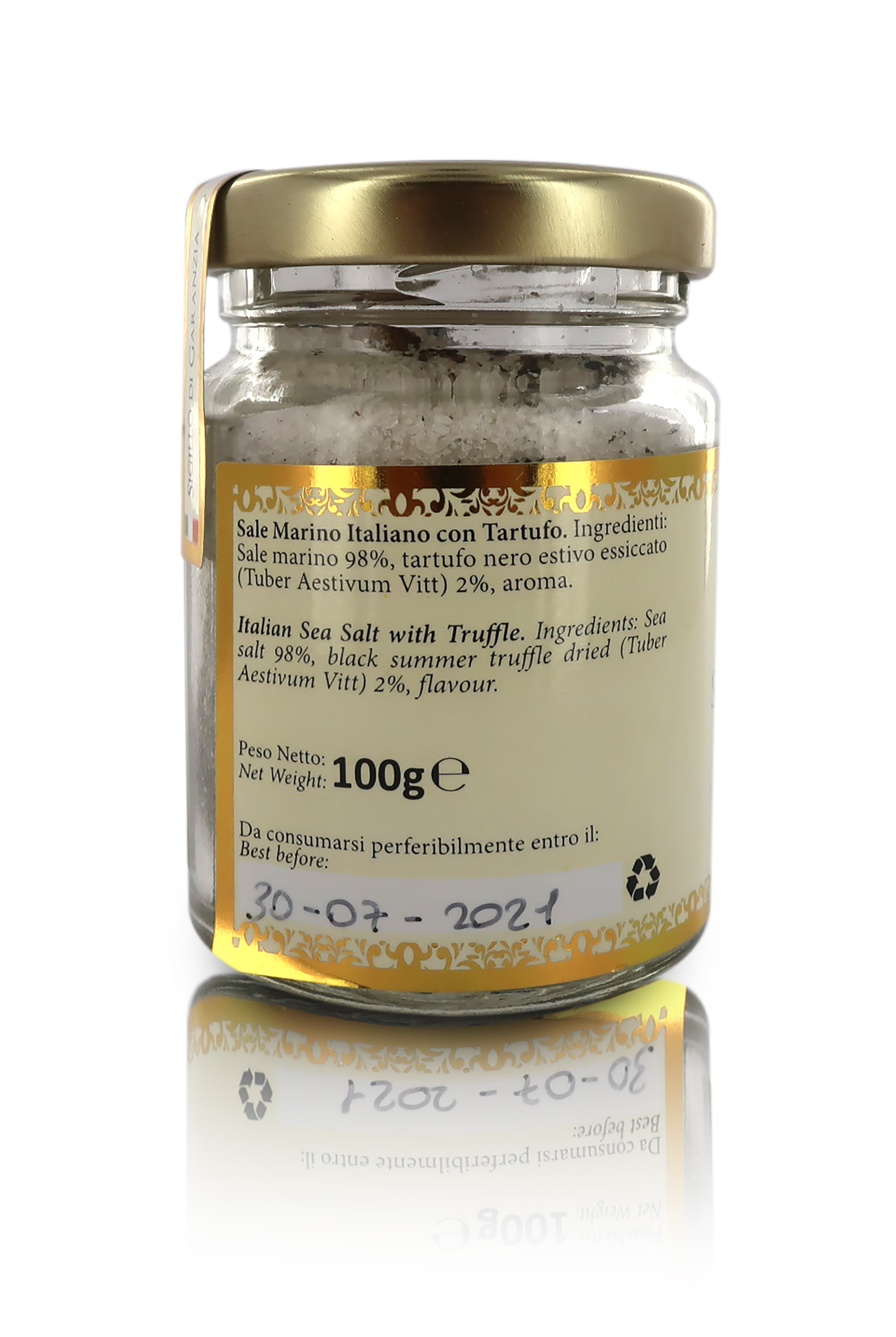 Ingredienti: sale marino 98%, tartufo nero estivo essiccato (Tuber Aestivum Vitt) 2%, aroma.
