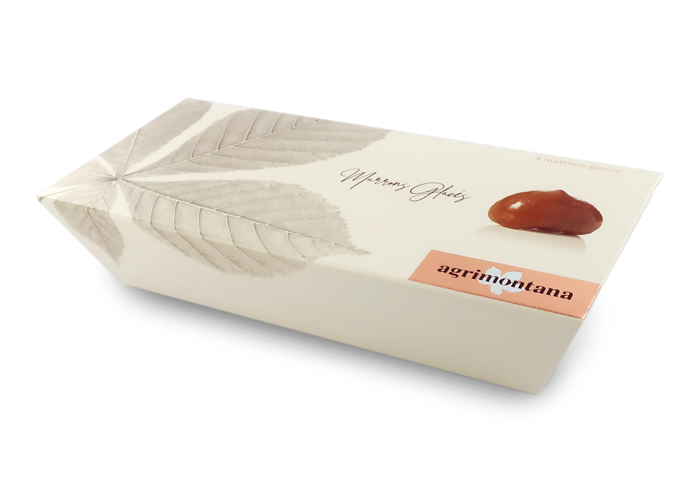 Piccola scatola per degustazione marron glacé, contenente 4 marroni canditi (75g).