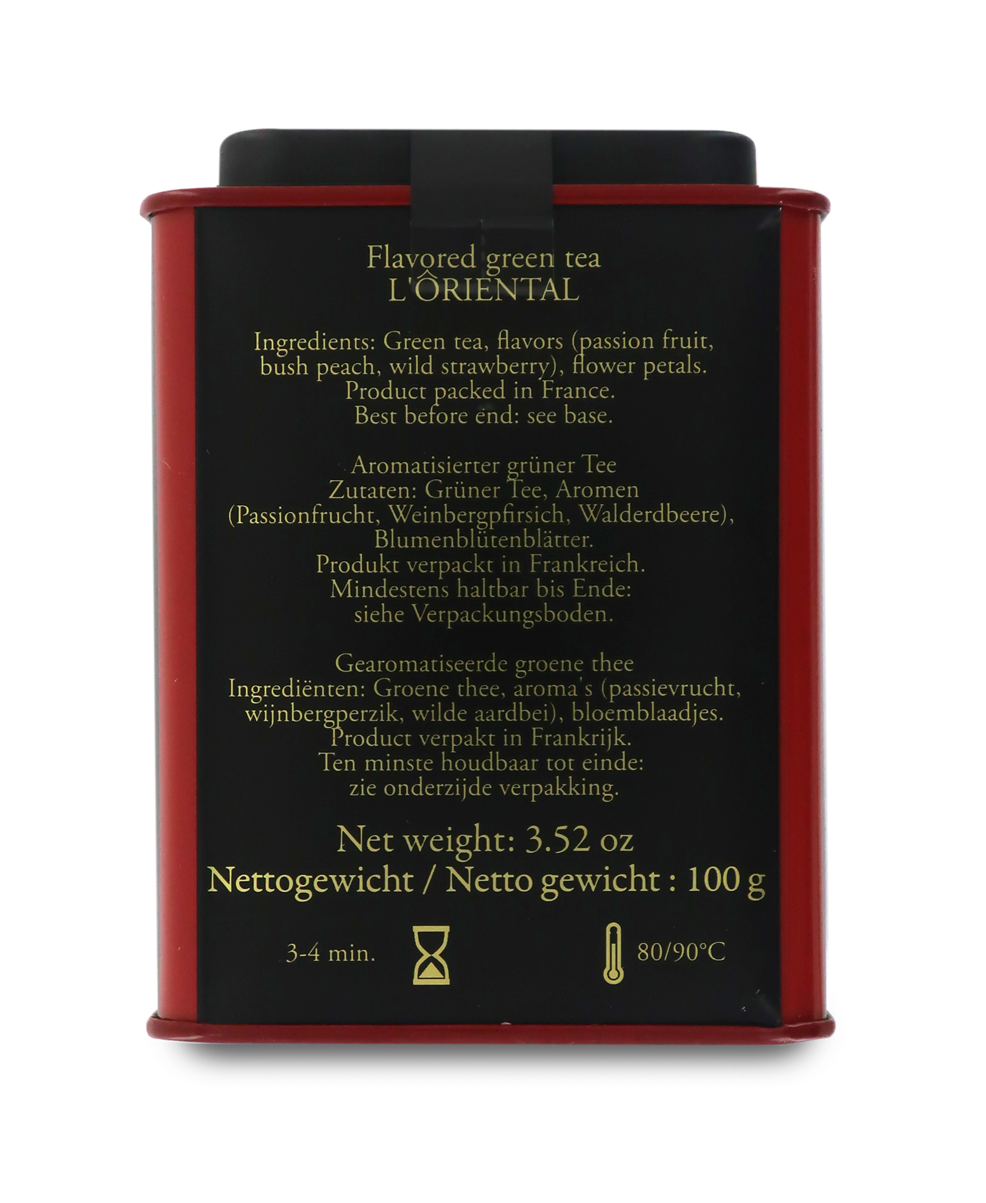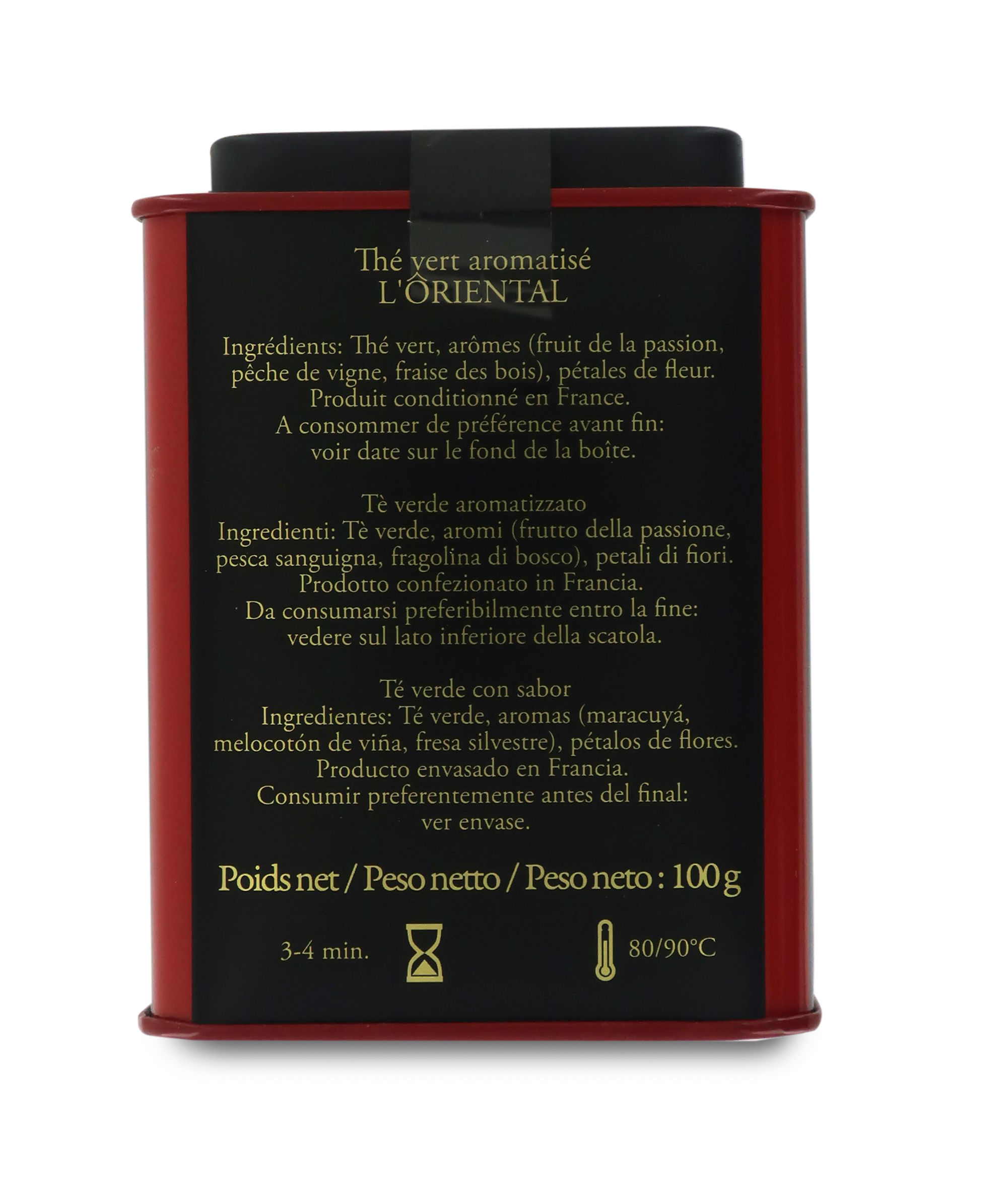 Il tè "L'Ôriental" fonde la freschezza vegetale di un tè verde con gli aromi fruttati di frutto della passione, pesca selvatica e fragoline. Perfetto per chi ama le bevande aromatiche al gusto di frutta tropicale.