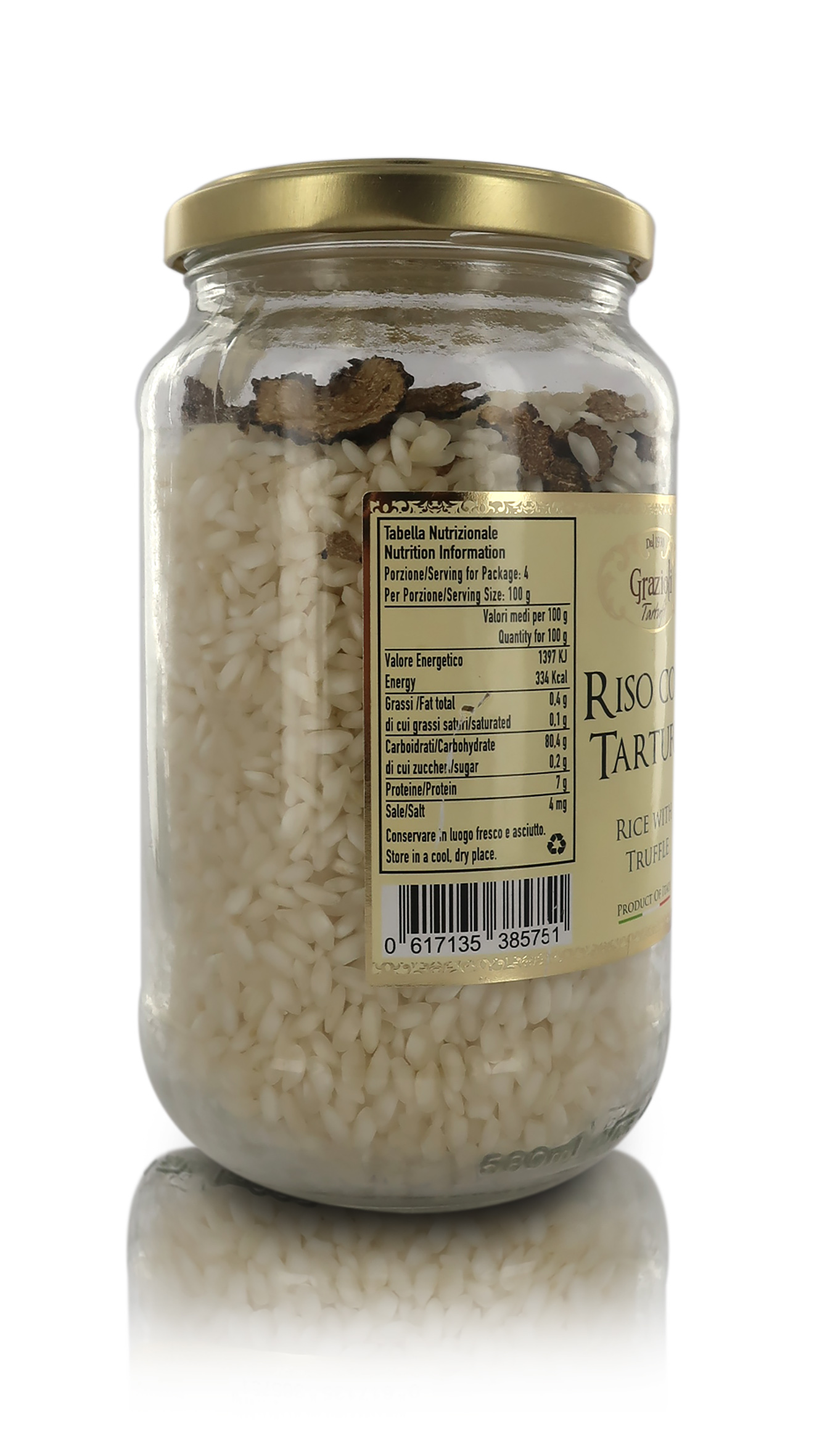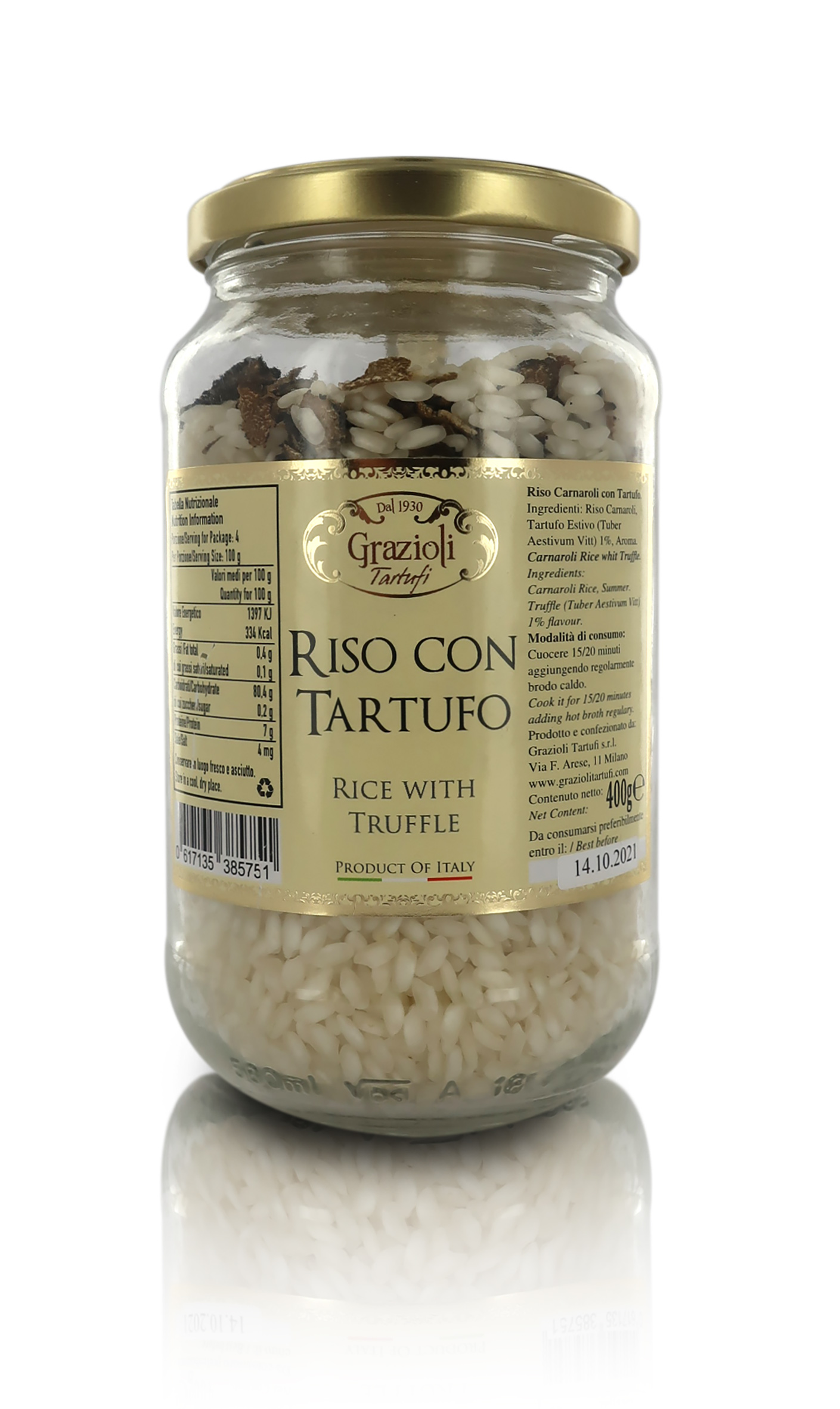 Ingredienti: riso Carnaroli, tartufo estivo (Tuber Aestivum Vitt) 1%, aroma.