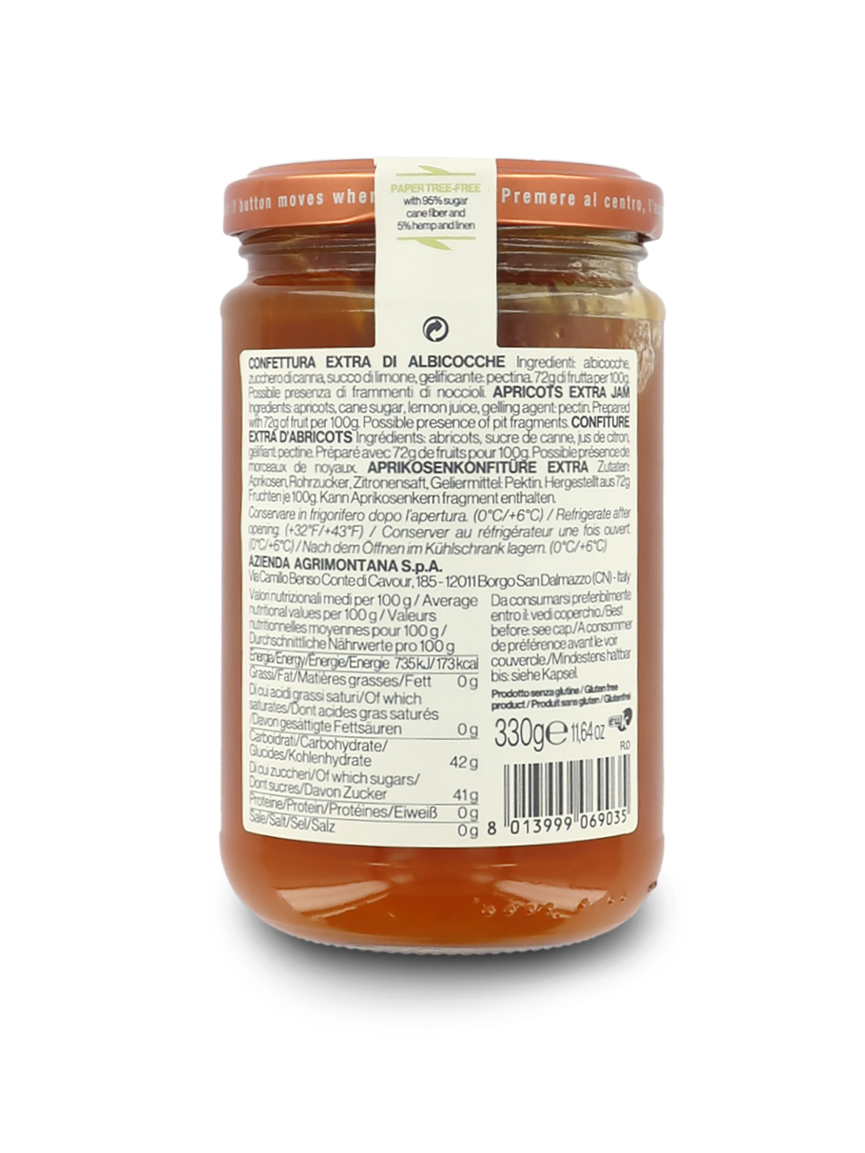 Confettura extra alle albicocche appartenente alla linea "Le Extra", caratterizzata da un contenuto di zucchero inferiore (-30%) rispetto alla ricetta di confetture extra standard Agrimontana.