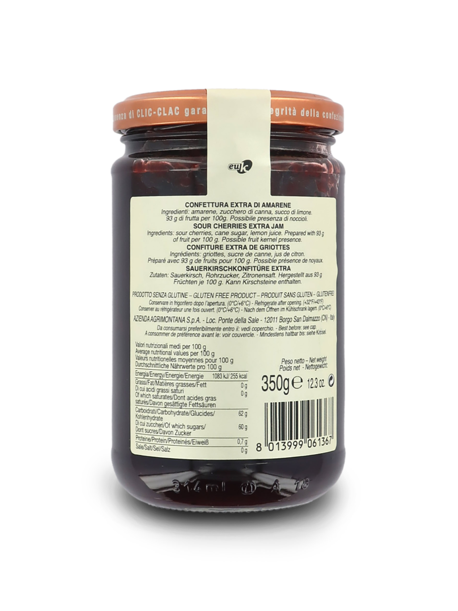 Le confetture extra Agrimontana, senza pectina, sono ad alto tenore di frutta: ne contengono da 70 a 95 grammi per 100 grammi di prodotto (ben oltre il minimo dei 45 grammi previsti dalla legge per la denominazione “Confettura extra”). Lavorate secondo la ricetta tradizionale, le confetture contengono esclusivamente frutta italiana di prima scelta e raccolta al punto giusto di maturazione. Le fasi di preparazione prevedono la cottura della frutta, l'aggiunta dello zucchero di canna e la concentrazione sottovuoto a bassa temperatura. Segue il riempimento a caldo del contenitore e il suo raffreddamento rapido.