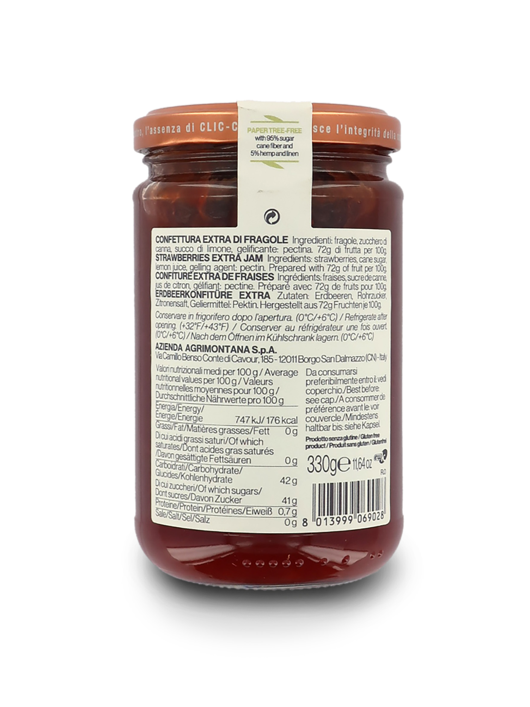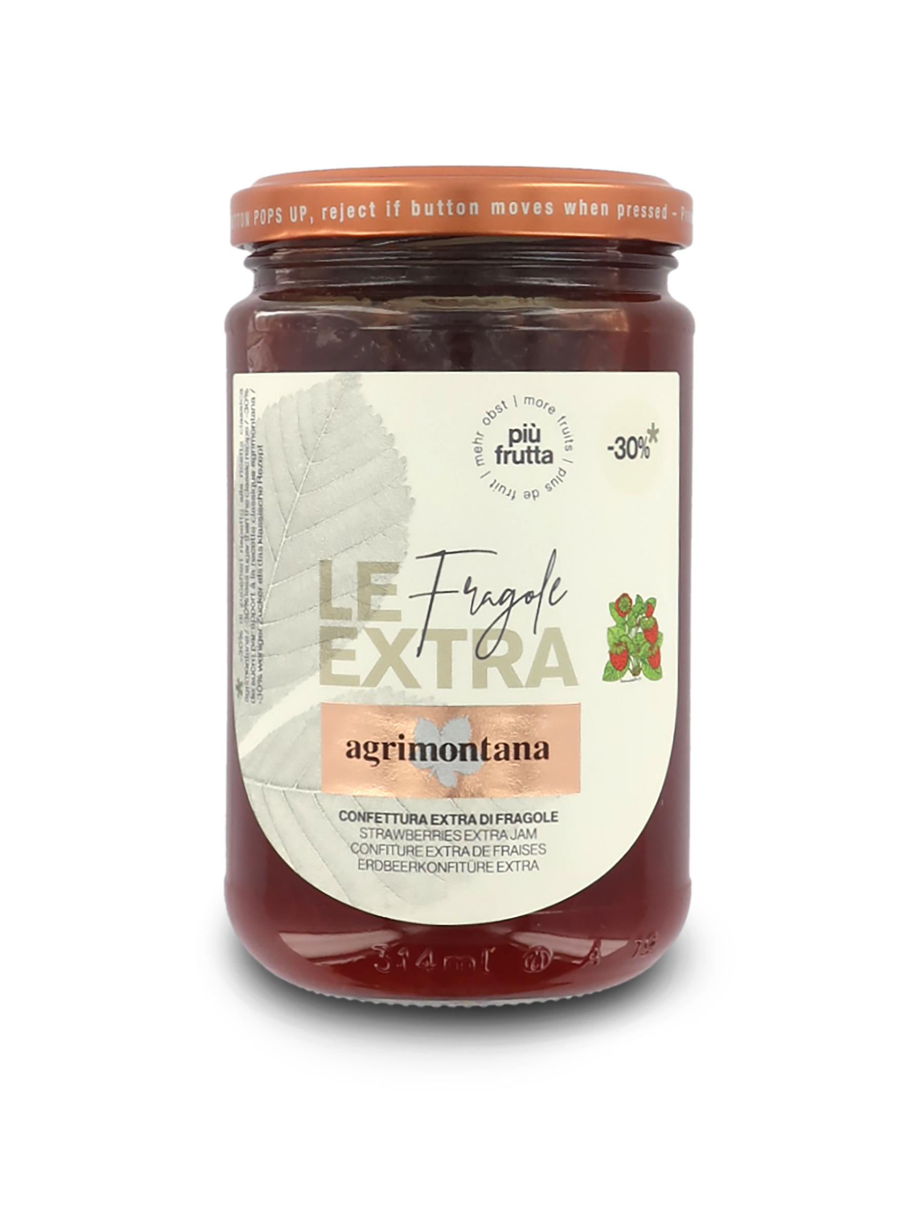 Confettura extra alle fragole appartenente alla linea "Le Extra", caratterizzata da un contenuto di zucchero inferiore (-30%) rispetto alla ricetta di confetture extra standard Agrimontana.