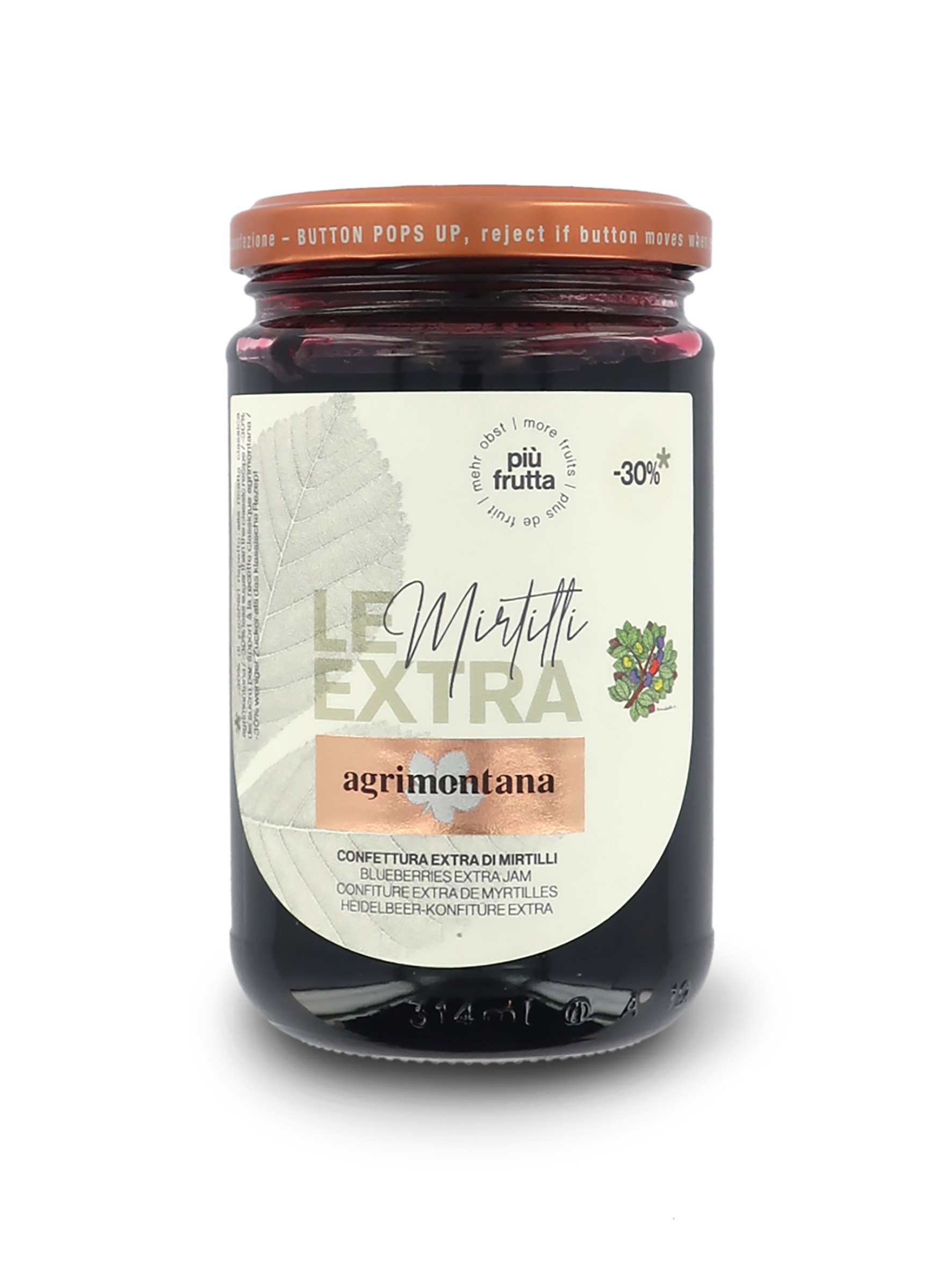 Confettura extra ai mirtilli selvatici appartenente alla linea "Le Extra", caratterizzata da un contenuto di zucchero inferiore (-30%) rispetto alla ricetta di confetture extra standard Agrimontana.