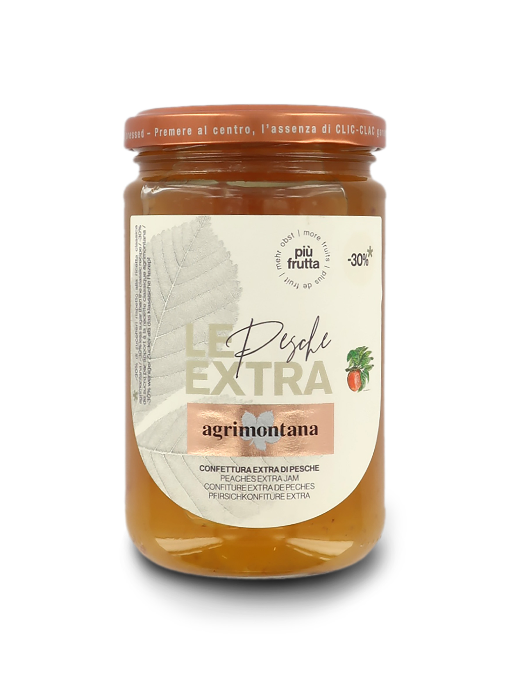 Confettura extra alle pesche appartenente alla linea "Le Extra", caratterizzata da un contenuto di zucchero inferiore (-30%) rispetto alla ricetta di confetture extra standard Agrimontana.
