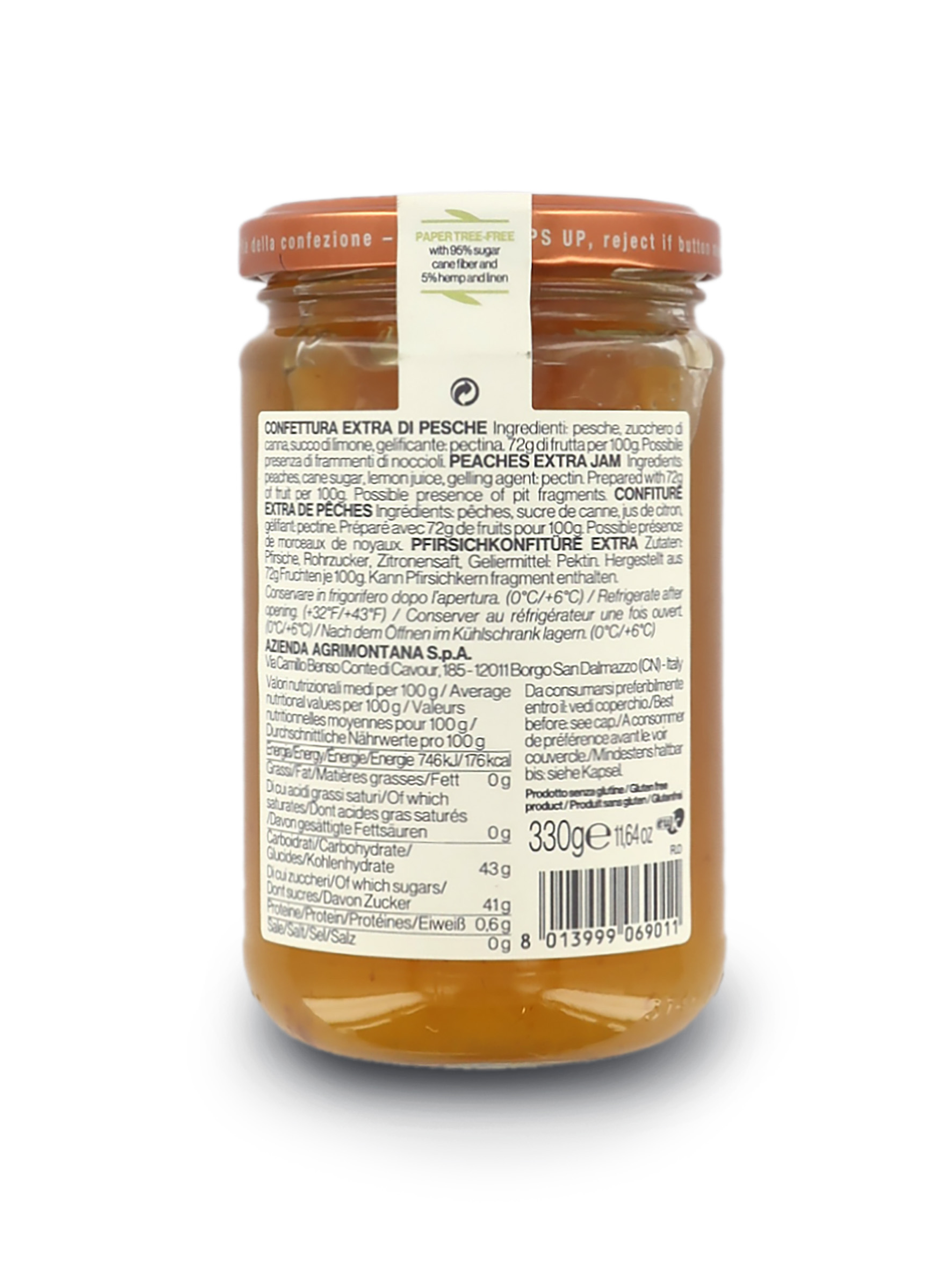 Realizzata con frutta e zucchero di canna, la confettura extra alla pesca è naturalmente priva di glutine.