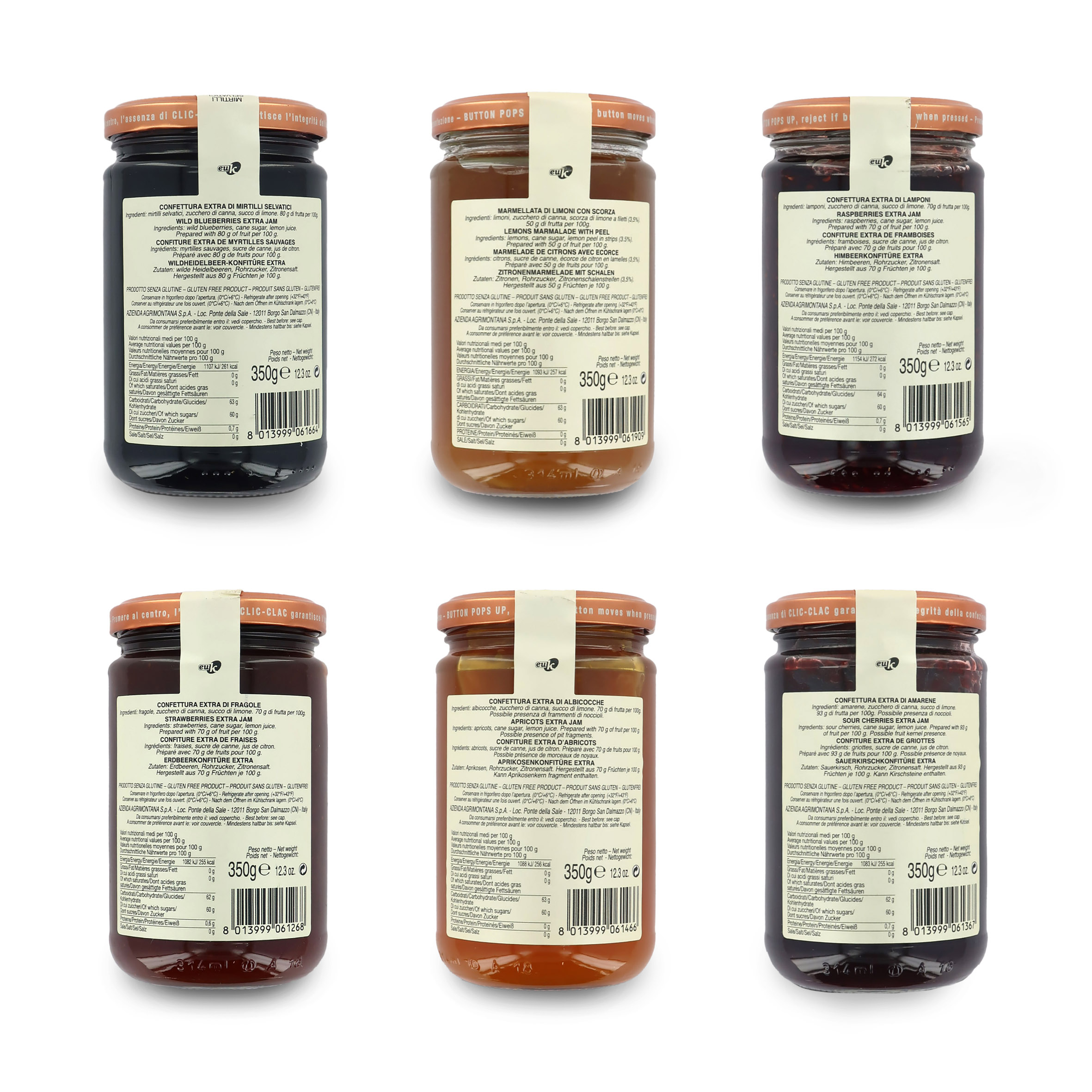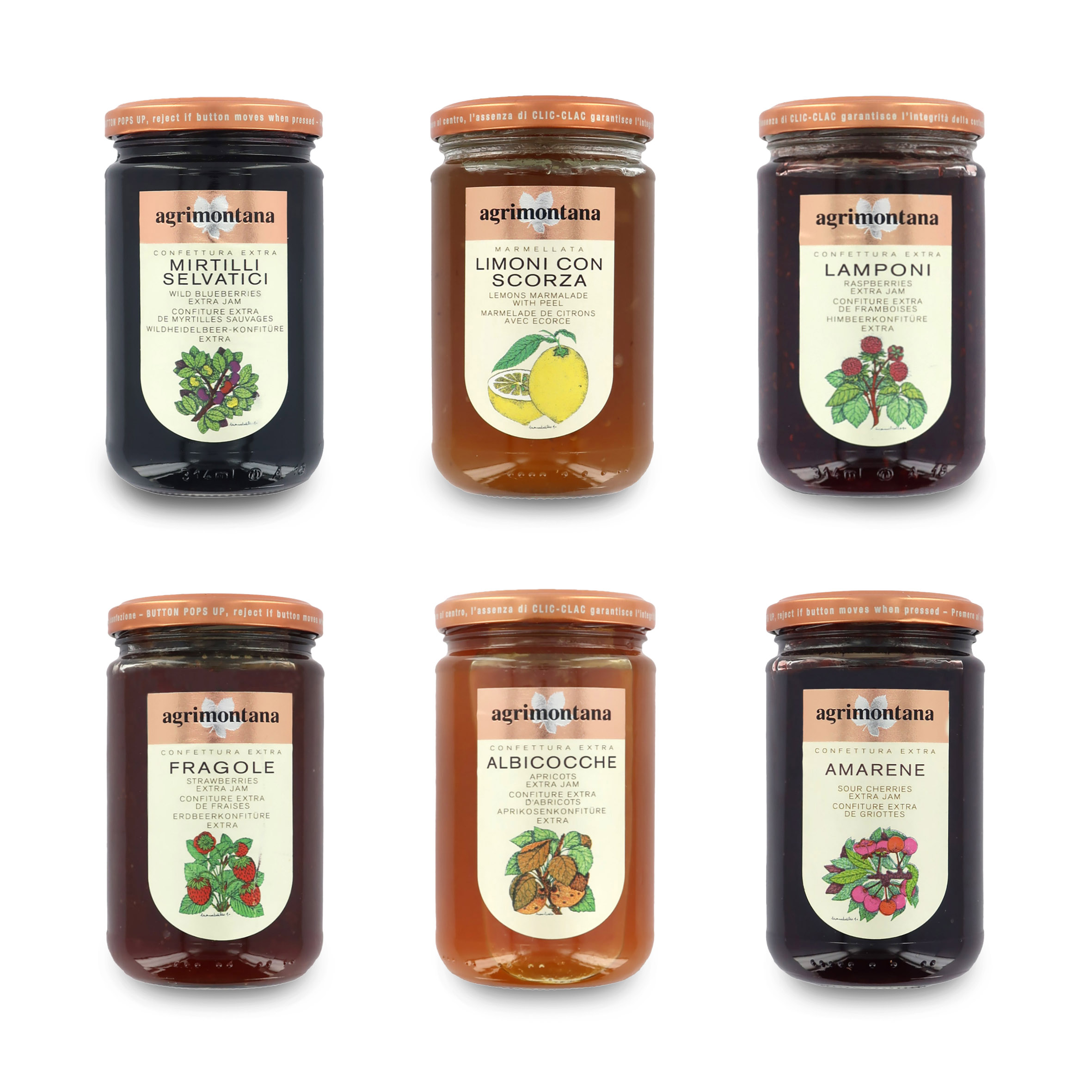 Assortimento di confetture extra Agrimontana, nei gusti: Fragola, Amarena, Lampone, Albicocche, Mirtilli e Limone. Vasetto da 350g.