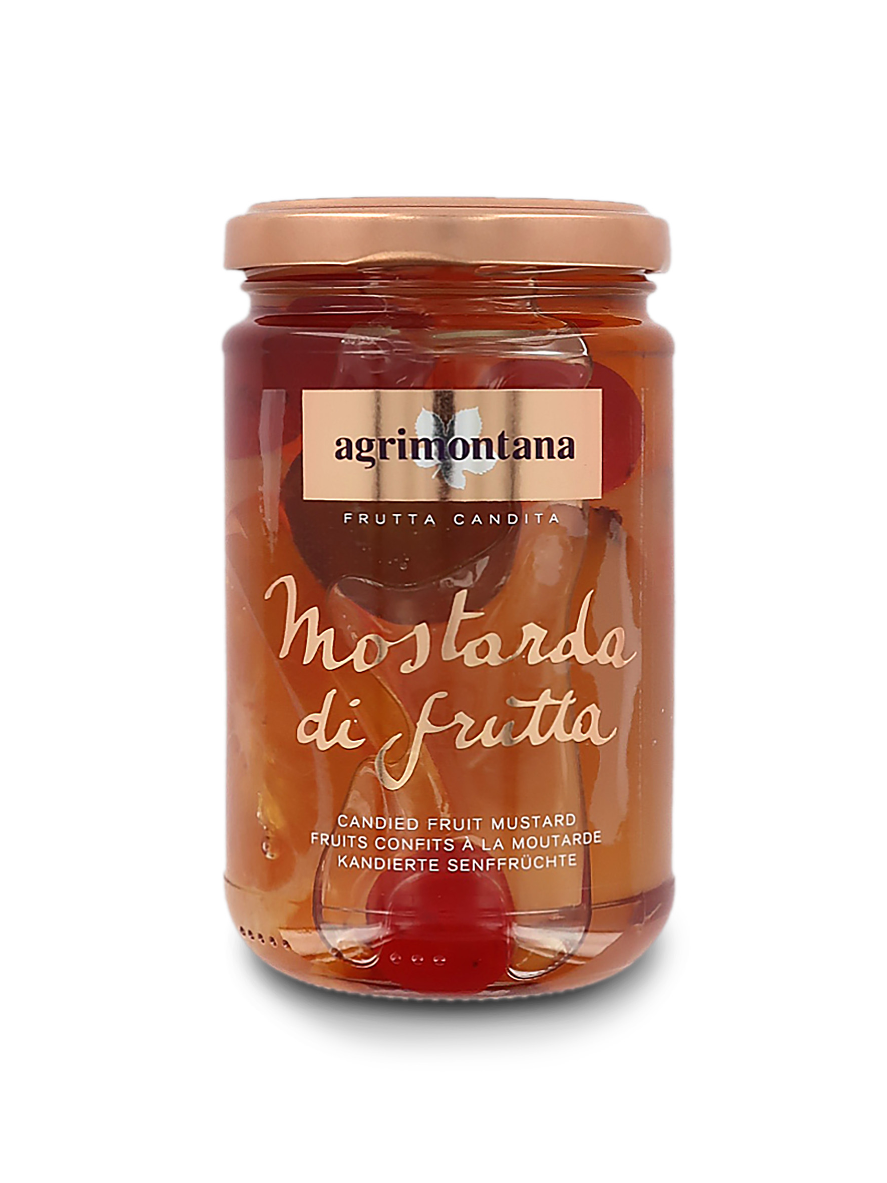 La frutta candita viene immersa in una miscela di olio essenziale di senape, olio essenziale di rafano e spezie. Questa miscela, dal sapore piccante e pungente e dalla consistenza oleosa, avvolge e sublima il sapore delicato della frutta. La Mostarda Agrimontana è ideale per accompagnare piatti di carne, salumi e formaggi.