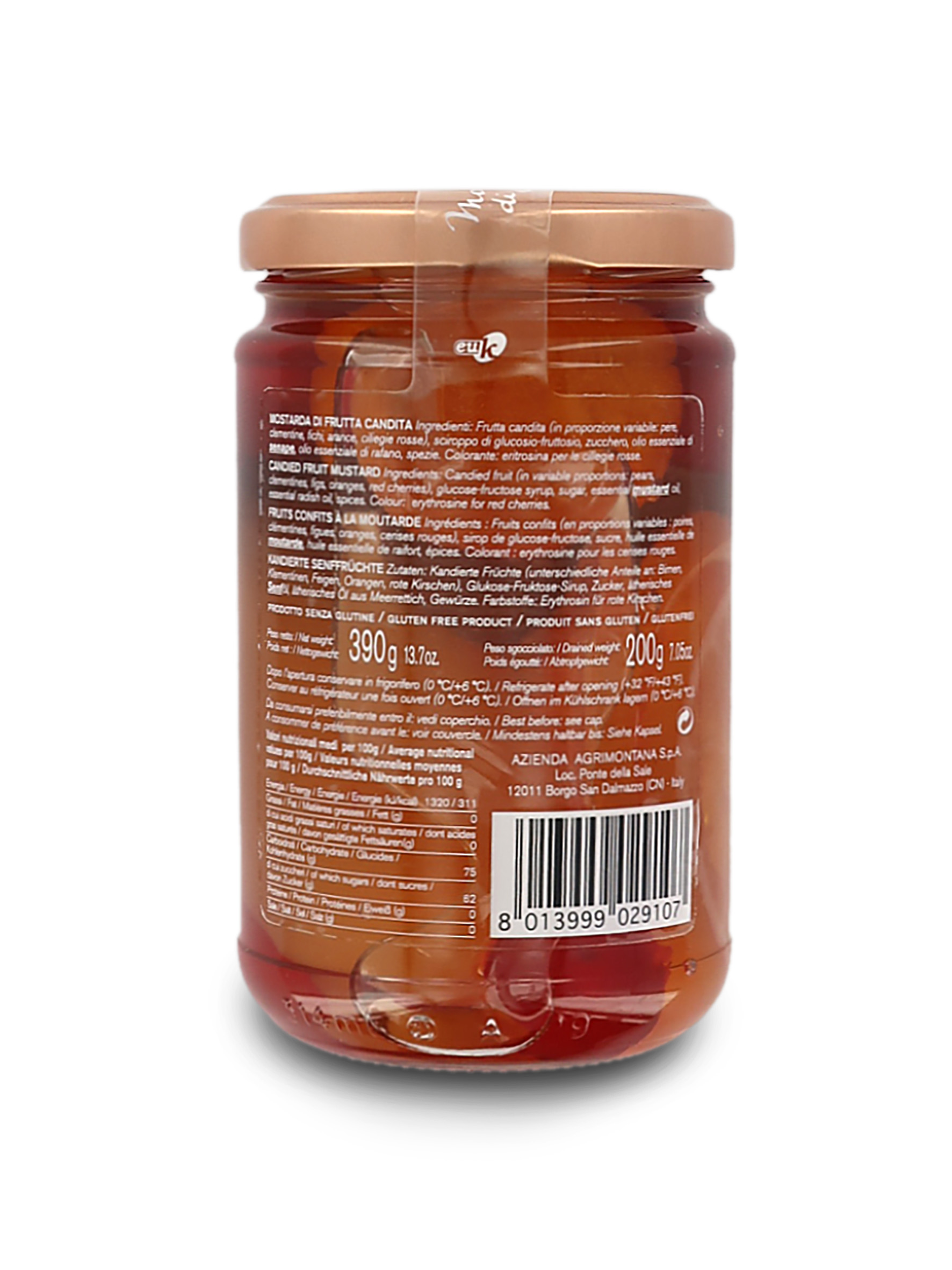 Mostarda classica italiana alla frutta mista, in vasetto da 390 grammi (peso sgocciolato: 200g). Viene impiegata frutta di primissima qualità (arance, pere, ananas, clementine, ciliegie, fichi).