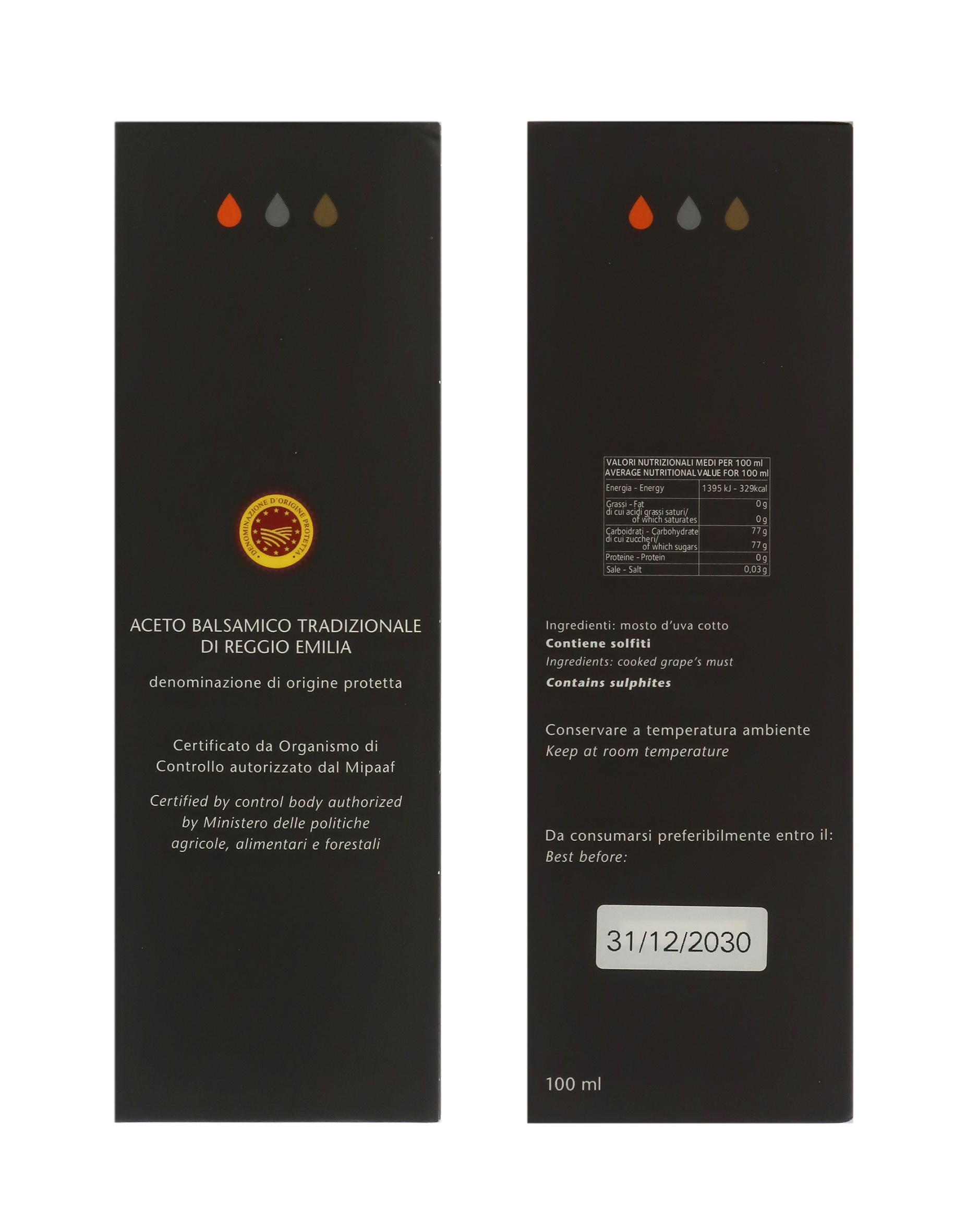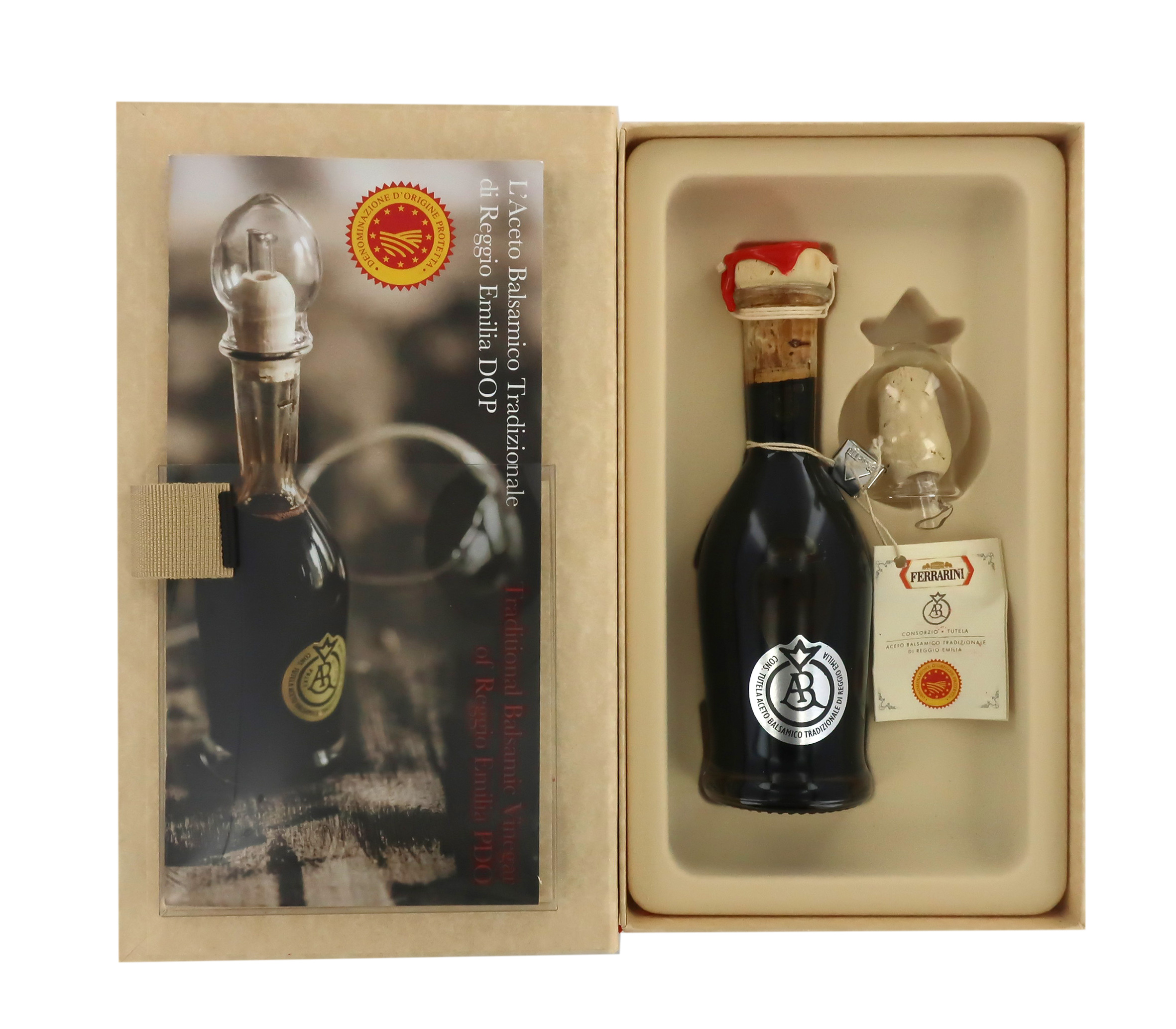 L’ Aceto Balsamico Tradizionale DOP di Reggio Emilia è tratto dal mosto cotto di due diversi tipi di uva dei vigneti emiliani, Trebbiano e Spergola, lasciato fermentare, ossidare e invecchiare nella penombra dei solai delle acetaie di proprietà Ferrarini.