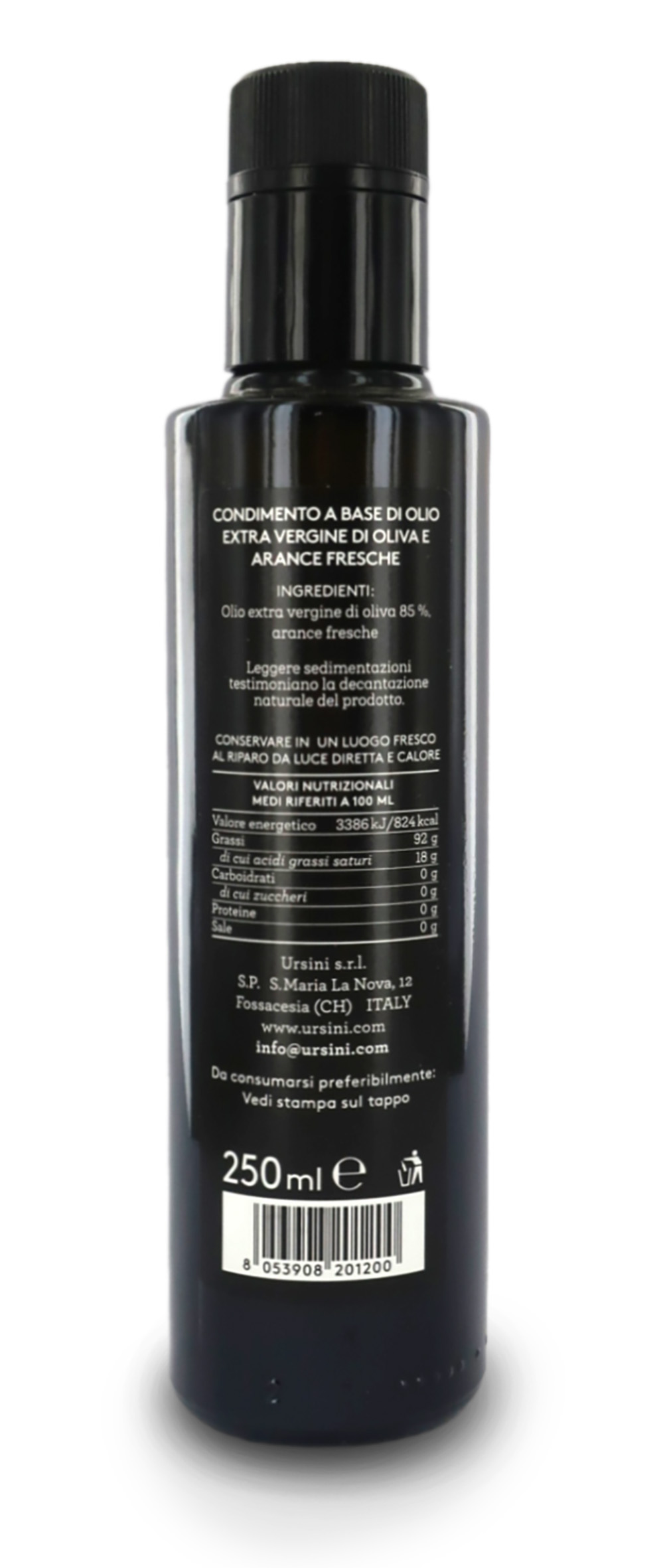 Ingredienti: olio extra vergine di oliva 85%, arance fresche. Conservare in luogo fresco al riparo da luce diretta e calore.