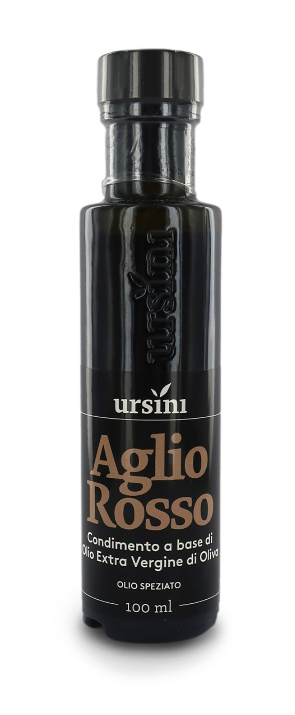 Olio extra vergine di oliva aromatizzato all'aglio rosso. L'olio ricco del delicato aroma dell'aglio rosso è pensato per essere usato a crudo ed è particolarmente adatto per condire bolliti, carni crude, bruschette e salse rustiche. In bottiglietta dallo stile moderno da 100ml.