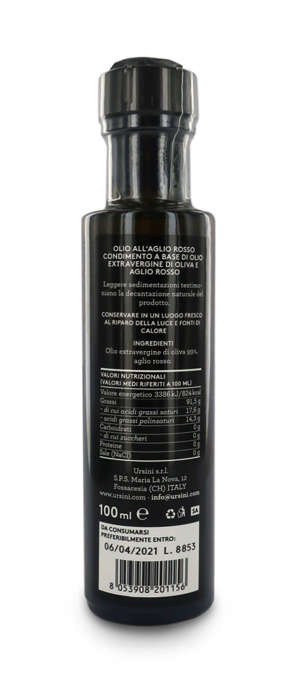 Ingredienti: olio extra vergine di oliva 98%, estratto naturale di aglio rosso.