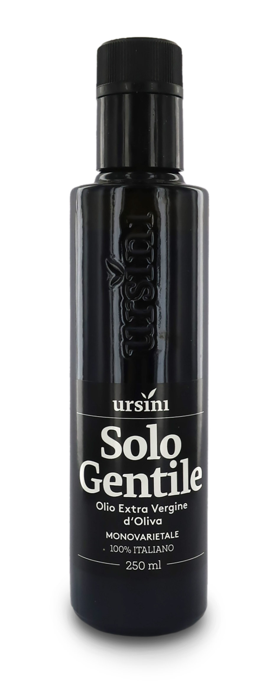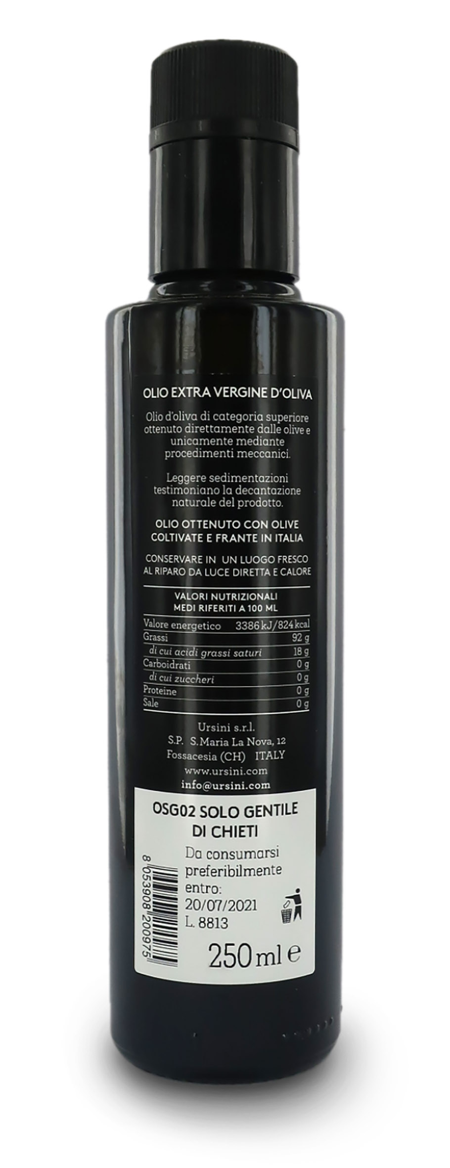 250 ml di olio extravergine di oliva monovarietale, 100% italiano, di categoria superiore, che vanta sentori di erba fresca. Al palato risulta armonico, caratterizzato da una spiccata delicatezza e una leggera aromaticità. Ottenuto direttamente dalle olive della varietà "Gentile di Chieti", unicamente mediante procedimenti meccanici. Il gusto è mediamente fruttato. Lo si consiglia con formaggi freschi (ricotta, mozzarella e cacio primo fiore), insalate, tartare di carne o pesce, carni bianche grigliate e verdure delicate.