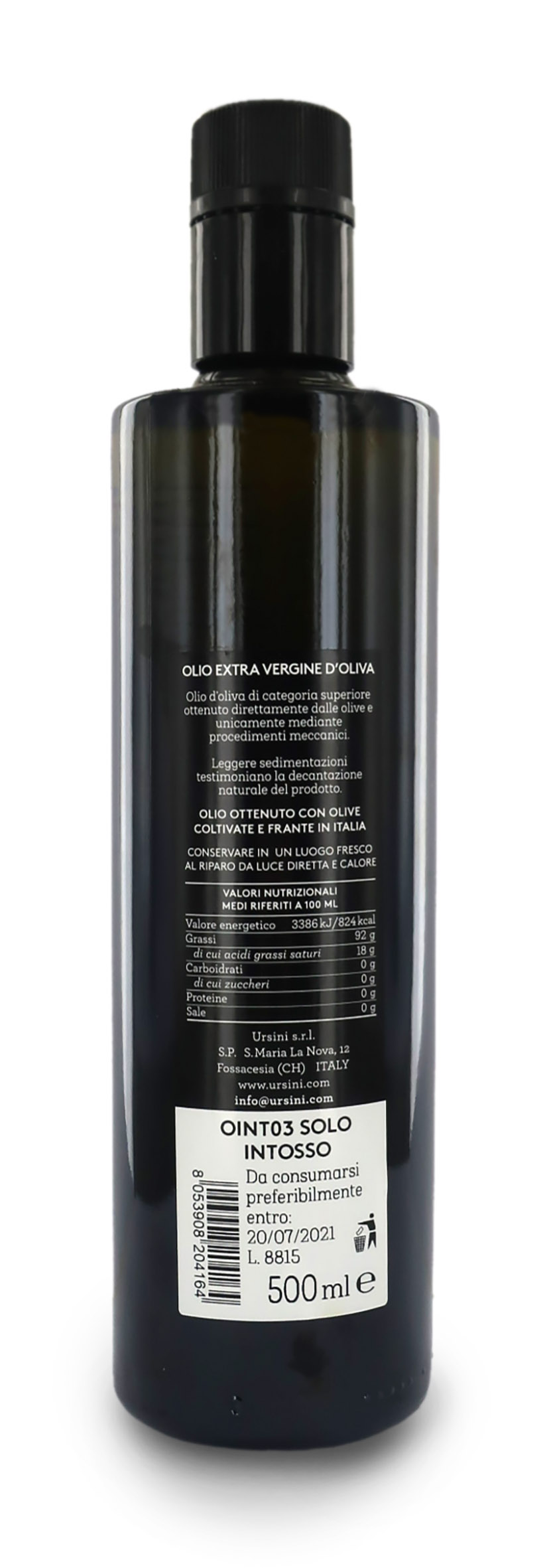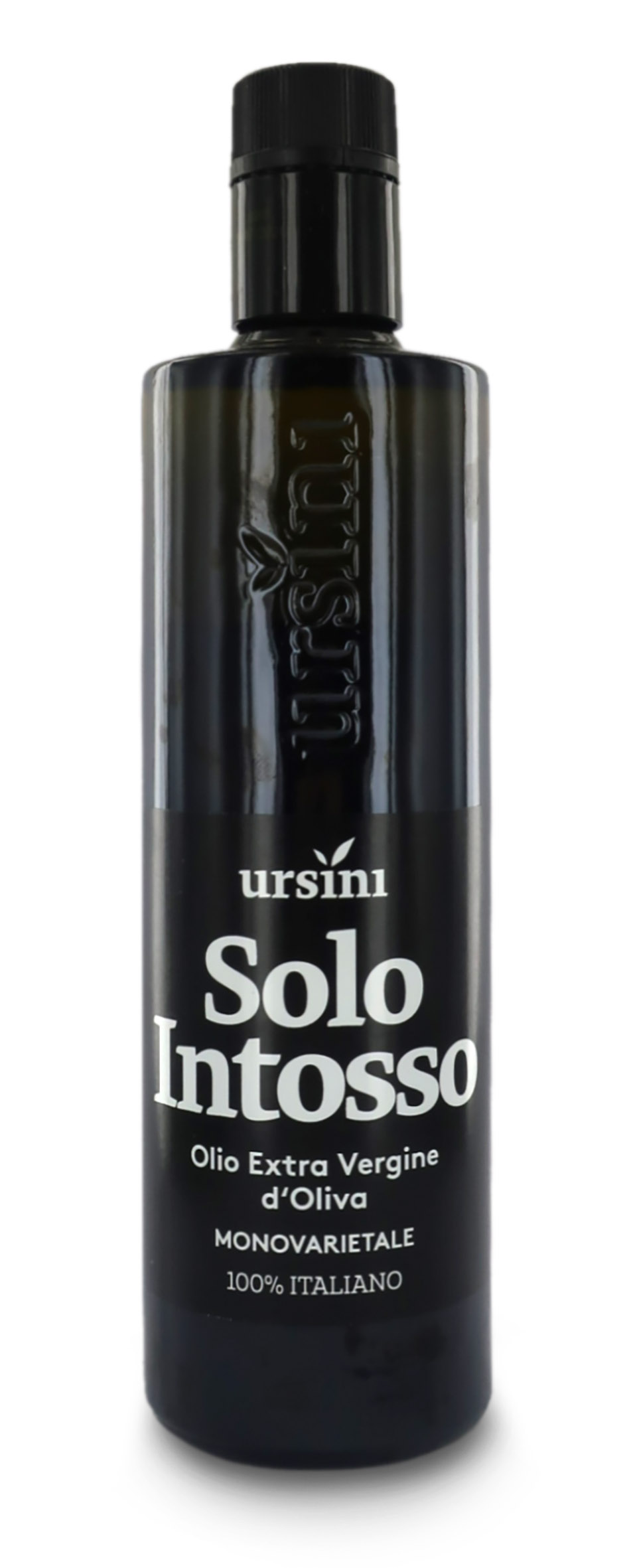 L'olio extra vergine d'oliva "Solo Intosso", prodotto dalla Famiglia Ursini esclusivamente con olive abruzzesi di varietà Intosso. Le olive Intosso, presidio Slow Food, crescono in Località Caprafico e Piano Laroma, nel territorio del Comune di Casoli (CH). In bottiglietta di vetro scuro, dallo stile moderno, da 500ml.