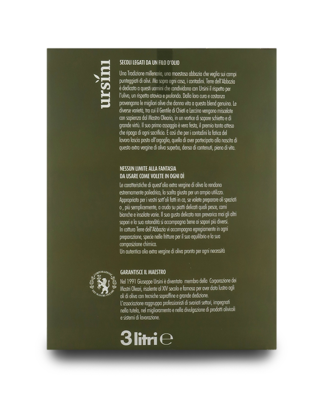 Olio extra vergine d'oliva "Terre dell'Abbazia", 100% italiano, Borsa da 3 litri