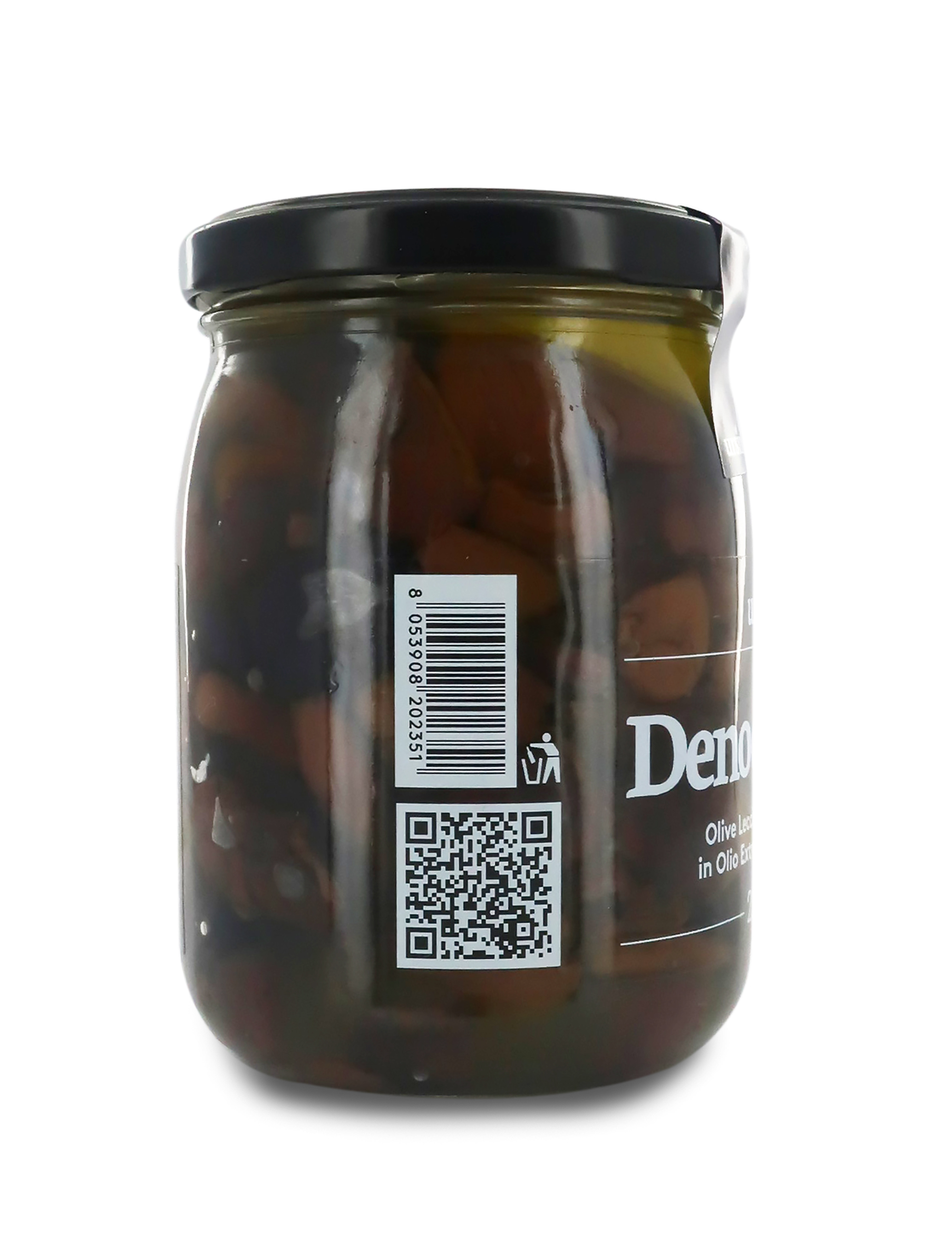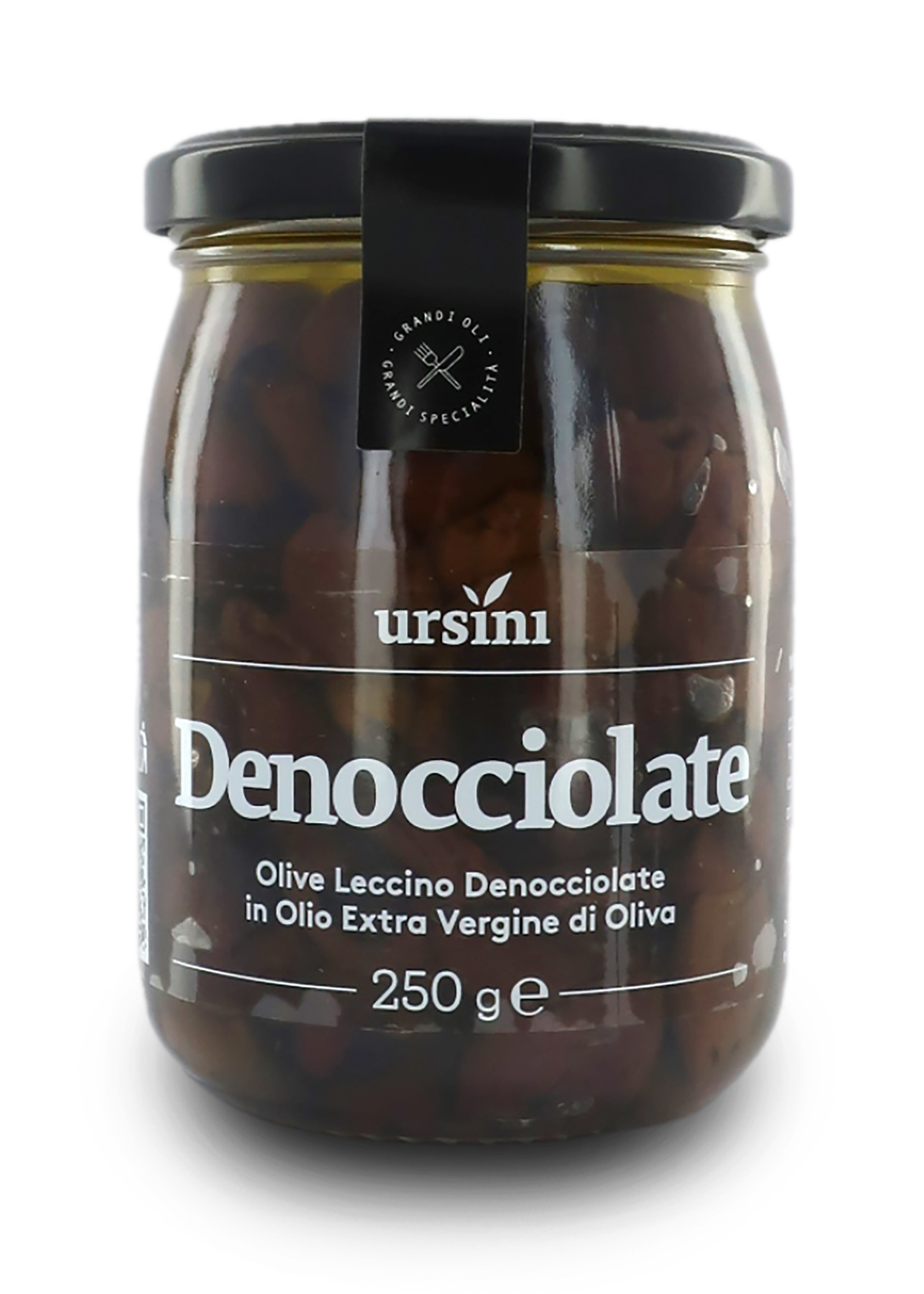 Olive Leccino denocciolate in olio extravergine di oliva. Il gusto particolare di questa varietà di olive è adatto ad antipasti, insalate di pasta e riso, contorni cotti.