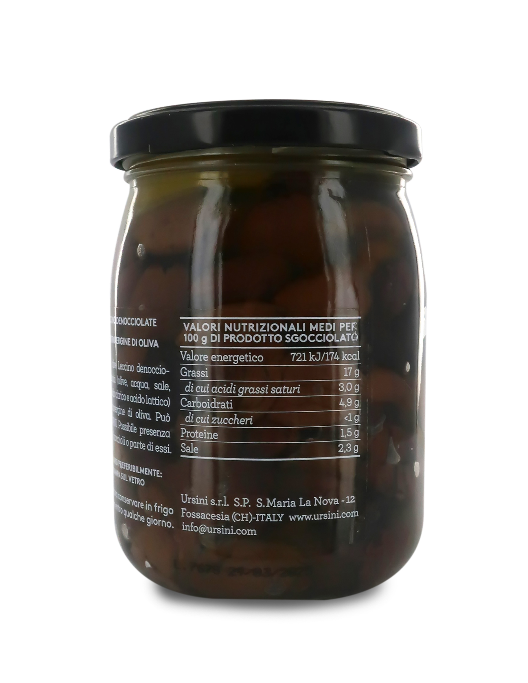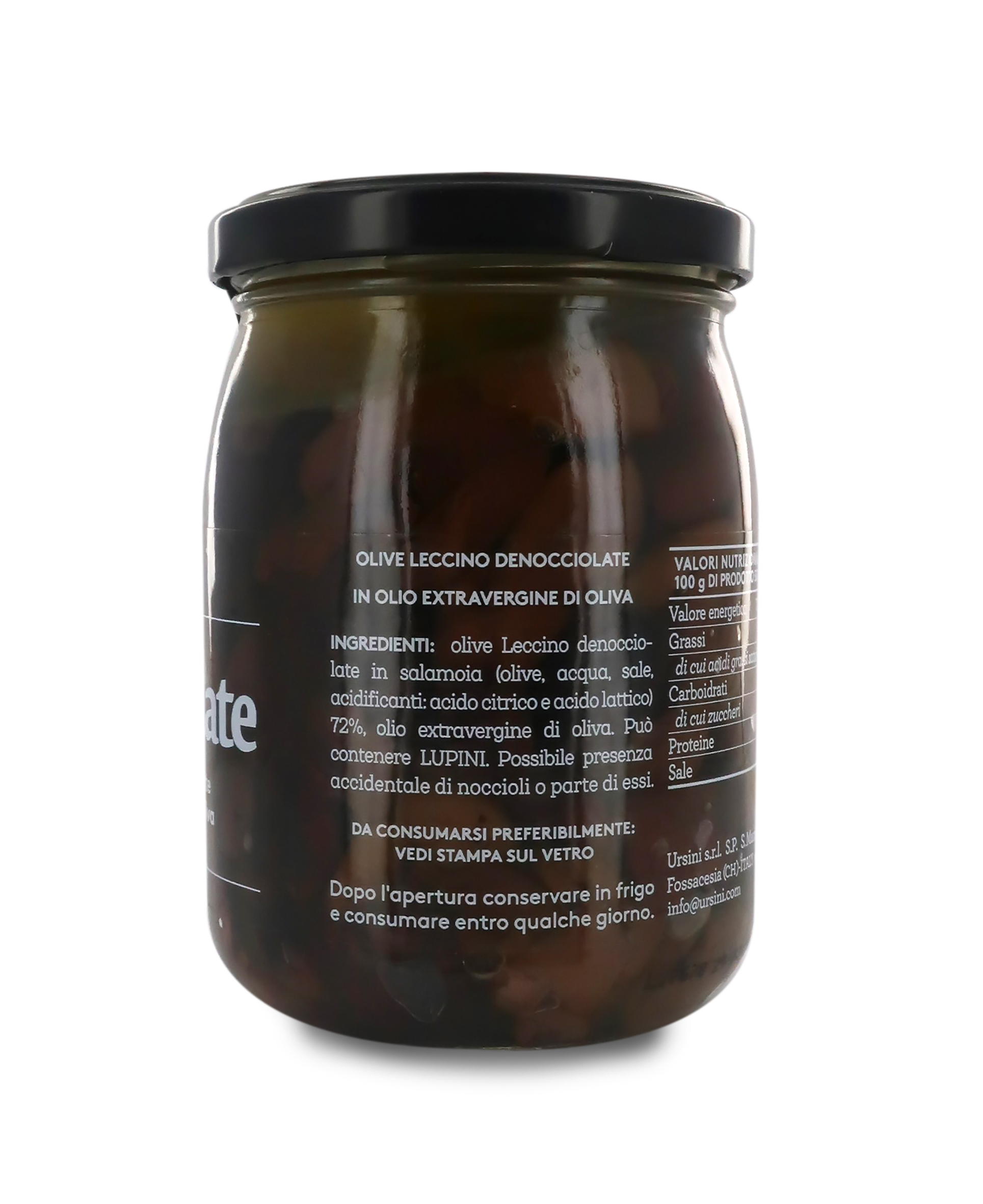 Ingredienti: olive Leccino denocciolate in salamoia (olive, acqua, sale, acidificanti: acido citrico e acido lattico) 72%, olio extravergine di oliva. Può contenere LUPINI. Possibile presenza accidentale di noccioli o parte di essi.