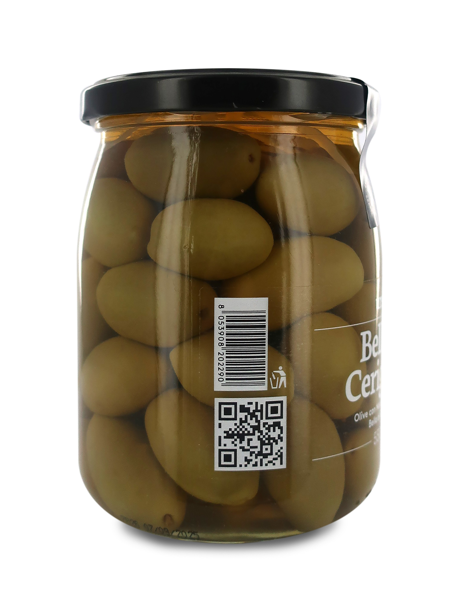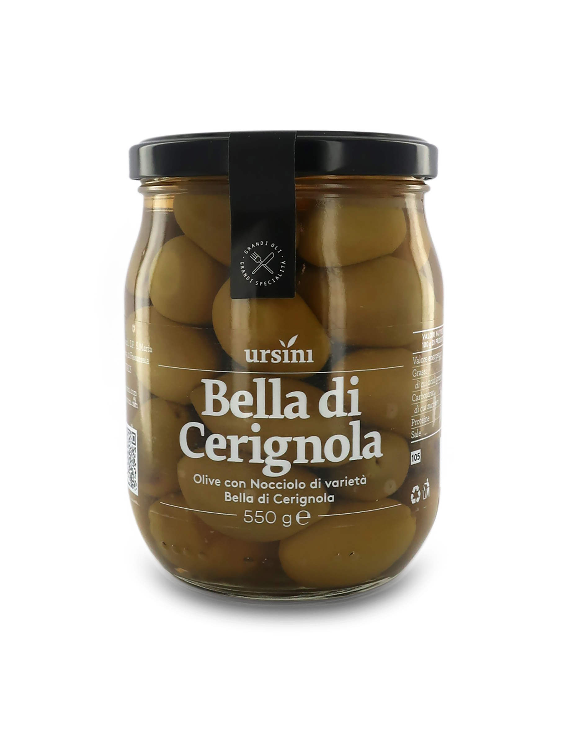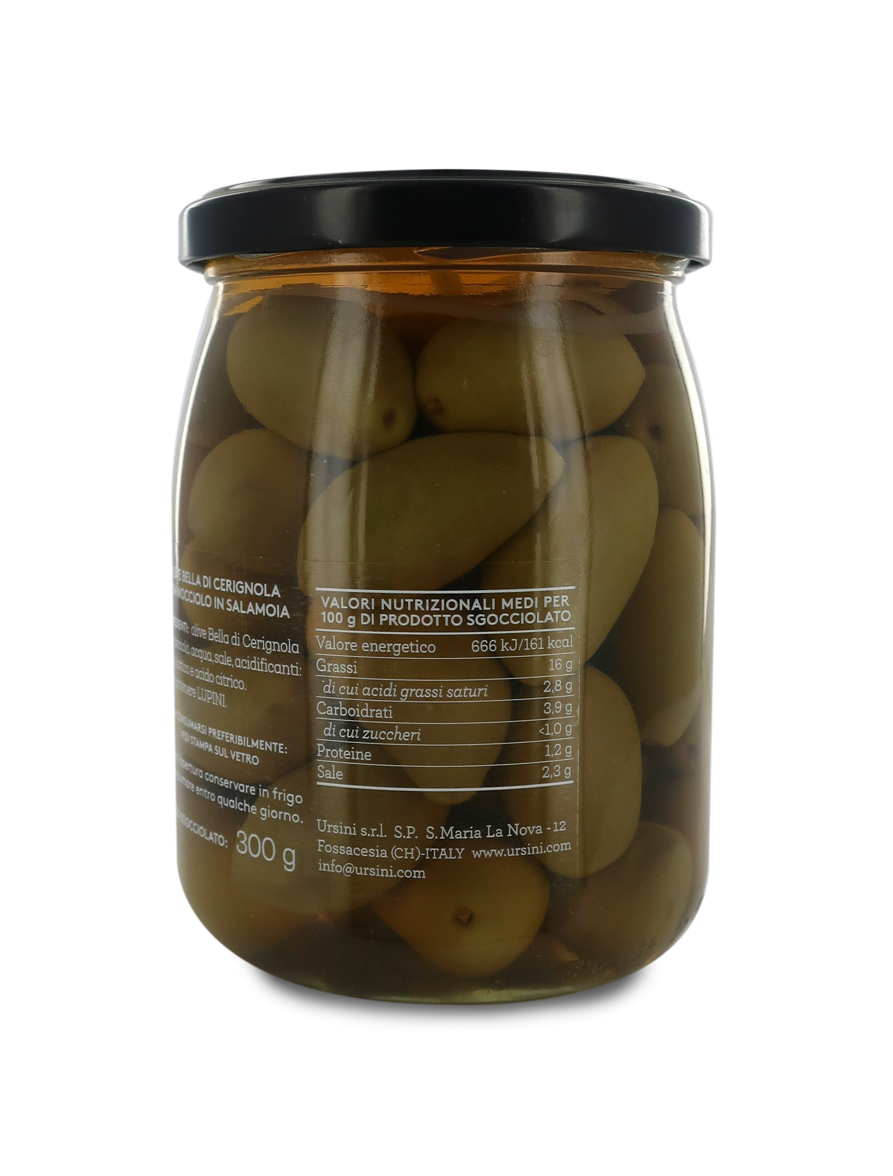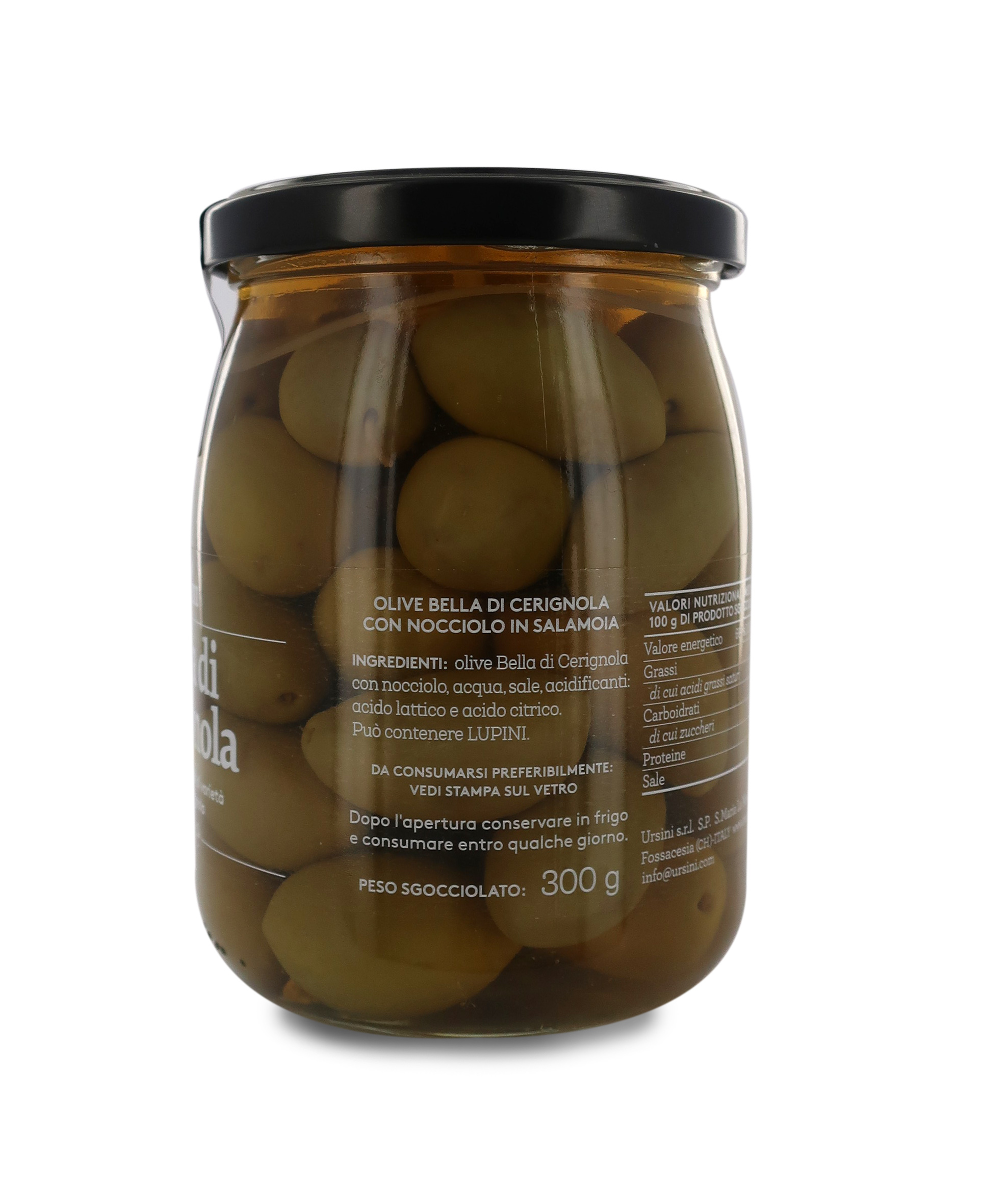 Ingredienti: olive Bella di Cerignola con nocciolo, acqua, sale, acidificanti: acido lattico e acido citrico. Può contenere LUPINI. Prodotto in uno stabilimento che utilizza SEDANO, FRUTTA SECCA IN GUSCIO, PESCE, PANE, SENAPE, PRODOTTI A BASE DI LATTE E DERIVATI DELLE UOVA.