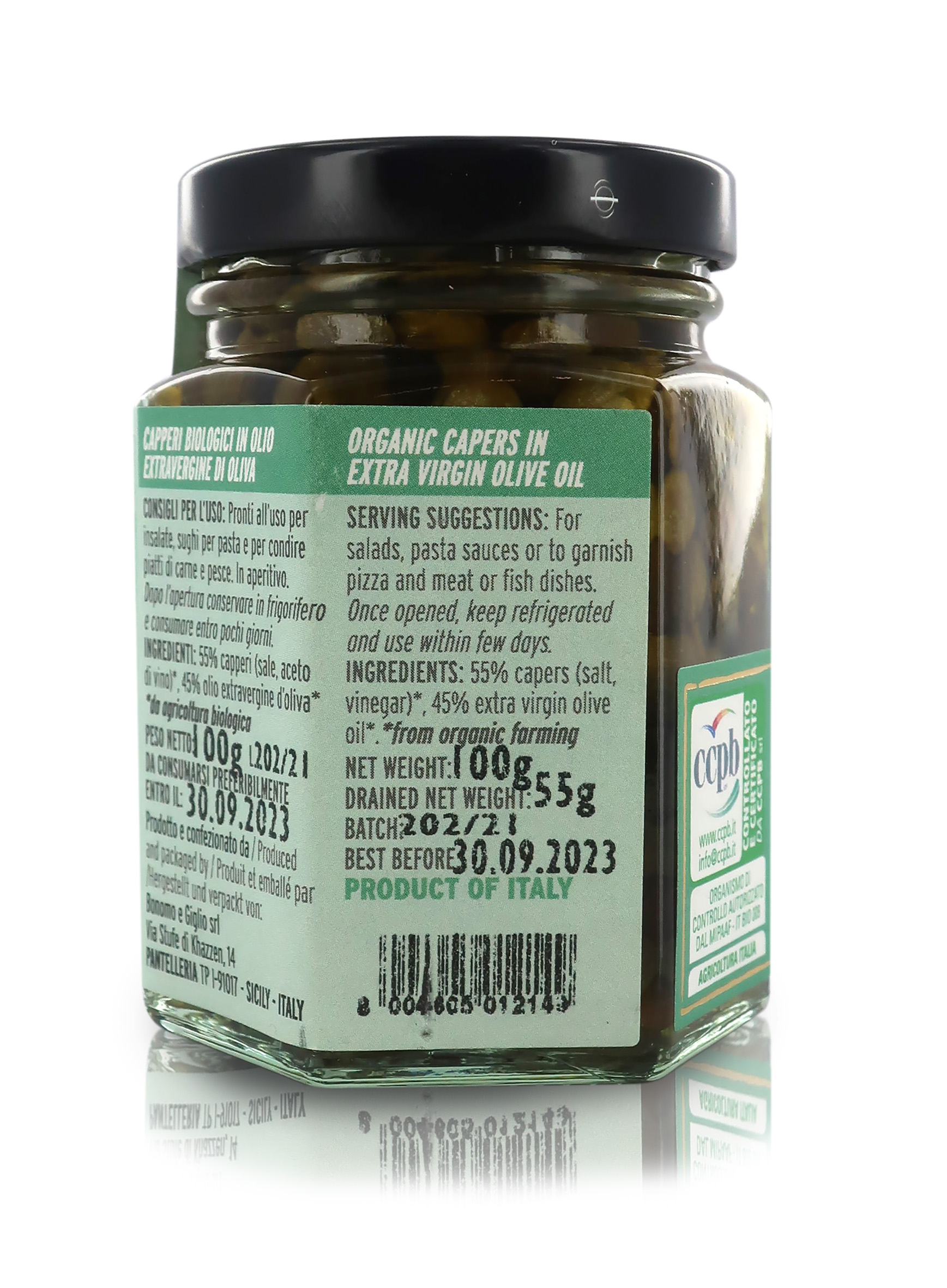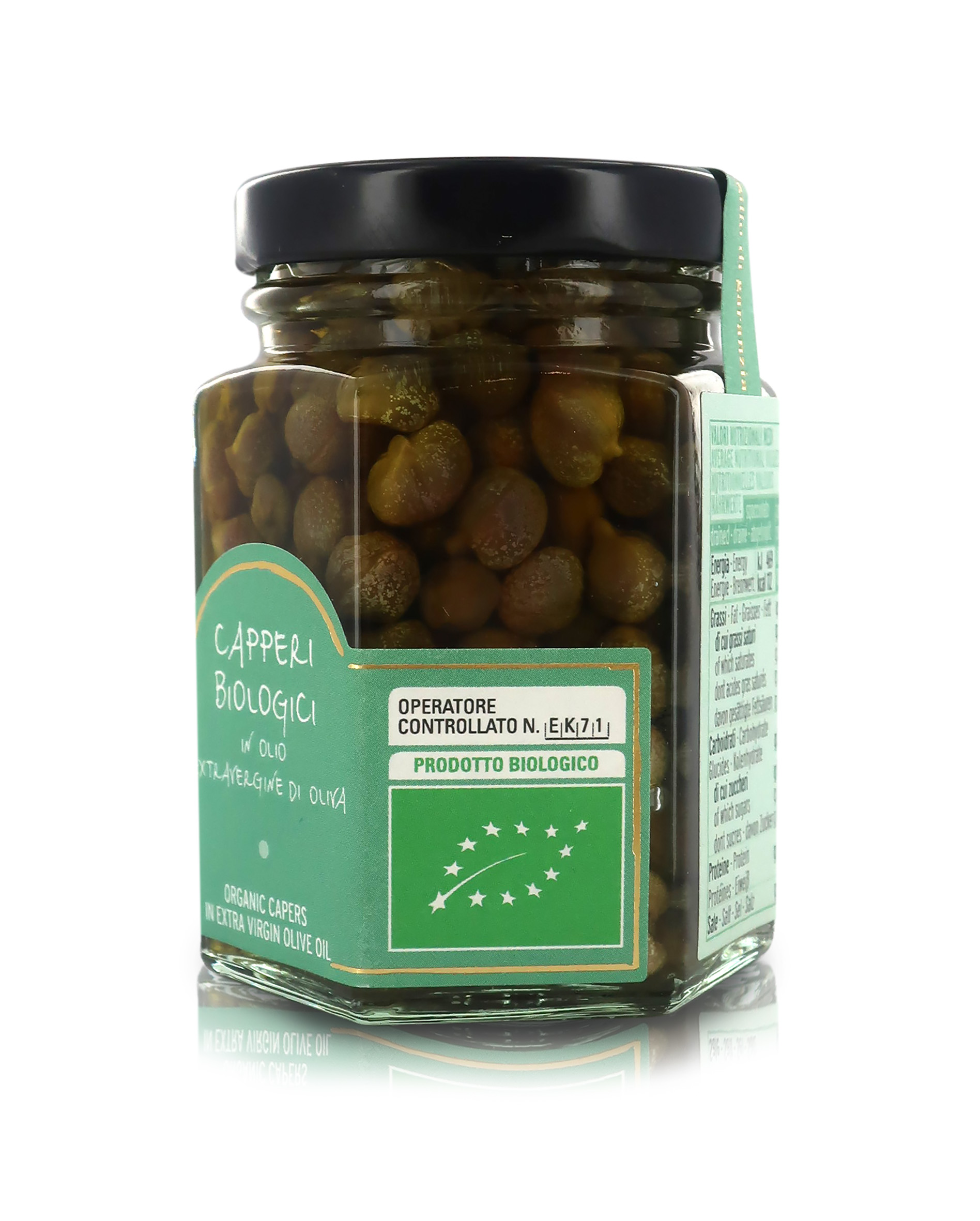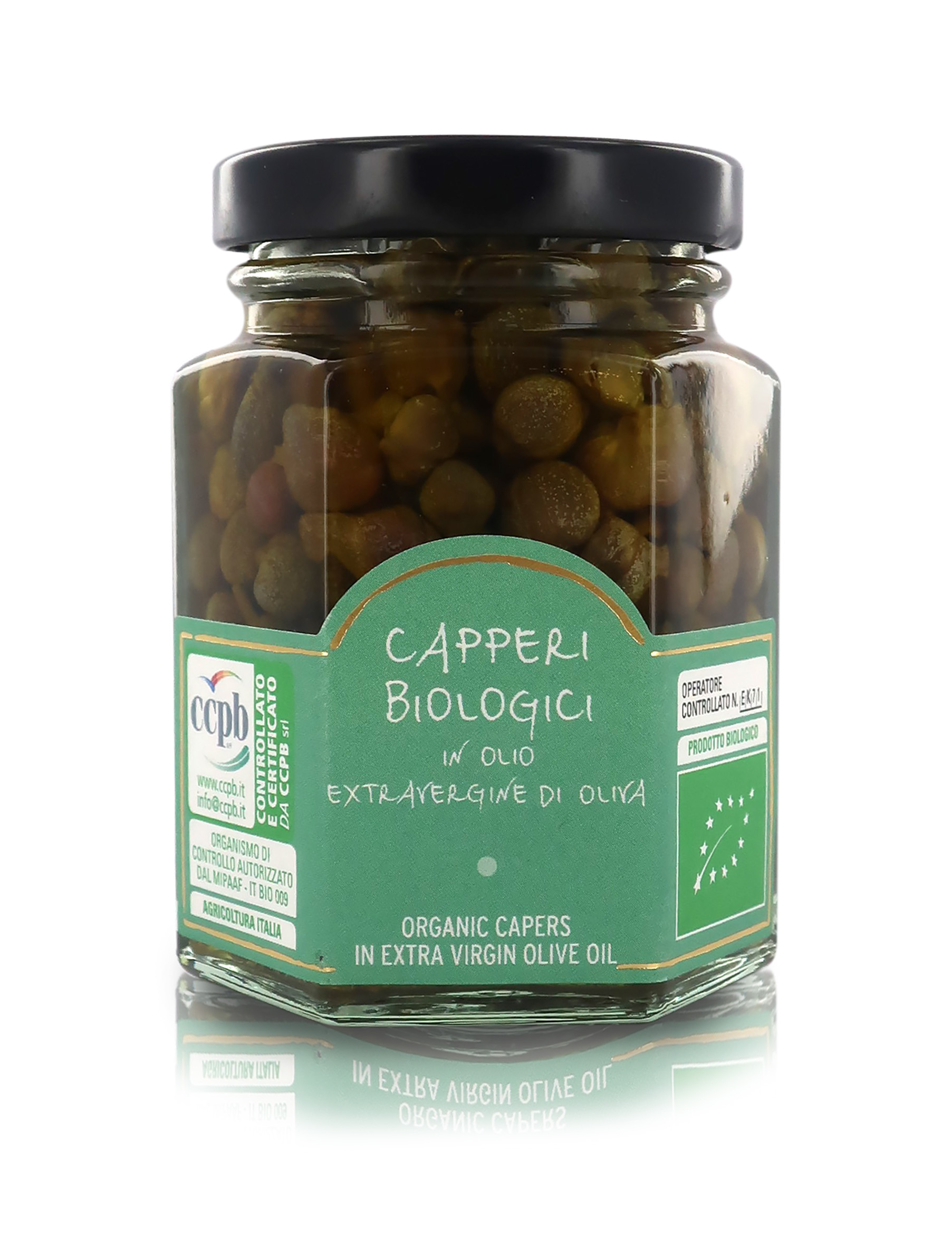 Capperi biologici in olio extravergine d’oliva, ottenuti esclusivamente da agricoltura biologica italiana. In vasetto. Peso netto: 100g (peso sgocciolato: 55g).
