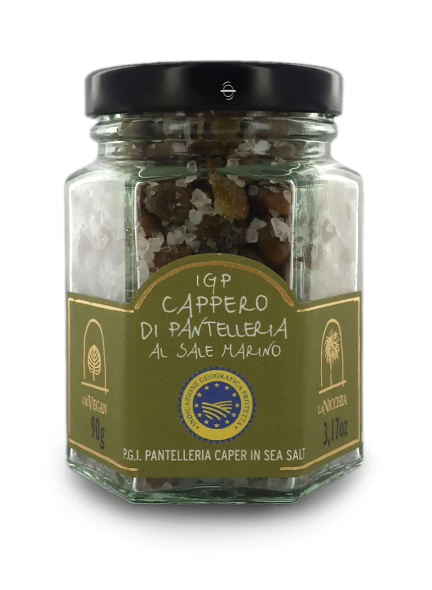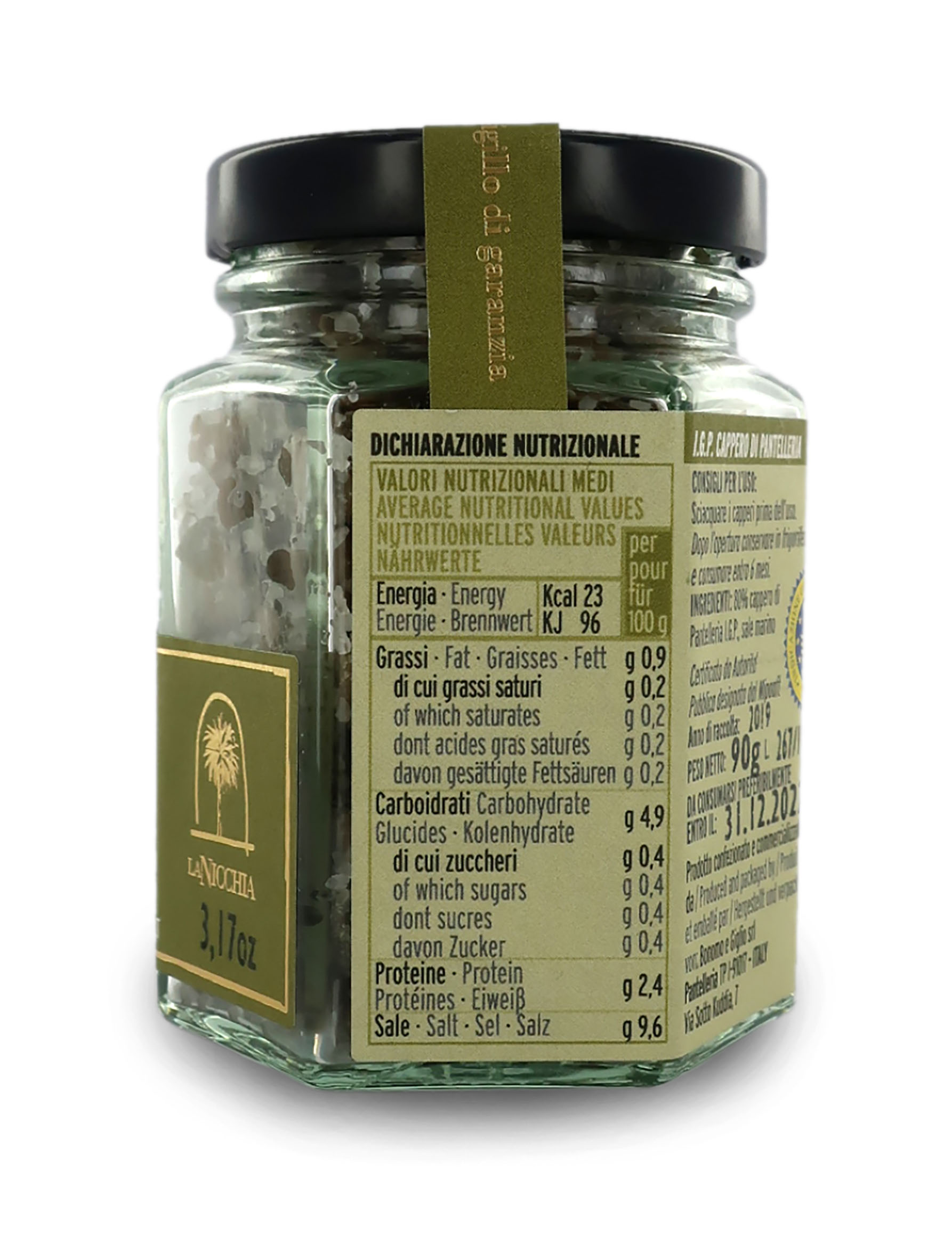 Capperi di Pantelleria IGP, calibro piccolo, conservati in sale marino. Questi capperi piccoli d'indicazione geografica protetta sono consigliati per guarnire piatti di pesce e di carne rossa o bianca. Sciacquarli dal sale prima dell’uso.