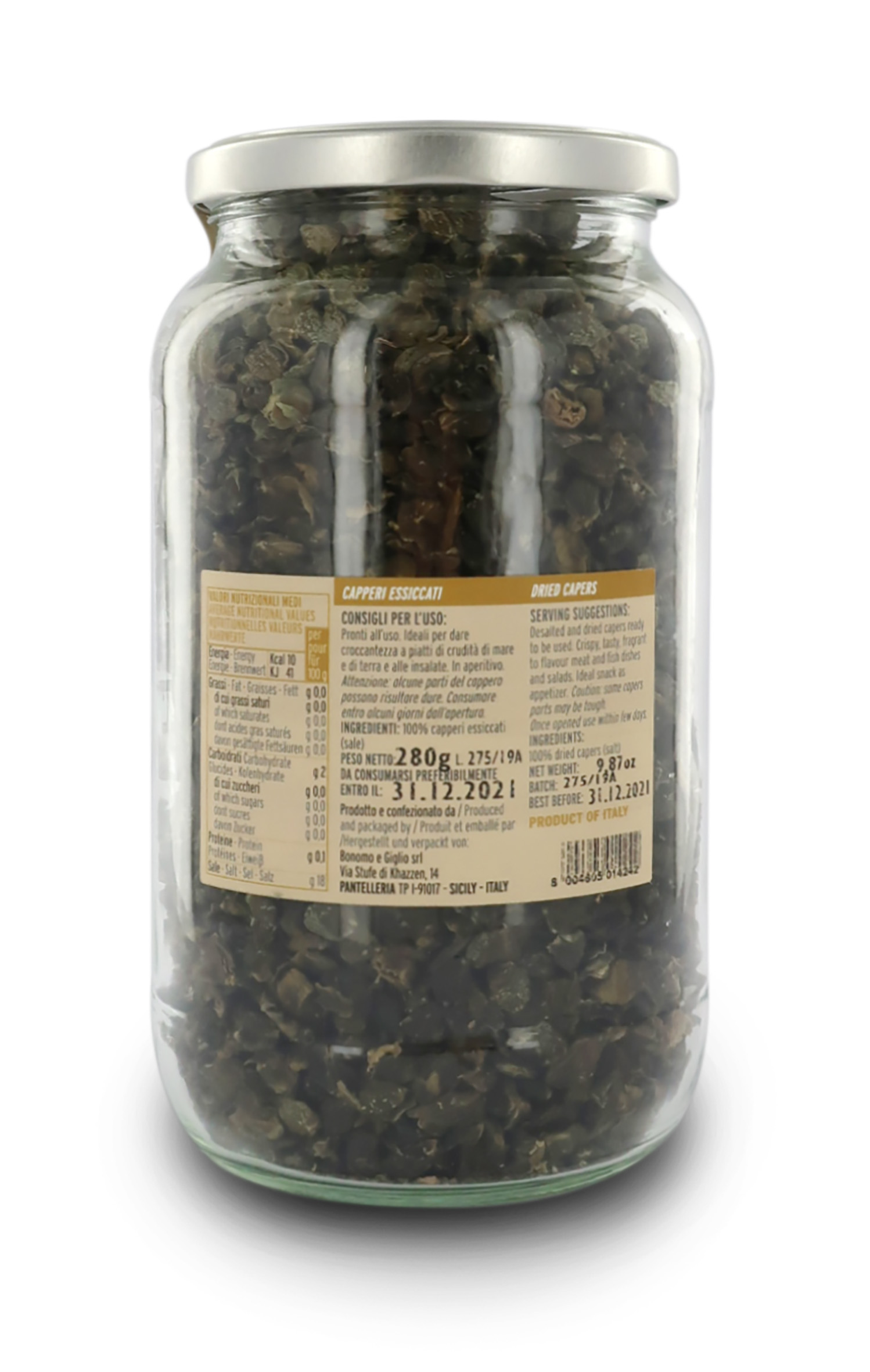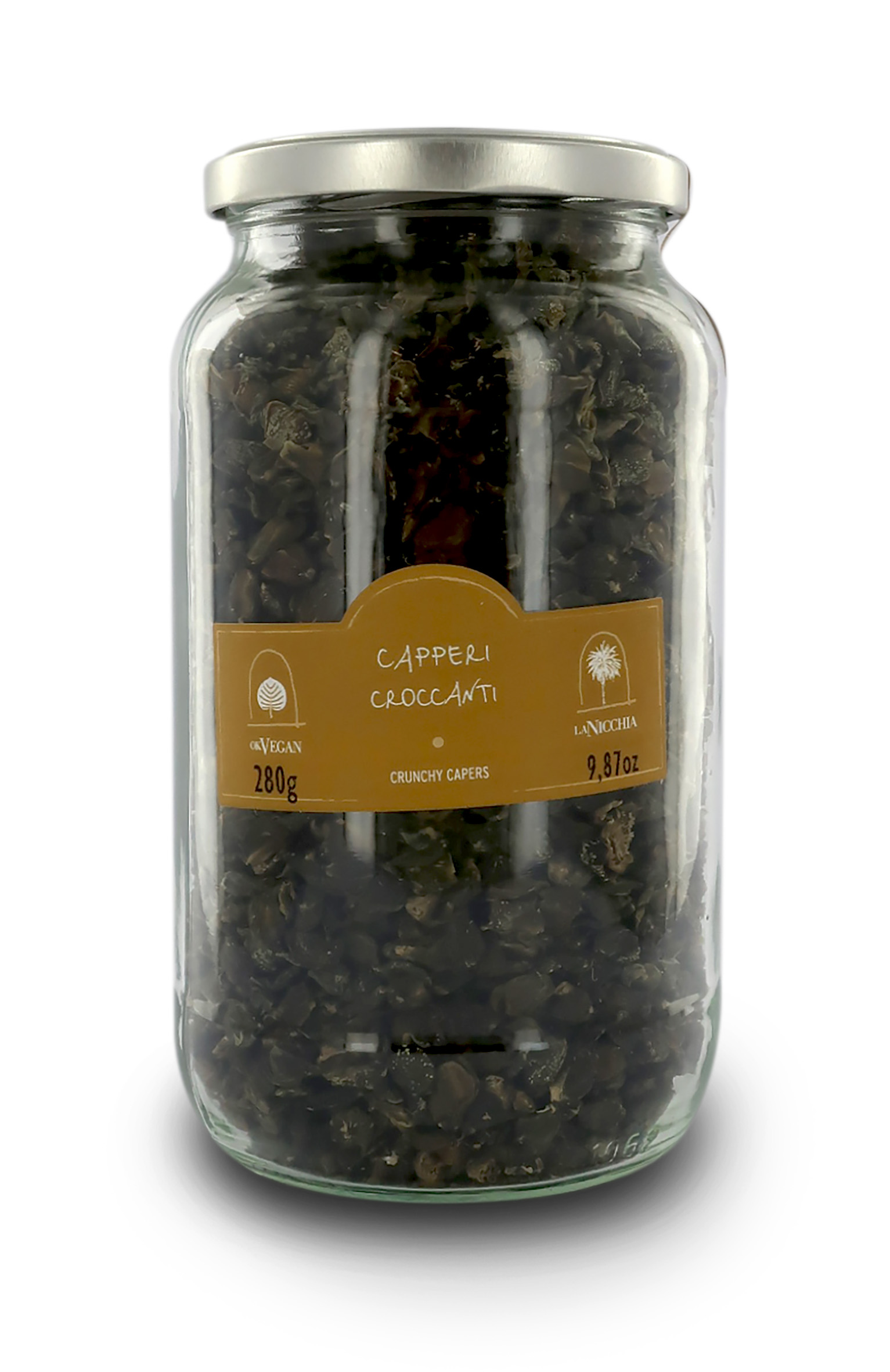 Rivisitazione del cappero a opera de La Nicchia, che propone il celeberrimo simbolo pantesco essiccato, in una forma tanto inusuale quanto sfiziosa. Vengono rigorosamente selezionati capperi del medesimo calibro, in modo da ottenere un prodotto omogeneo e uniforme. I capperi vengono dissalati ed essiccati, prima al sole e poi in disidratatore, per diventare l'ingrediente naturale perfetto che dona ai vostri piatti una nota croccante molto particolare. Perfetti anche da sgranocchiare durante un aperitivo, o come guarnizione di piatti di pesce, carne o pasta.