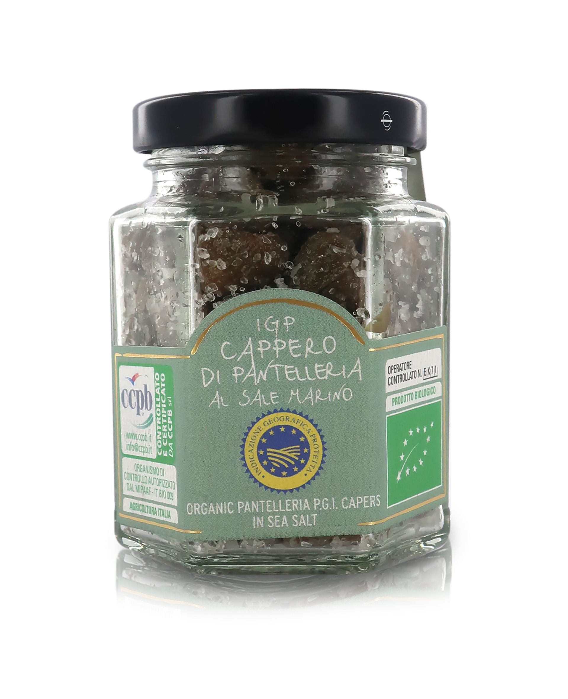 Capperi di Pantelleria IGP ottenuti esclusivamente da agricoltura biologica italiana, coltivati direttamente nei campi de La Nicchia Pantelleria, sotto stretto controllo e senza l'uso di alcun prodotto chimico. Sono capperi di Pantelleria sotto sale, inconfondibile eccellenza pantesca.