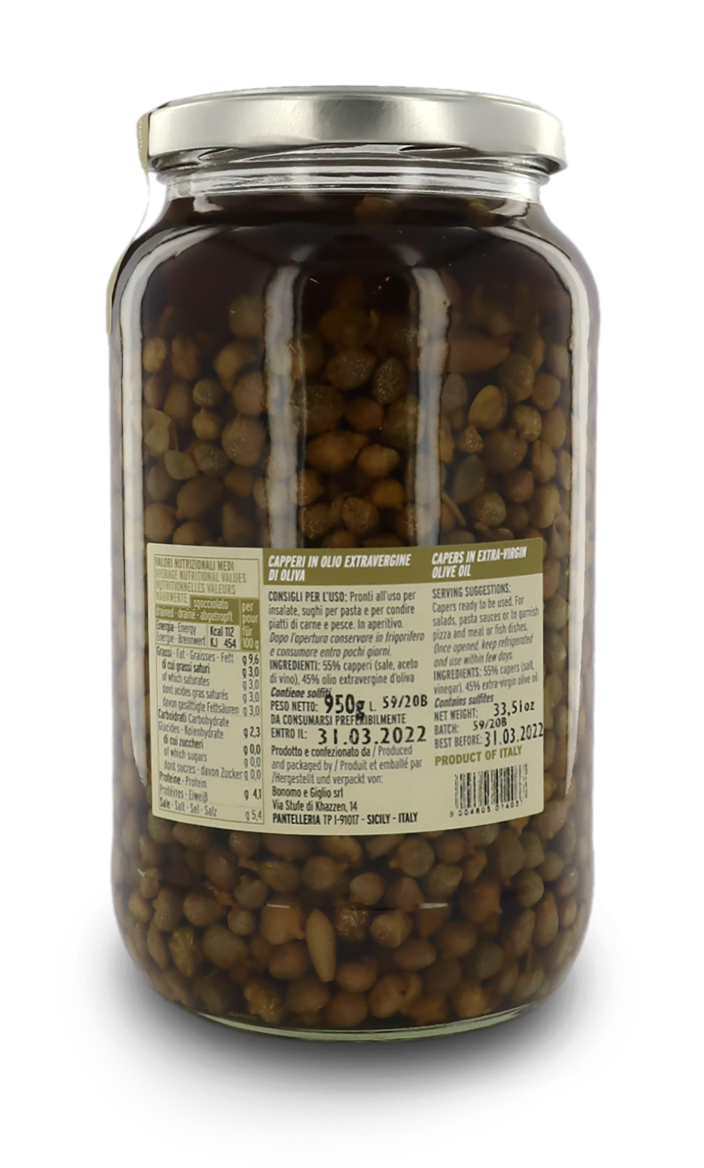 Ingredienti: 55% capperi (sale, aceto di vino), olio extravergine di oliva.