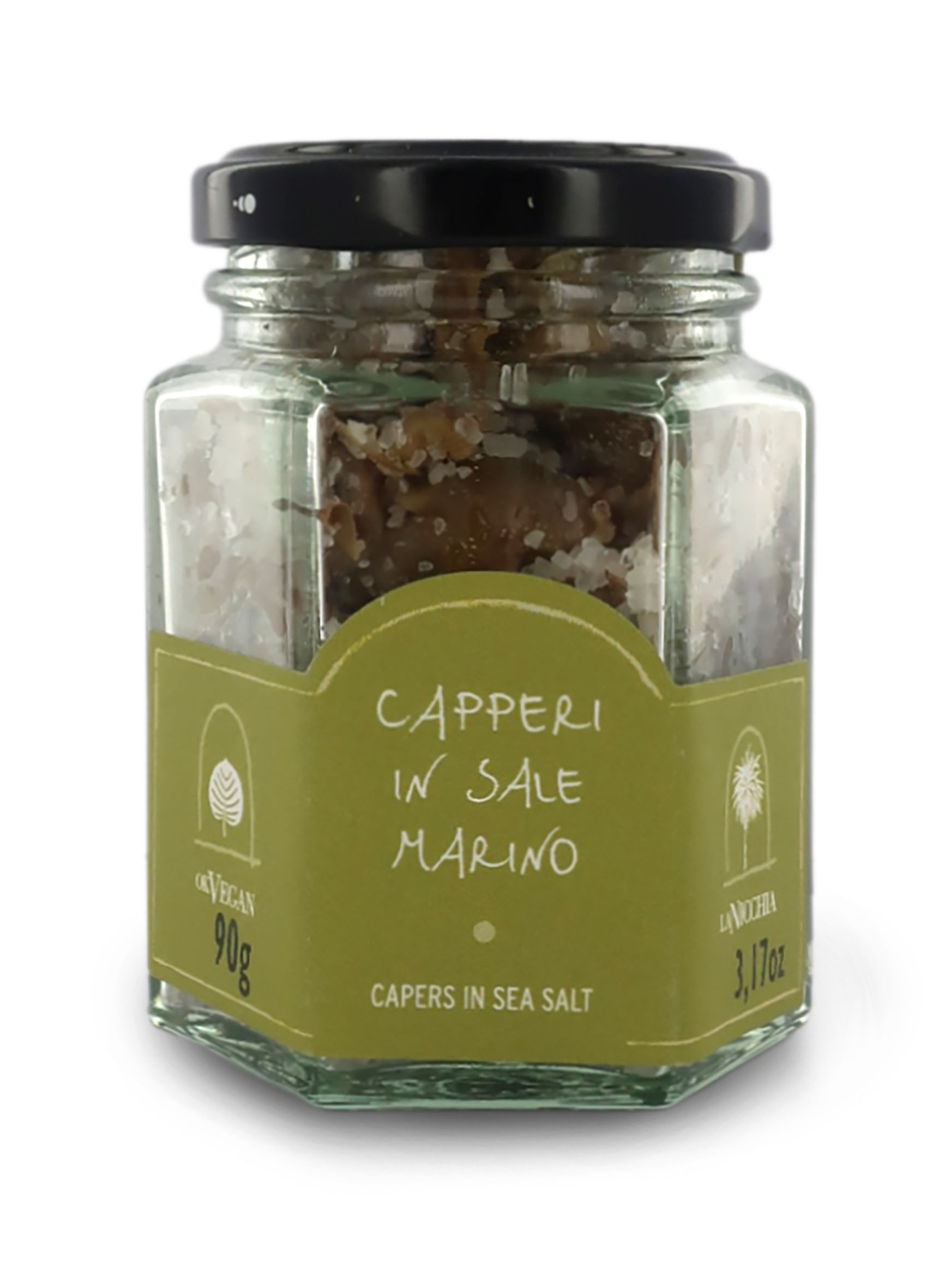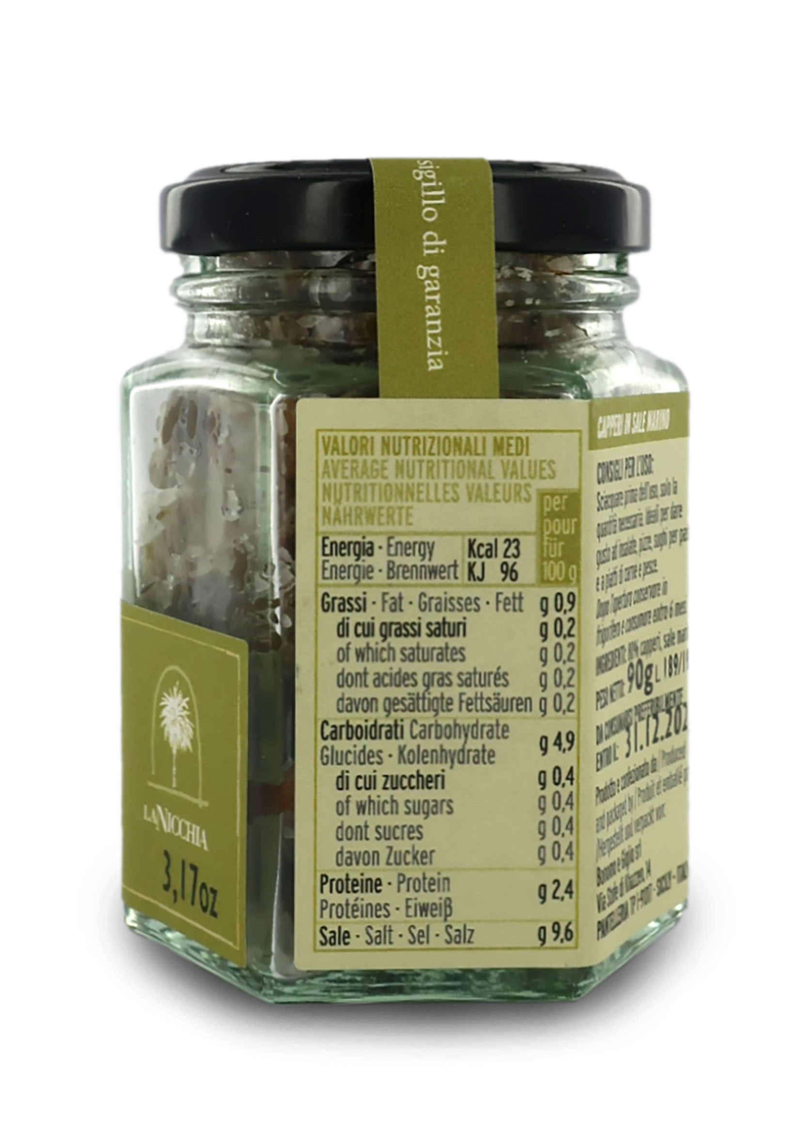 Capperi selezionati, calibro grande, conservati in sale marino. I capperi grandi sono indicati per condire sughi di pomodoro o per realizzare creme e patè. Sciacquarli dal sale prima dell’uso.