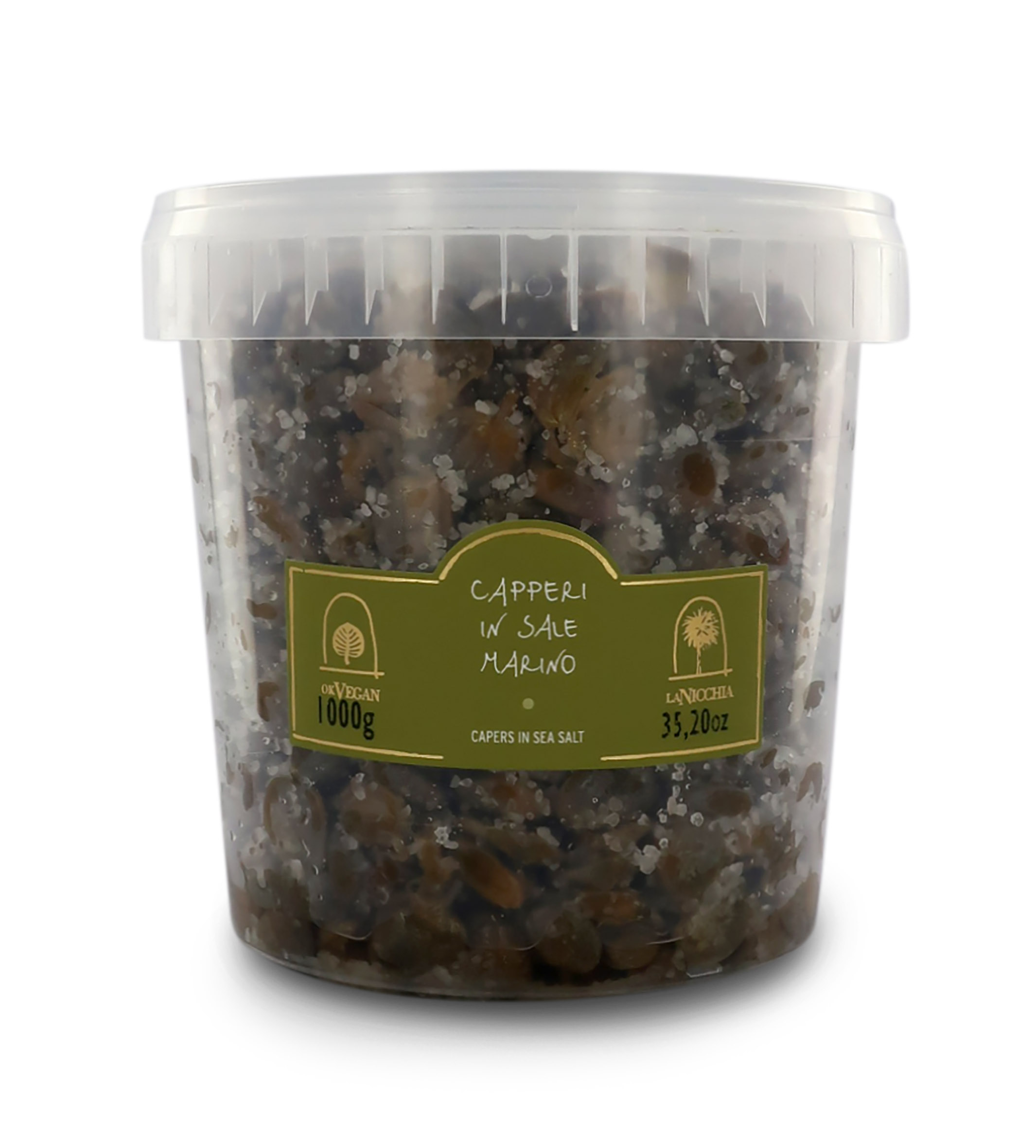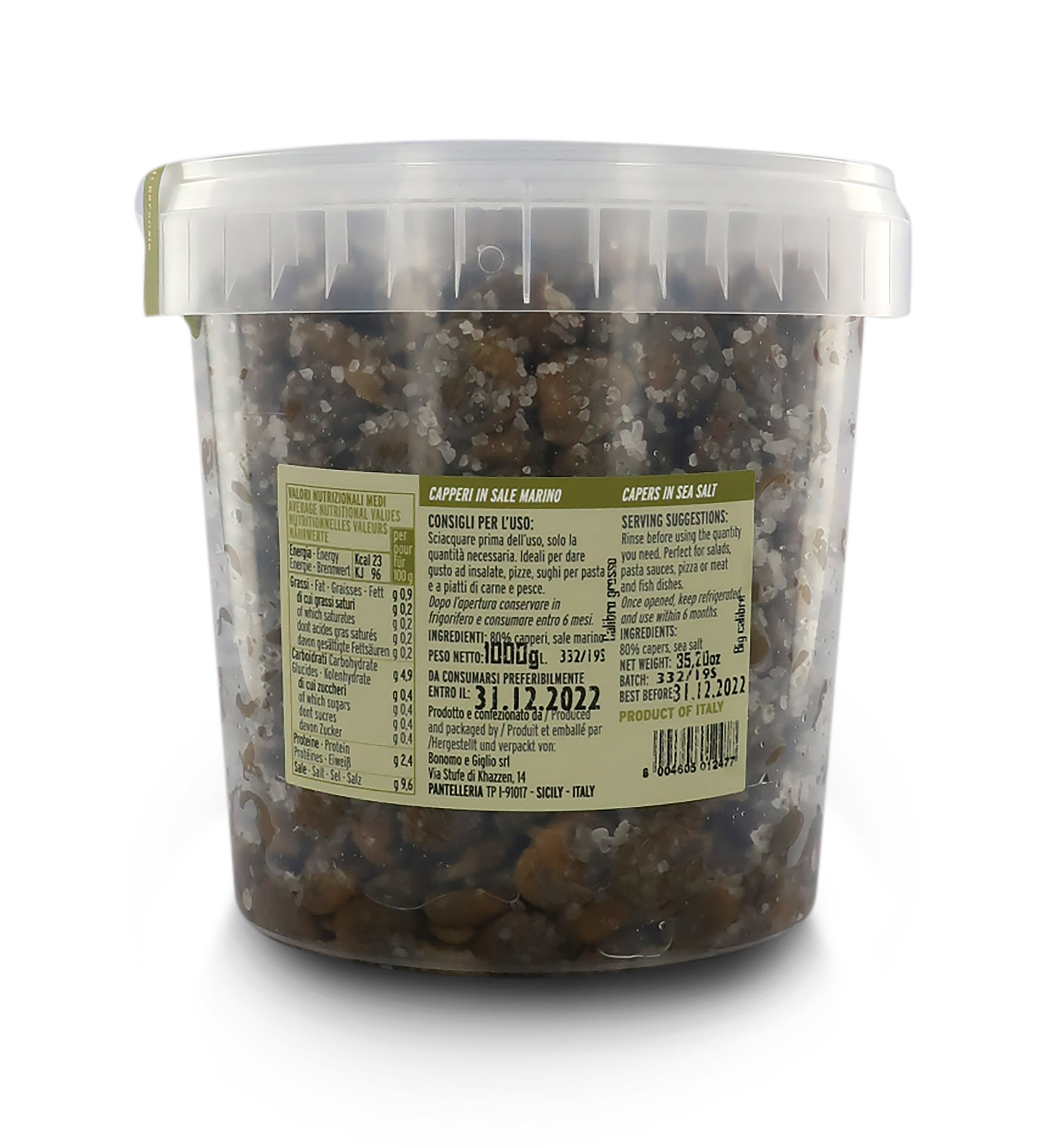 Capperi selezionati, calibro grande, conservati in sale marino. I capperi grandi sono indicati per condire sughi di pomodoro o per realizzare creme e patè. Sciacquarli dal sale prima dell’uso.