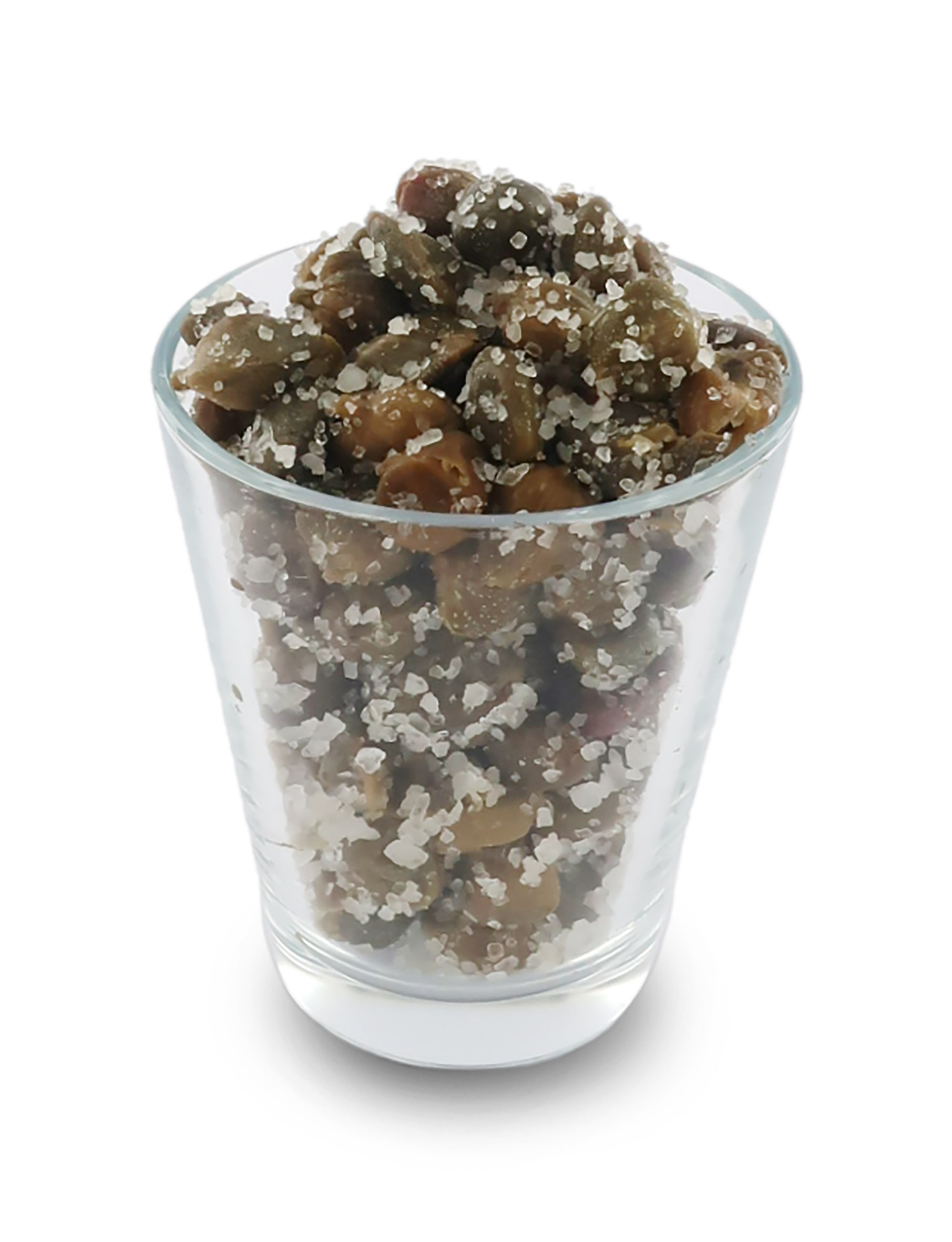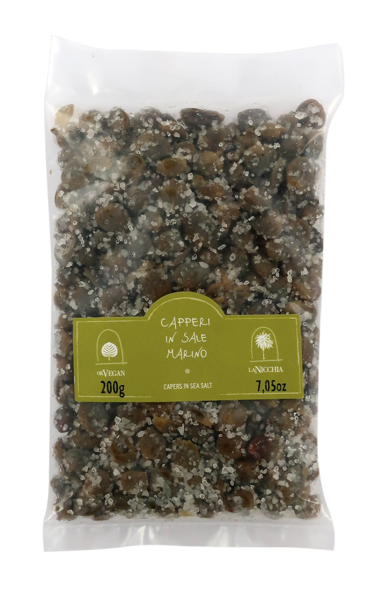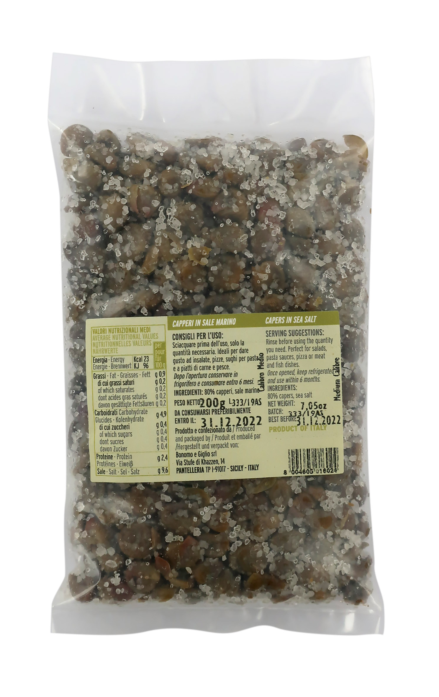 Capperi selezionati, calibro medio, conservati in sale marino. I capperi medi sono indicati sia per condire sughi di pomodoro o per realizzare creme e patè, sia per guarnire piatti di pesce e di carne rossa o bianca. Sciacquarli dal sale prima dell’uso.
