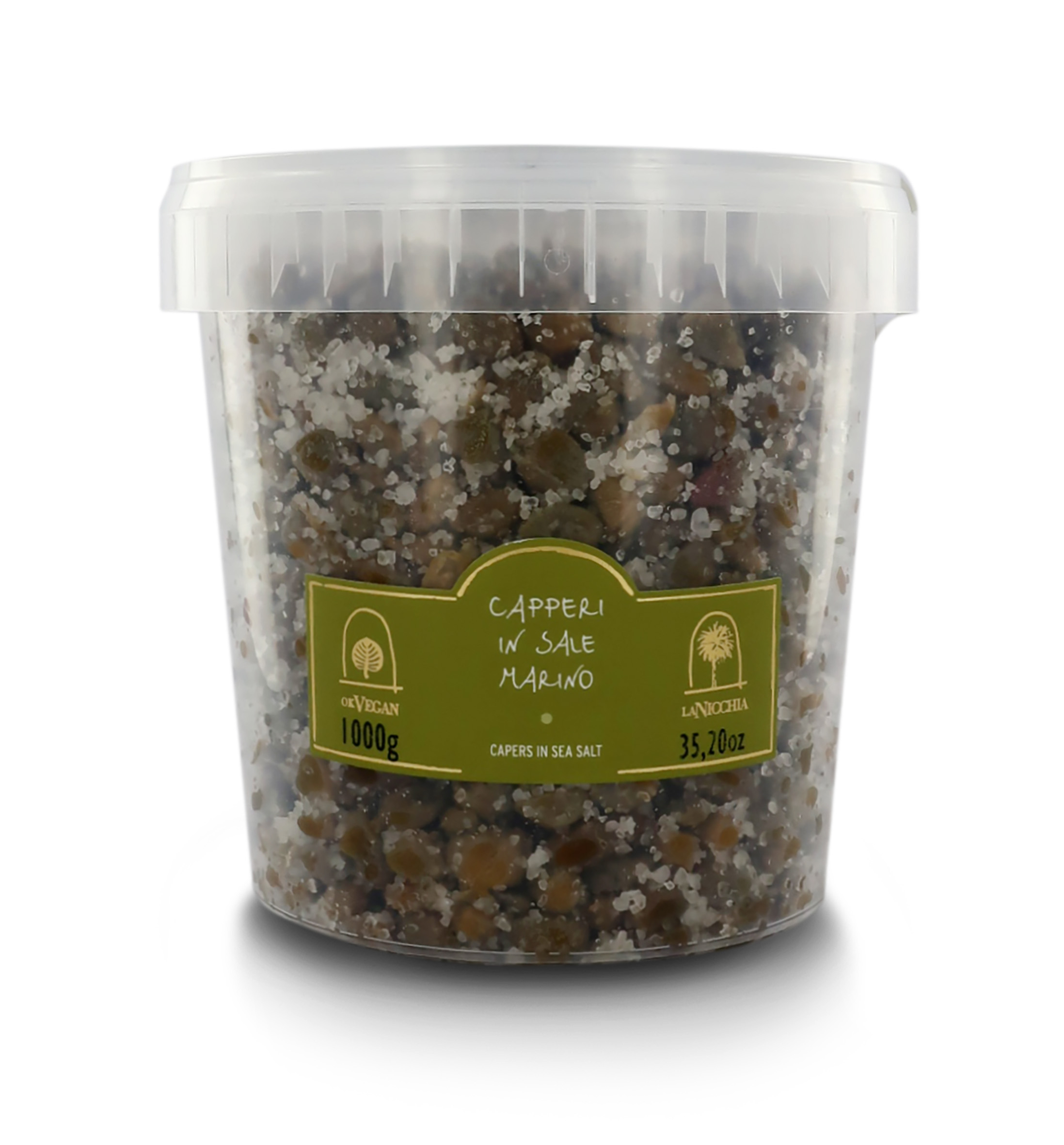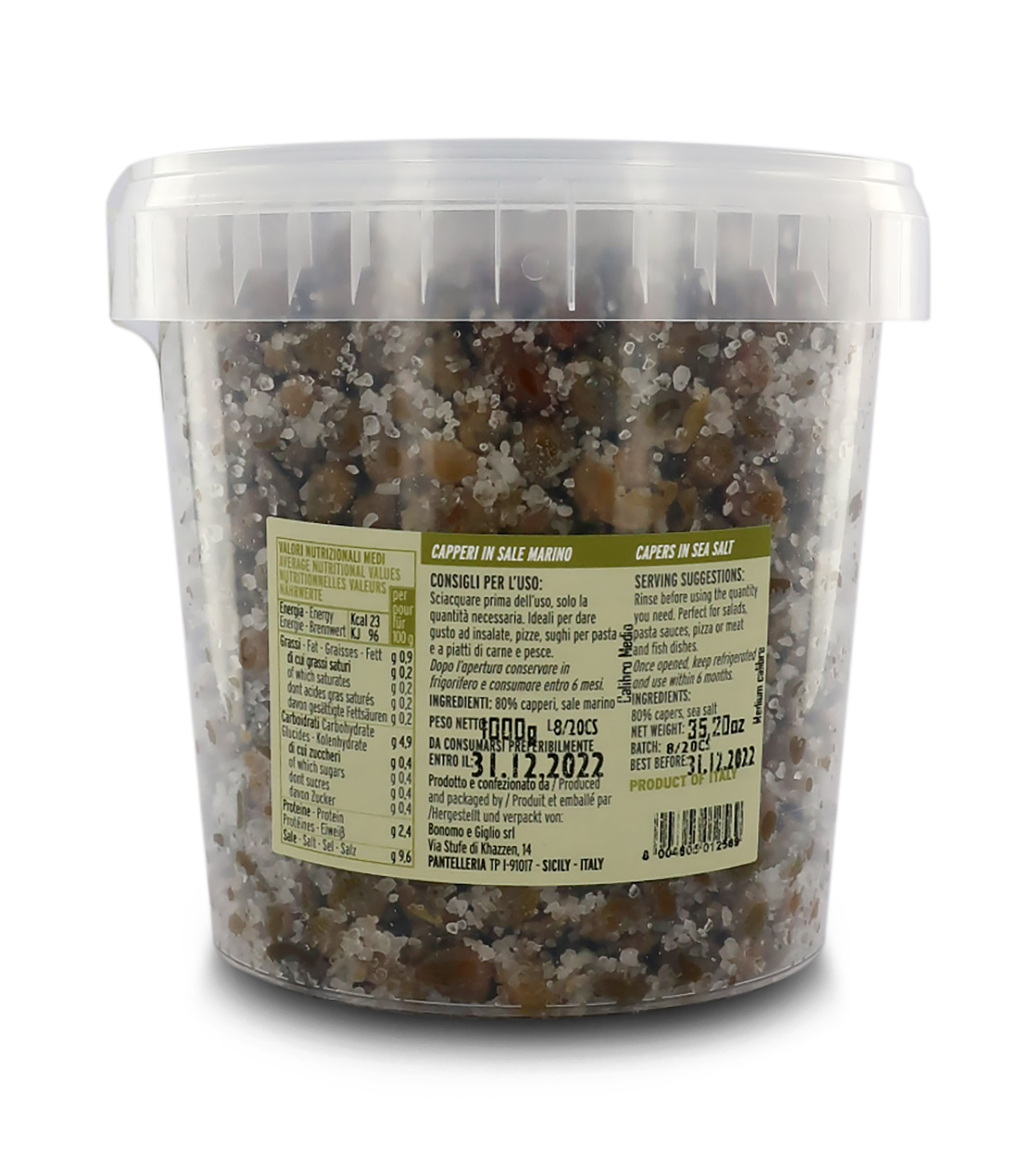 Capperi di Sicilia selezionati, calibro medio, conservati in sale marino. I capperi medi sono indicati sia per condire sughi di pomodoro o per realizzare creme e patè, sia per guarnire piatti di pesce e di carne rossa o bianca. Sciacquarli dal sale prima dell’uso.