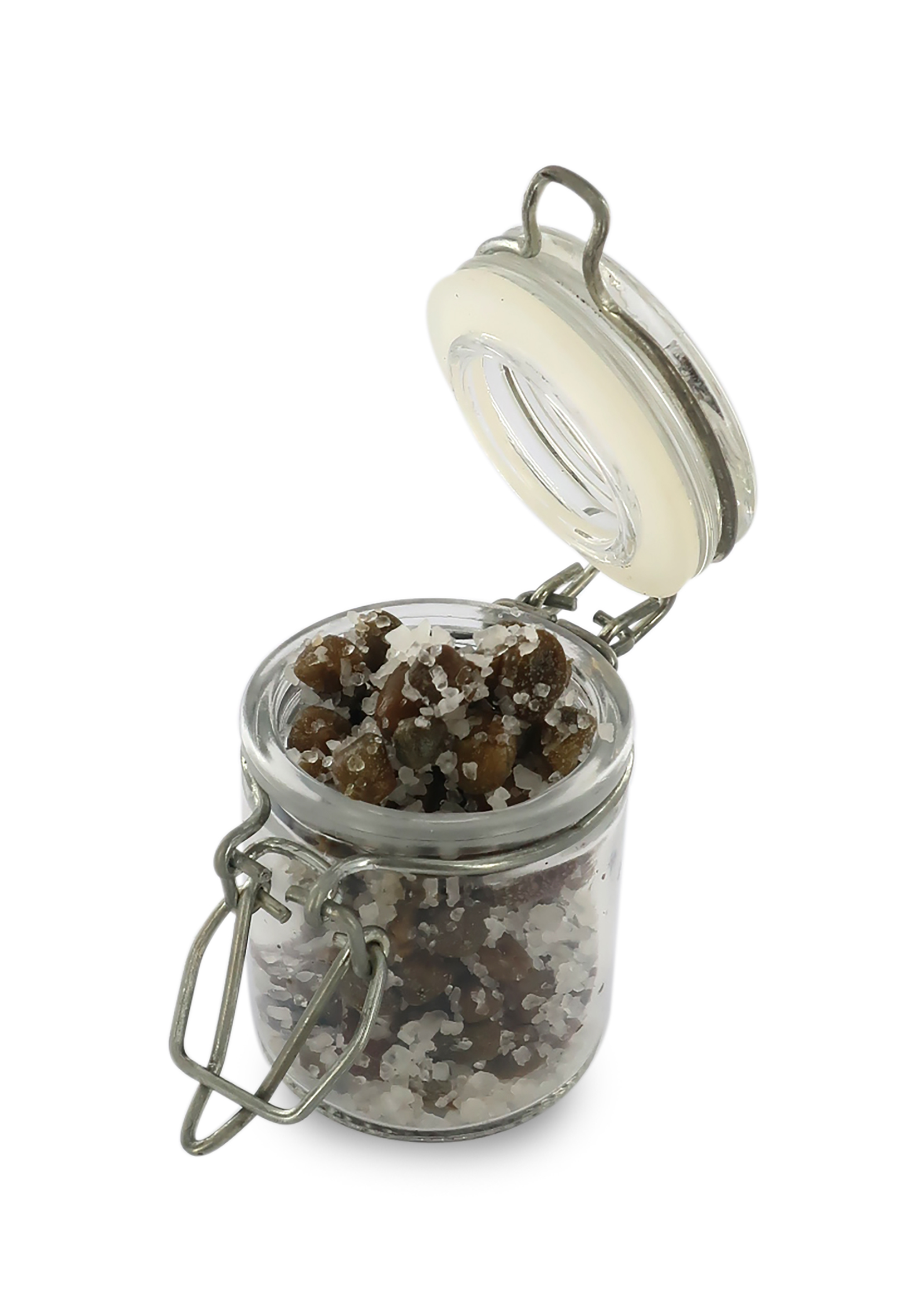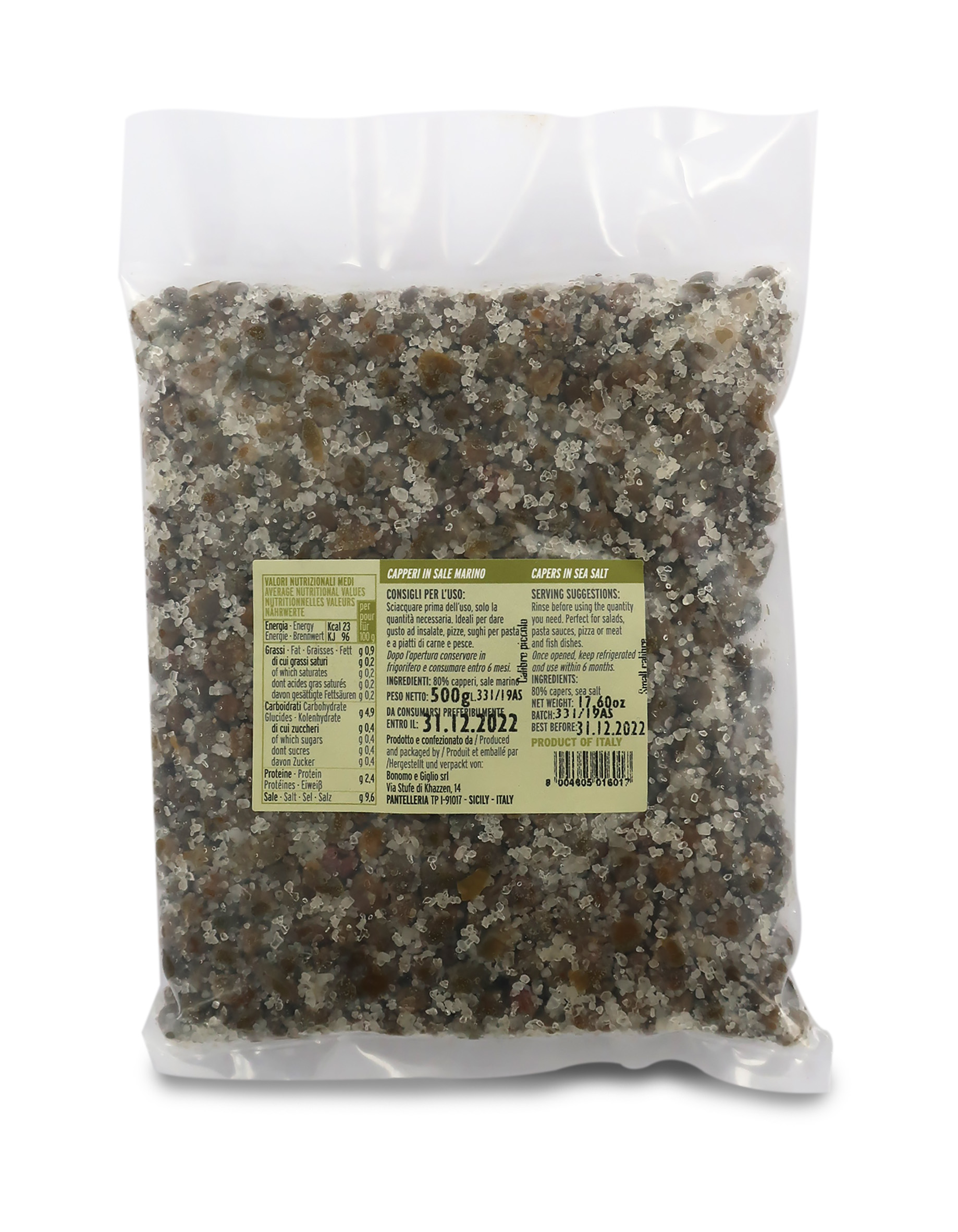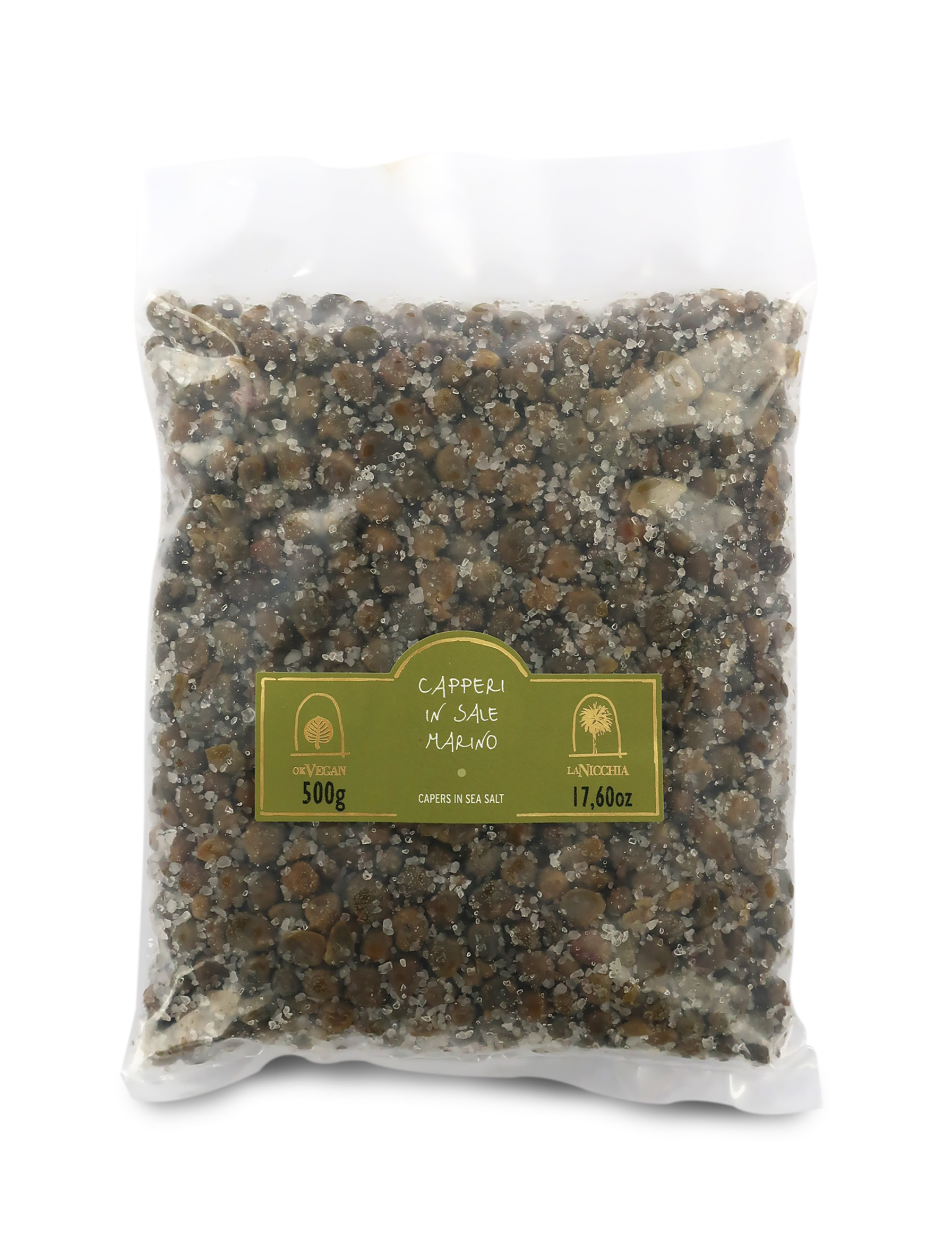 Capperi di Sicilia selezionati, calibro piccolo, conservati in sale marino. I capperi piccoli sono indicati per guarnire piatti di pesce e di carne rossa o bianca. Sciacquarli dal sale prima dell’uso.