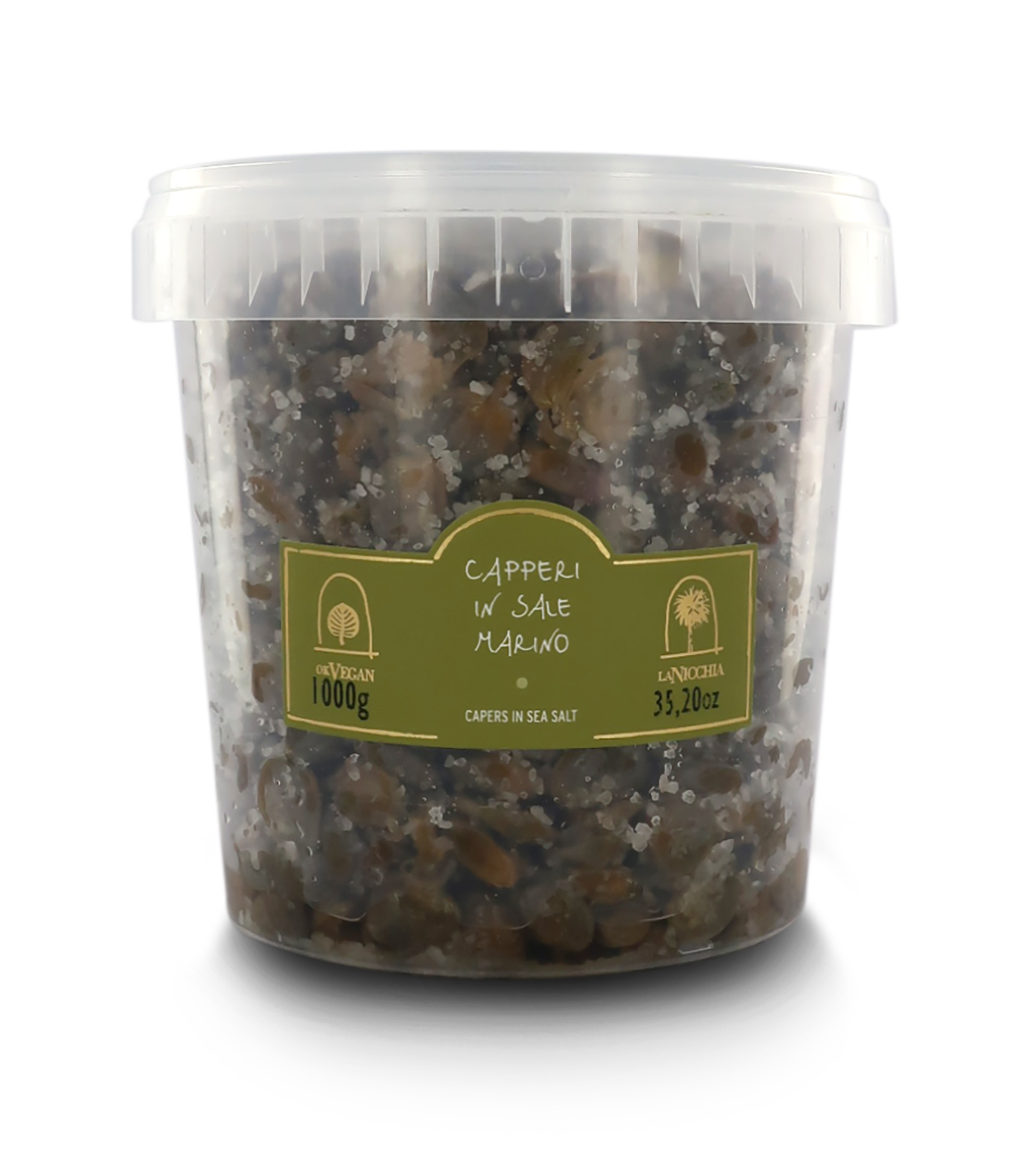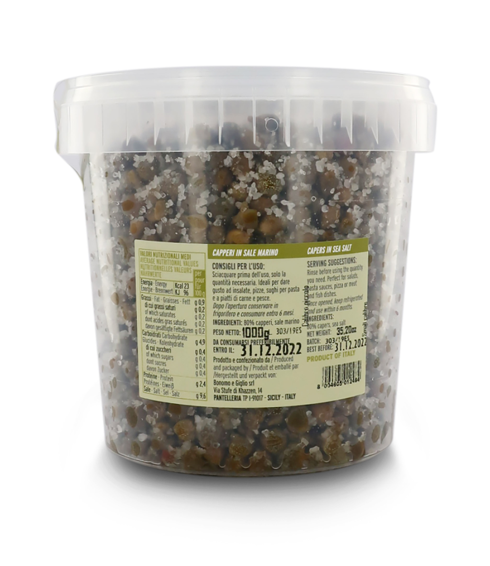 Capperi selezionati, calibro piccolo, conservati in sale marino. I capperi piccoli sono indicati per guarnire piatti di pesce e di carne rossa o bianca. Sciacquarli dal sale prima dell’uso.