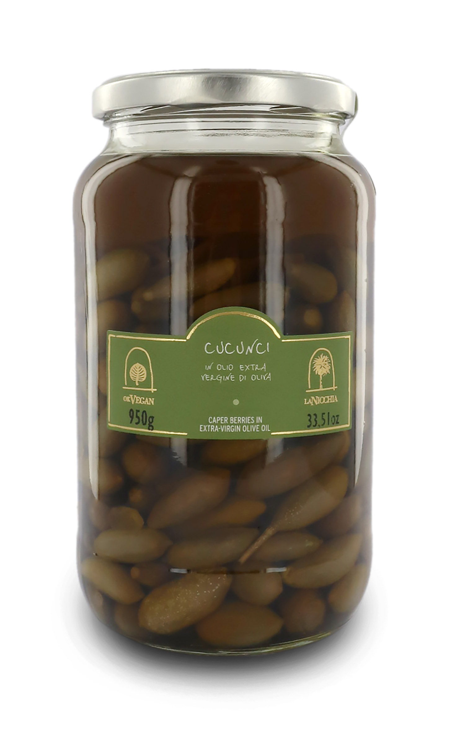 Cucunci (frutto del cappero di Pantelleria) sottolio, calibro medio. Il cappero classico non è altro che il bocciolo della pianta del cappero, non ancora aperto. I contadini di Pantelleria, non cogliendolo, lasciano sbocciare il fiore, ottenendo poi questo frutto dalla forma allungata, "a goccia", tradizionalmente conservato sotto sale o sottolio per essere consumato come sfizioso aperitivo.