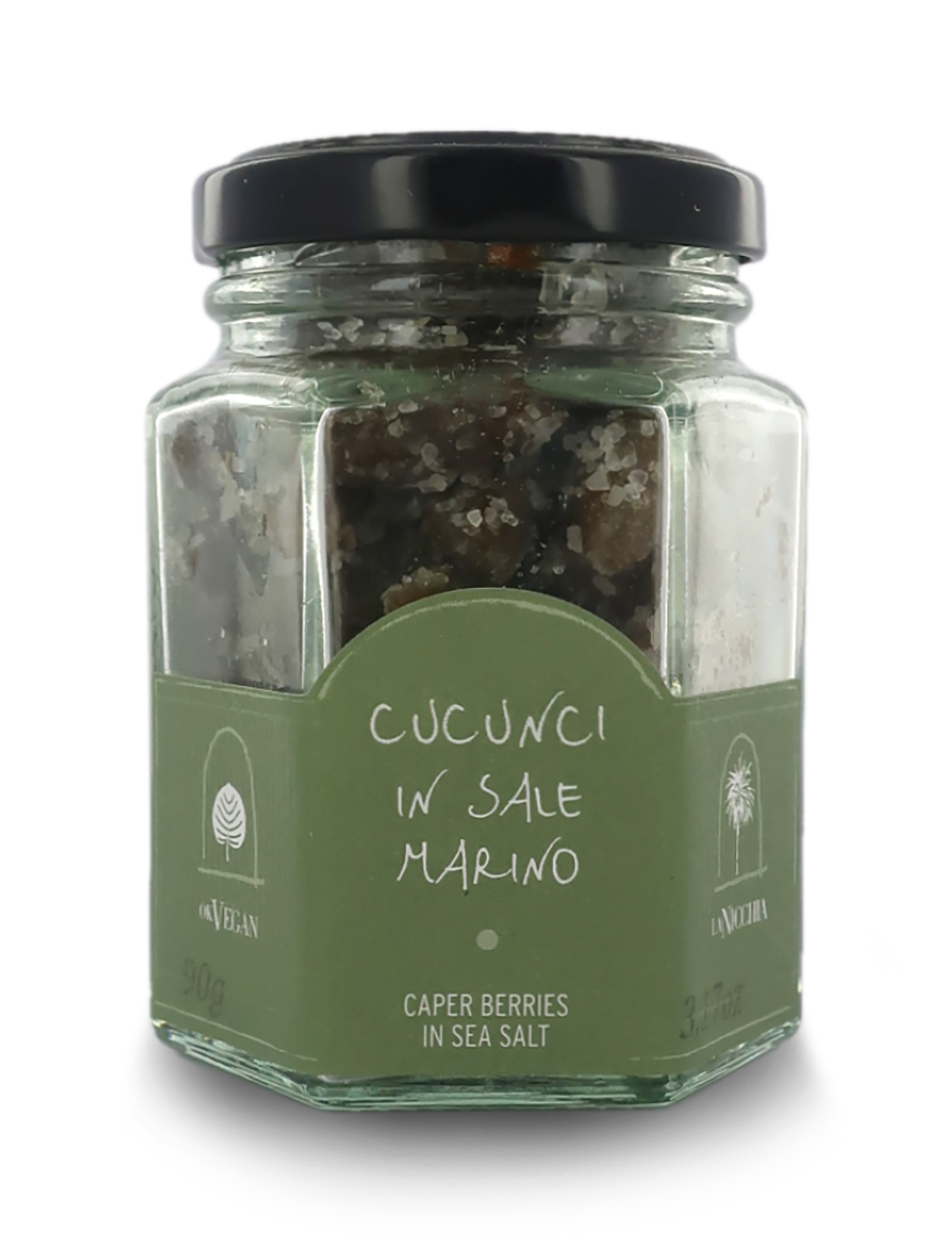 Cucunci (frutto del cappero di Pantelleria) sotto sale, calibro medio. Il cappero classico non è altro che il bocciolo della pianta del cappero, non ancora aperto. I contadini di Pantelleria, non cogliendolo, lasciano sbocciare il fiore, ottenendo poi questo frutto dalla forma allungata, "a goccia", tradizionalmente conservato sotto sale o sottolio per essere consumato come sfizioso aperitivo.