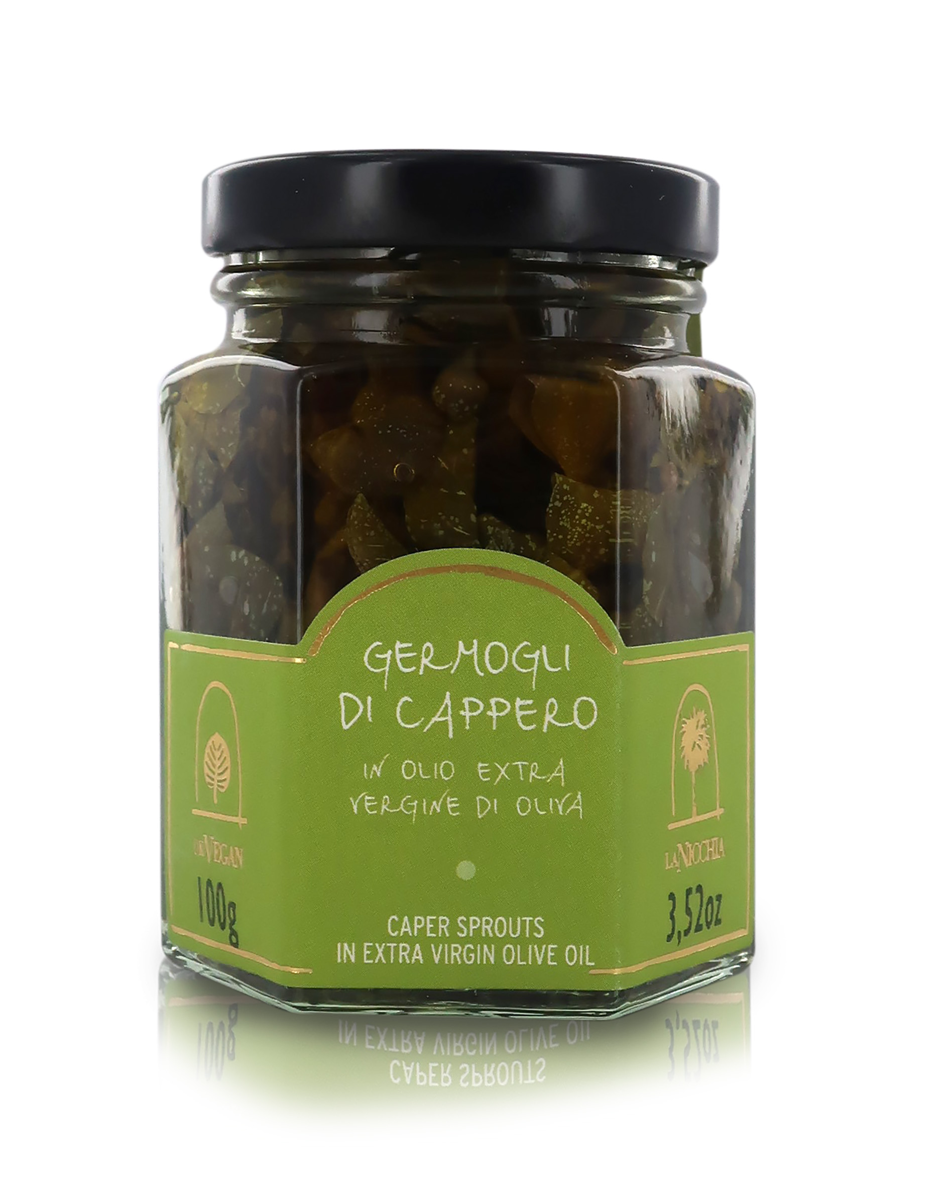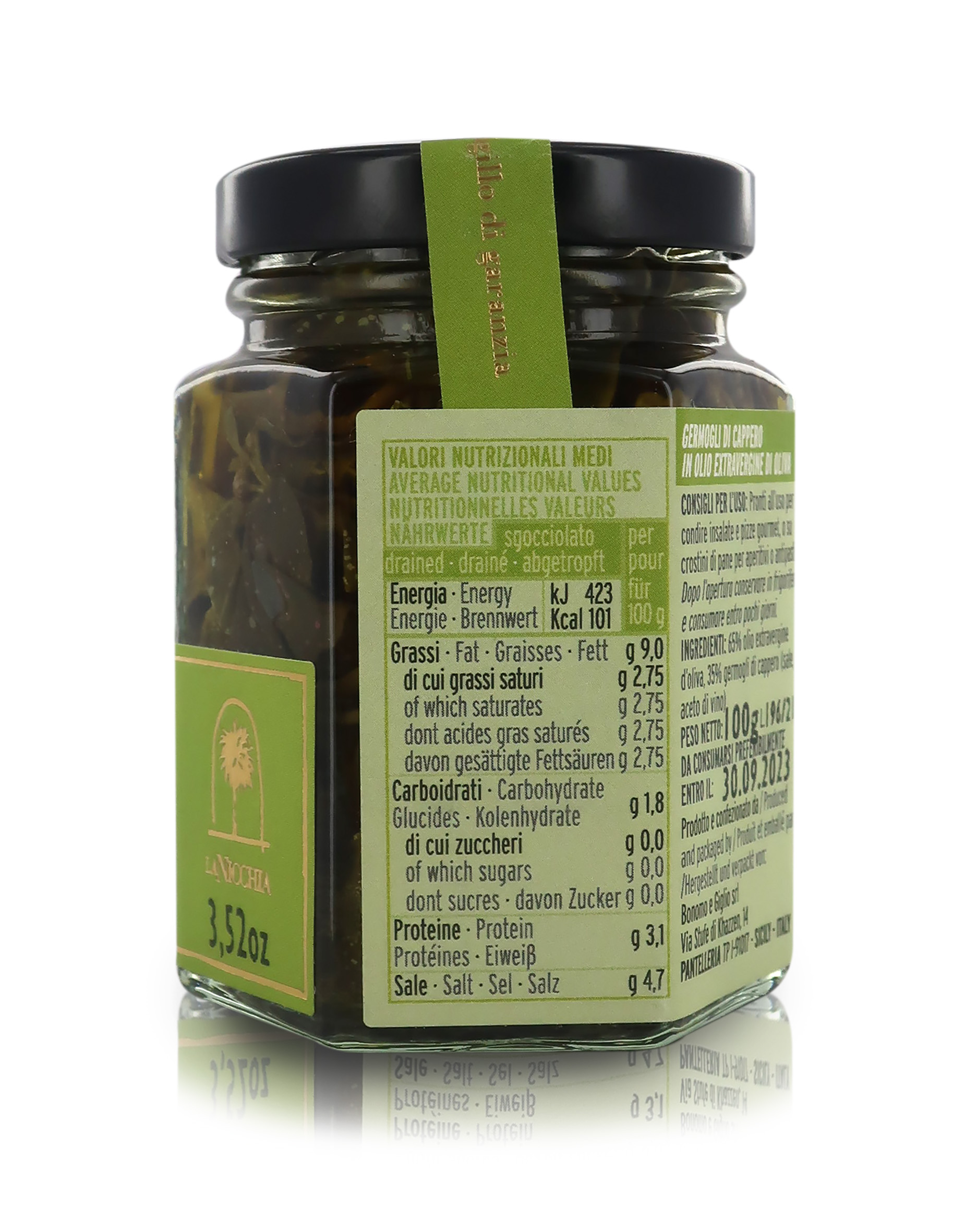 Ingredienti: 65% olio extravergine d’oliva, 35% germogli di cappero (sale, aceto di vino).